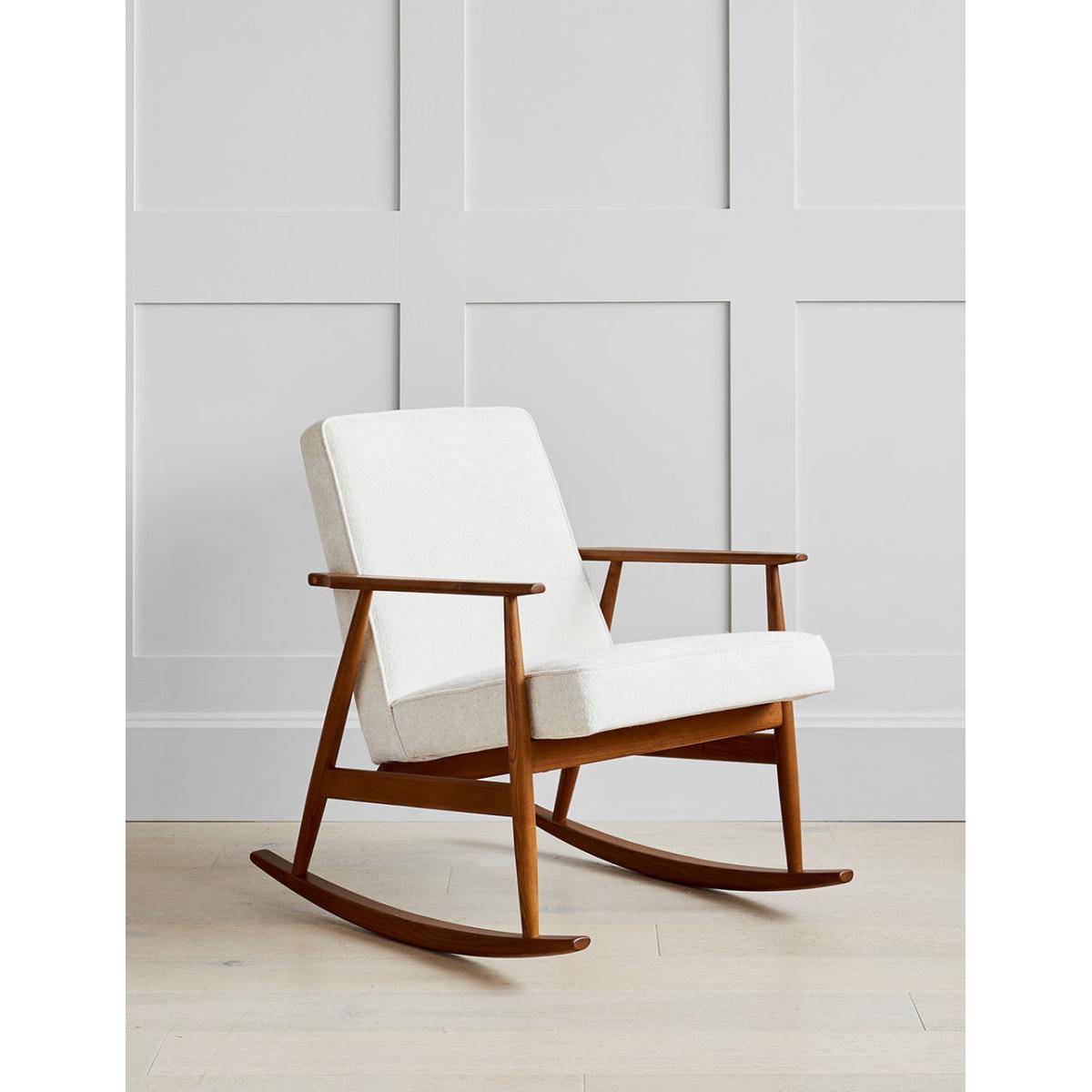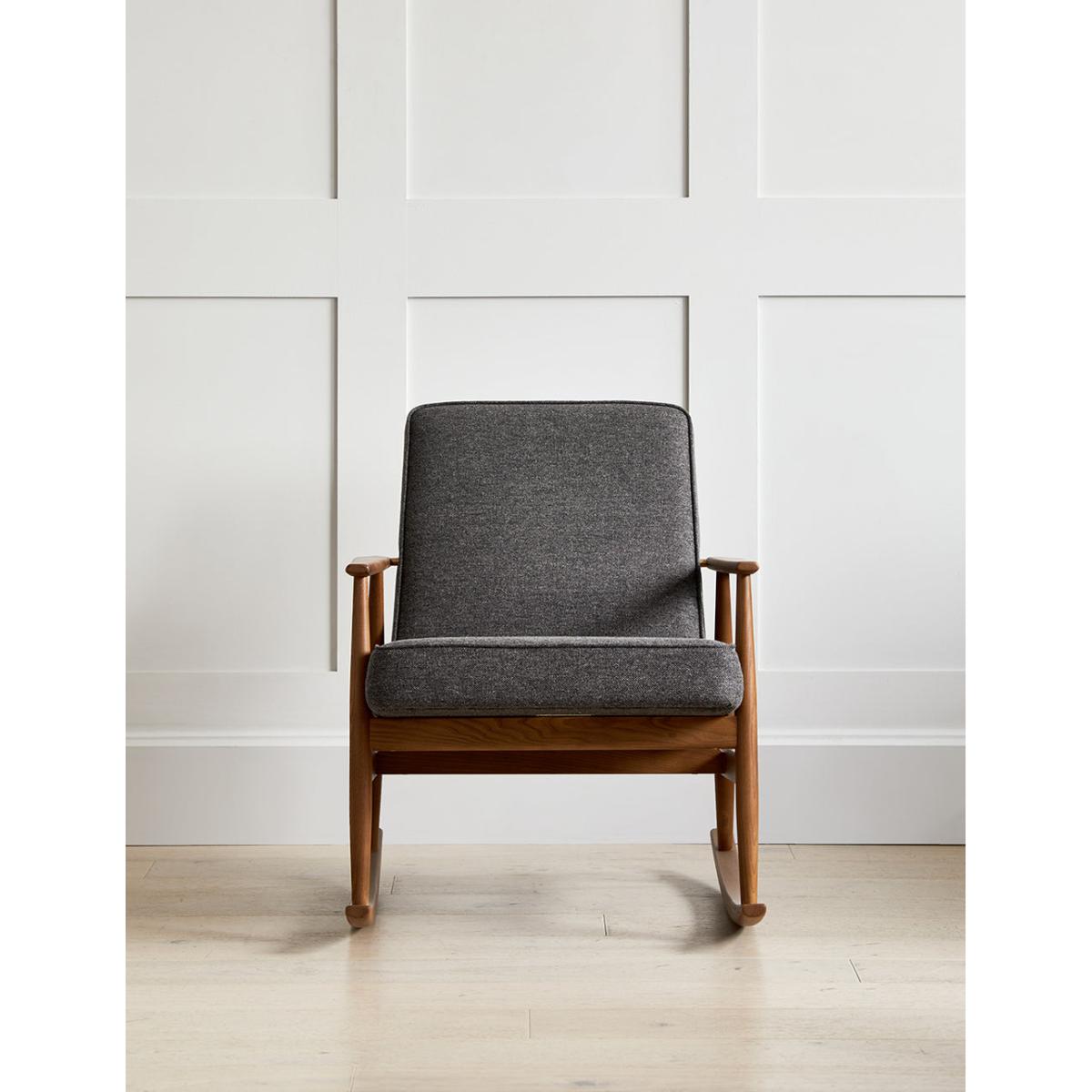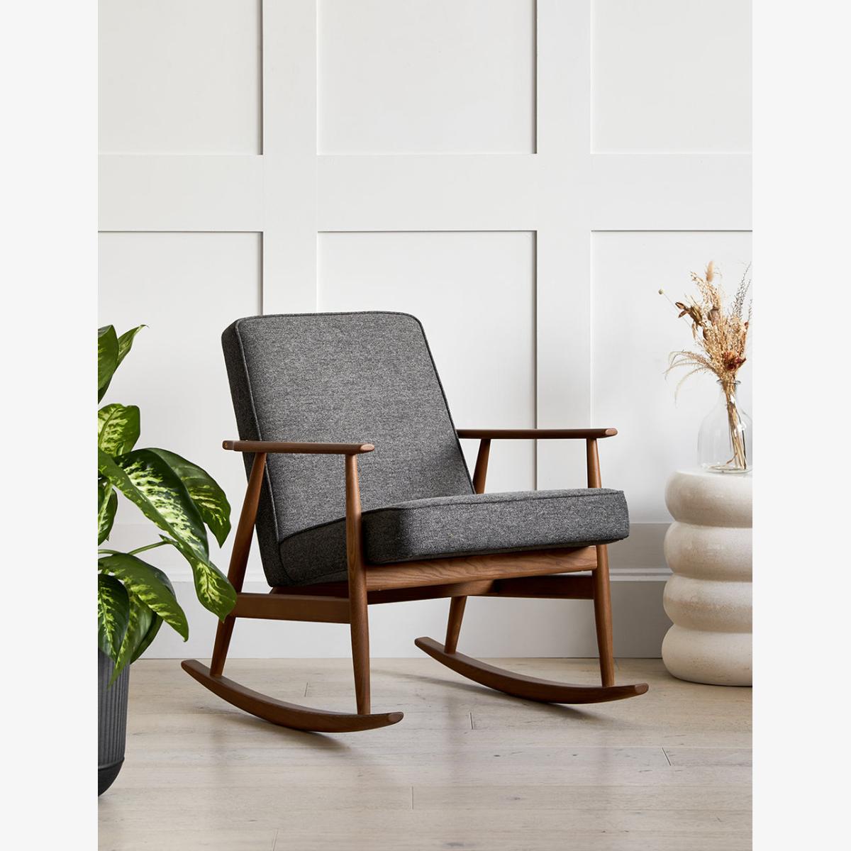 Introducing the Fox Rocking Chair, a contemporary addition to the 366 Concept's revival of Polish Mid-Century design icons. Based on the classic 300-190 Fox Easy Chair designed by H.Lis, this sleek and stylish rocking chair is crafted with a sleek ash frame and a comfortable cushioned seat that embodies the simplicity and elegance of Scandinavian vintage forms. Whether you're looking to complete a Mid-Century Modern aesthetic or add a statement piece to your interior, the Fox Rocking Chair is a versatile and timeless addition to any home. Pictured here in Wool Grey Black and Light Ash wood Based on the classic 300-190 Fox Easy Chair designed by H.Lis, this sleek and stylish rocking chair is crafted with a sleek ash frame and a comfortable cushioned seat.