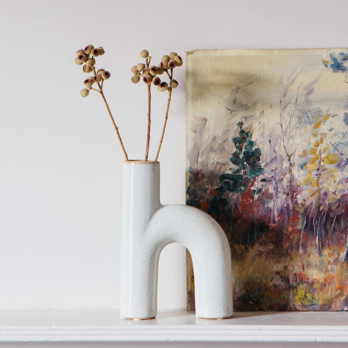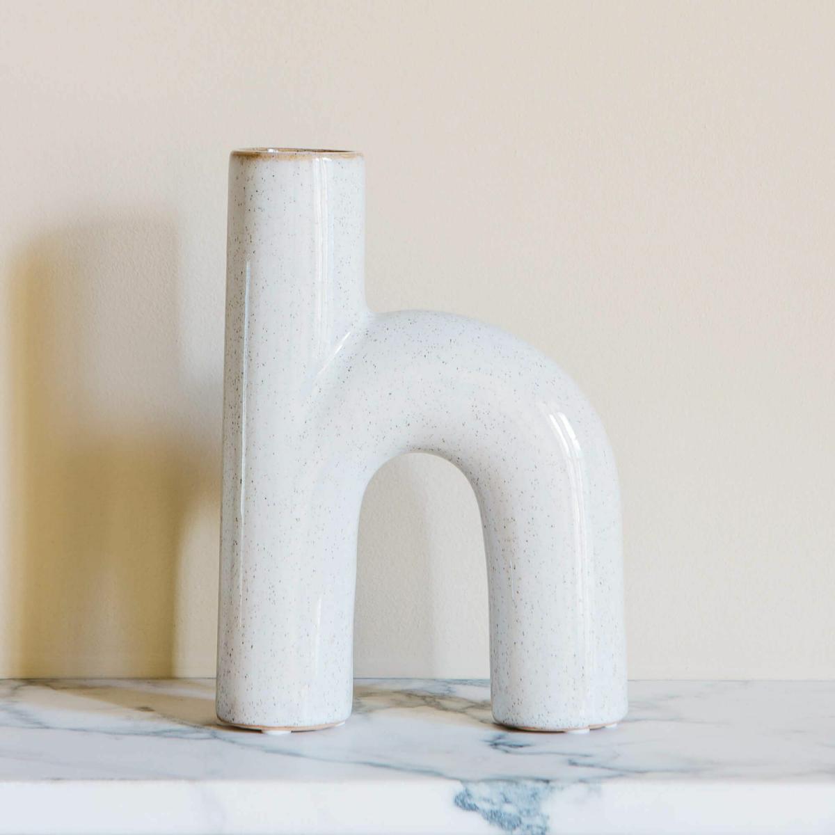 A distinctive h-shaped stone vase in fresh white, fill with fine dried flowers or delicate blossoms to brighten up your hallway or bedside. H19 x W4. 5 x L13cm. Made of stoneware. This product is made from natural materials so the colour and finish will vary.