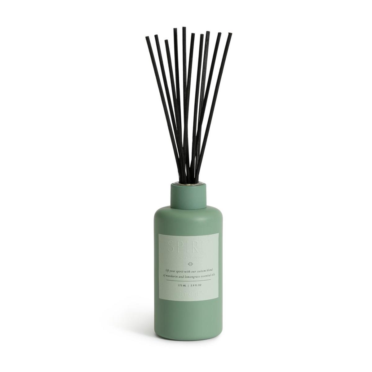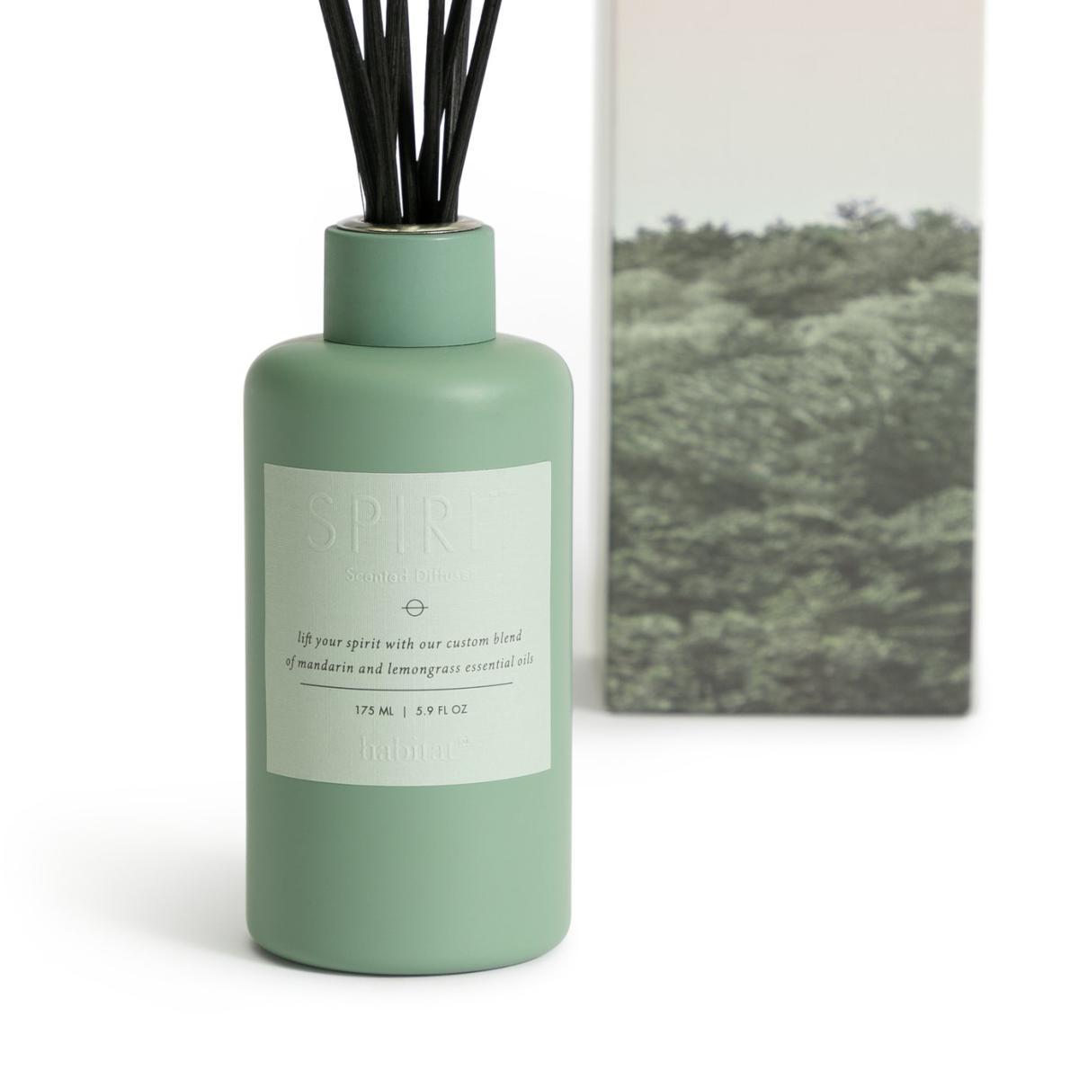 Awaken the spirit. Our Habitat scented diffuser uplifts and relaxes with the gentle aromas of mandarin and lemongrass. Pop this elegant green glass diffuser on the mantle and let the rejuvenating fragrance float throughout your home. Striking black rattan reeds offer an ultra-modern look. Time to relax, it's zen o'clock.