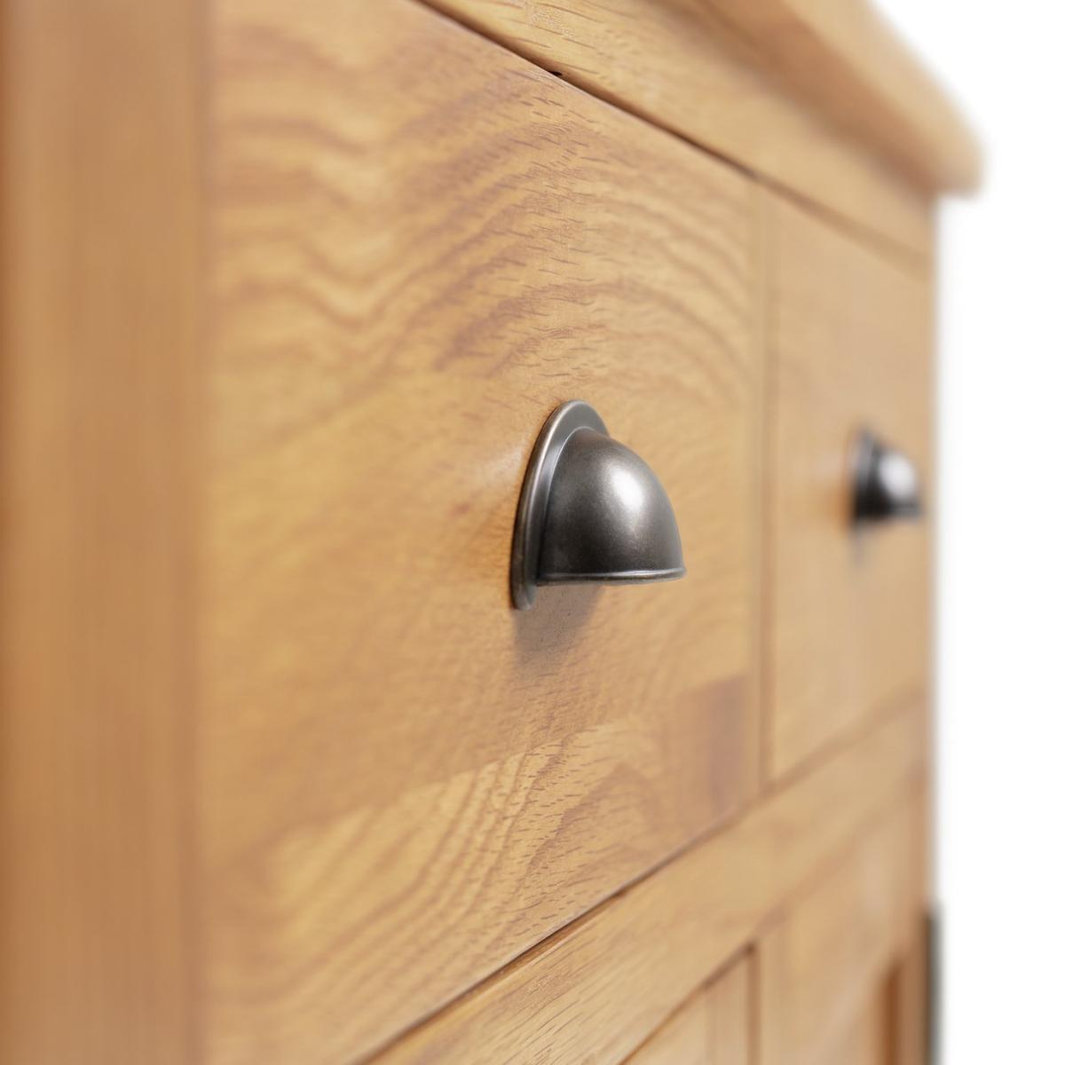 I love this piece for its warm, natural oak finish, which brings a cozy yet timeless feel to any space. It's versatile enough to work well in both contemporary and traditional interiors, especially in living rooms, dining rooms, or even as a hallway storage solution. Practical styling tips include pairing it with neutral tones for a minimalist look, or adding colourful or textured accessories on top to create visual interest. Its combination of drawers and cabinets makes it both functional and stylish, offering ample storage while maintaining a streamlined appearance. Keep accessories simple and understated to let the woodgrain speak for itself, or layer with vintage finds for a more eclectic vibe.