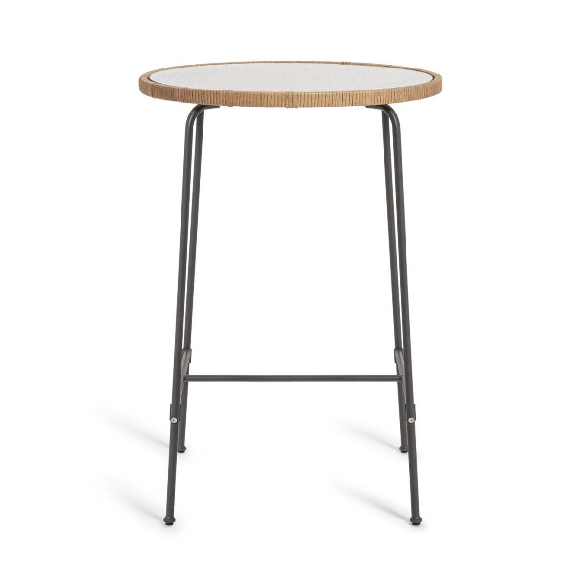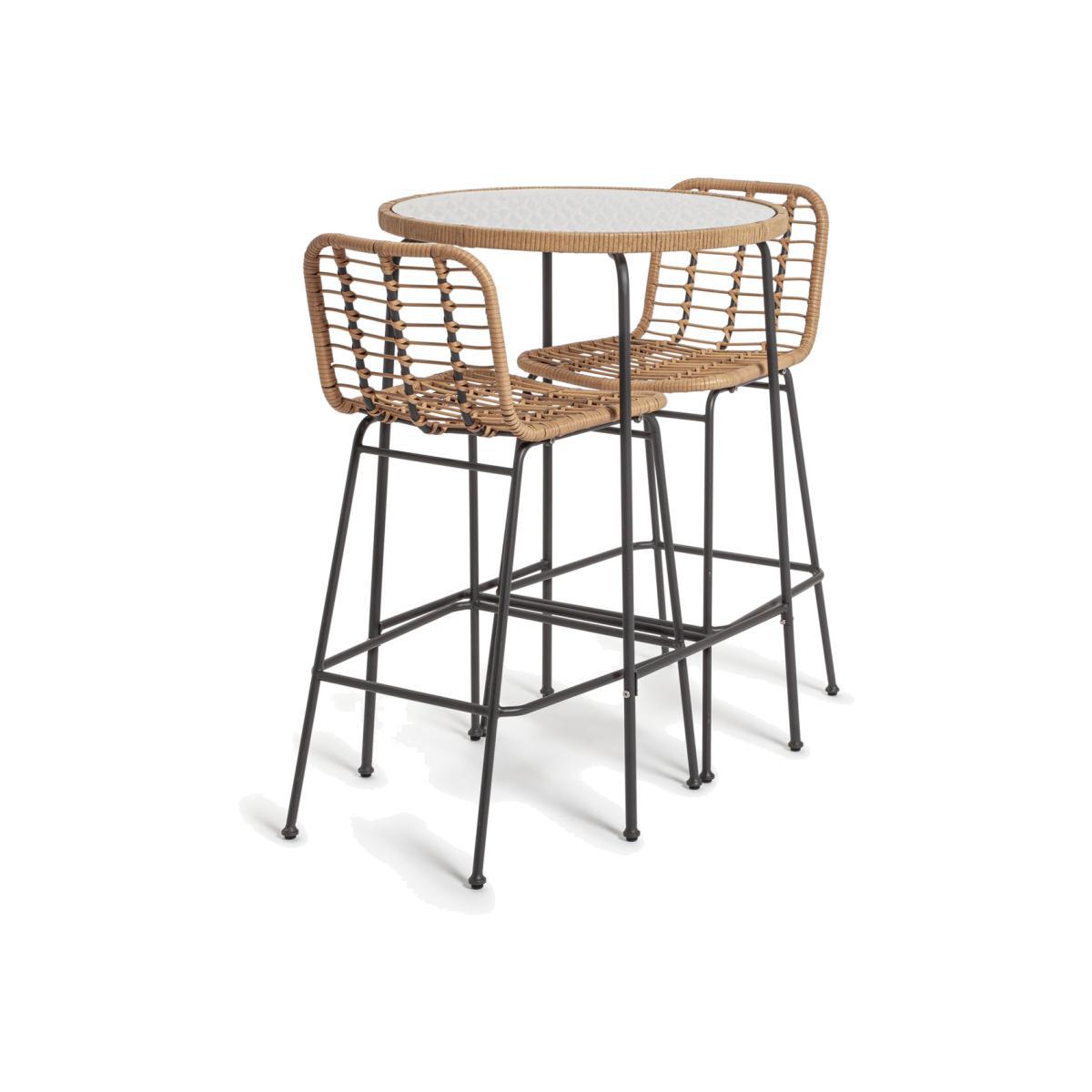 Create a bistro zone on your own patio with our chic bar set. This 3-piece combination is striking and just perfect as we enter the warmer months. Classically styled with a rattan-edged, round glass table top and typical thigh-high bar chairs it's great for brunch, lunch or evening cocktails. Comfortable, stylish and fun.