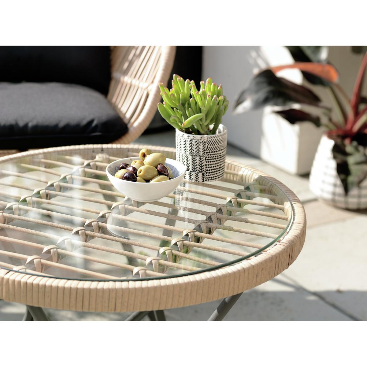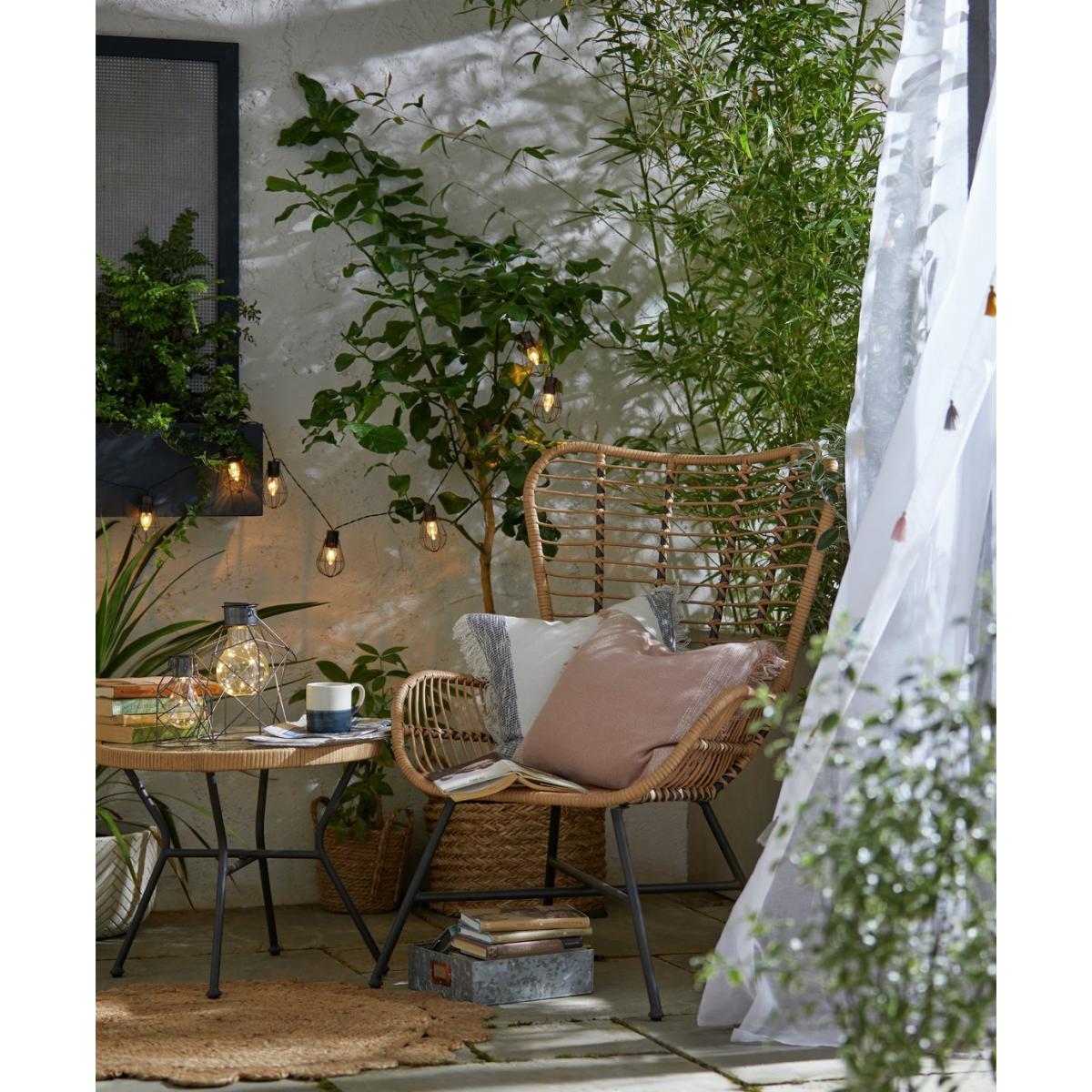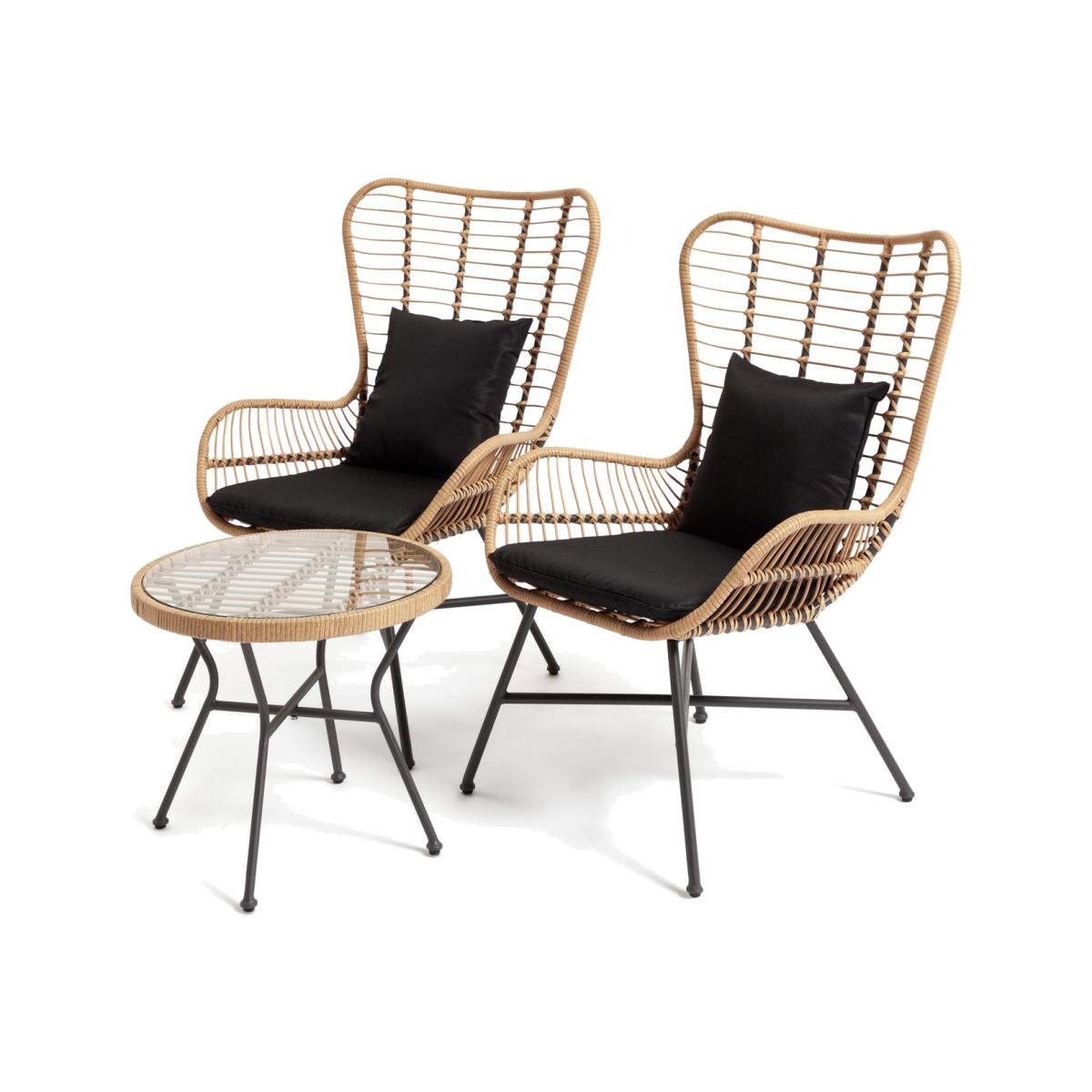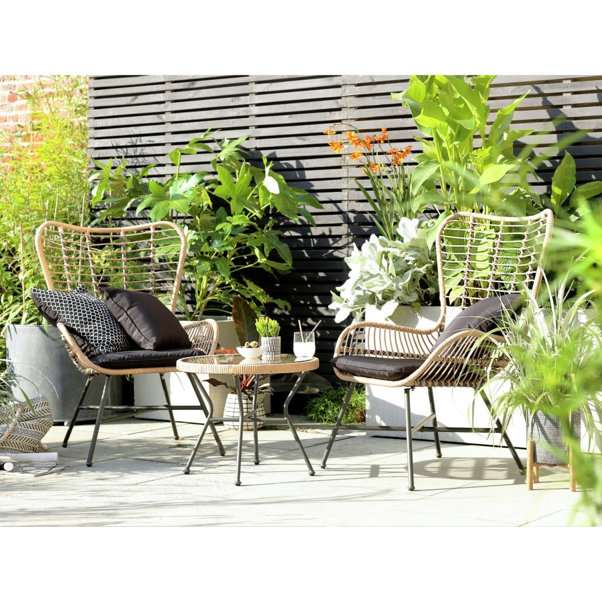 Charming, chic and oh so curvy. Claim your favourite corner of the patio or balcony for this Boho inspired bistro set. You'll be curled up for hours. The natural rattan effect armchairs offer ergonomic comfort, and contrast beautifully with the striking metal black legs. Designer black cushions finish the look. Stunning meets practical. The glass topped coffee table makes it easy to wipe and all covers are machine washable so they clean up nicely too. Morning coffee, afternoon tea, prosecco evenings? Any excuse!