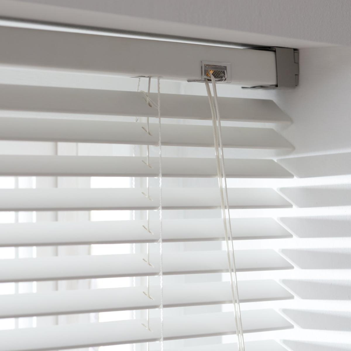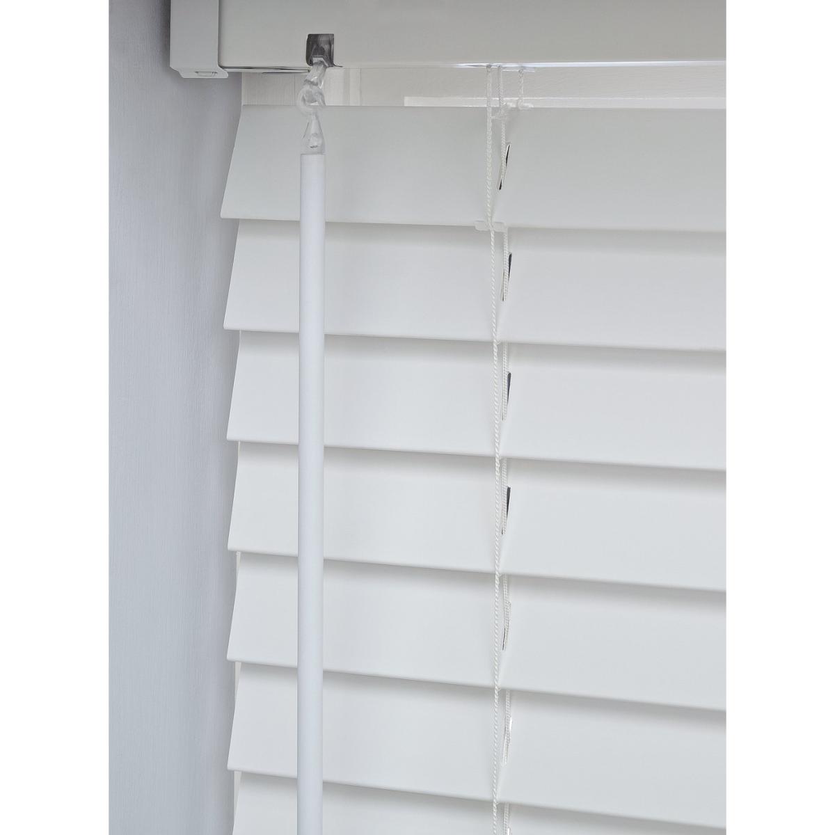 A slatted white wood blind that can handle moisture? Wooden that be nice. This faux wood Venetian blind has the natural beauty of the real thing, minus the drawbacks. You can give your bathroom or kitchen a fresh new look that'll last. If things get steamy, just swipe with a wipe. No damage done. And with slates you can let in as much or as little light as you want. Blinding. The slates are removable, so it's a doddle to trim and get the length just right. Comes with all the bits you need for an easy fix. This white wipeable blind is kid friendly too. It has a child safety P clip. In other words, little fingers won't get caught up in the cord. Features: Moisture resistant blind. Faux wood. Removable slats. Features tilt control. Dimensions: Size W60, drop 160cm / W24, 63in. 69 slats in pack. Slat width: 2.5cm. Length can be easily trimmed to size. General information: Tested and safe to the 2014 blind safety standards BS EN 13120. Fits inside or outside window recess or to wall. Suitable for kitchens and bathrooms. This blind comes with a child safety cleat. Includes fixtures; fittings and instructions. Wipe clean.