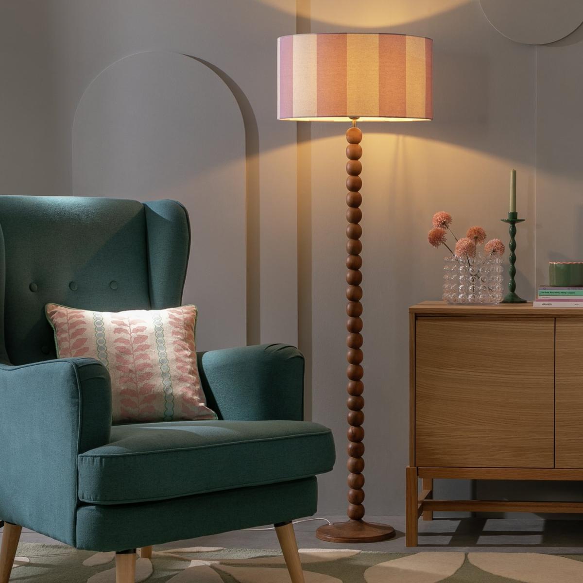 I love this drum shade for its soft lavender tones and subtle stripe pattern, which add a relaxed yet refined touch to any space. It works particularly well in contemporary or eclectic interiors, providing a gentle pop of colour that’s not overpowering. To style it effectively, consider pairing it with light, neutral walls or pastel accents to highlight the lilac hues. Practical tip: use it on a table lamp in a reading nook or as a statement ceiling pendant in a cosy living area. Its size and pattern lend themselves to layered textures and muted colour palettes, making it perfect for creating a calming, stylish ambience.