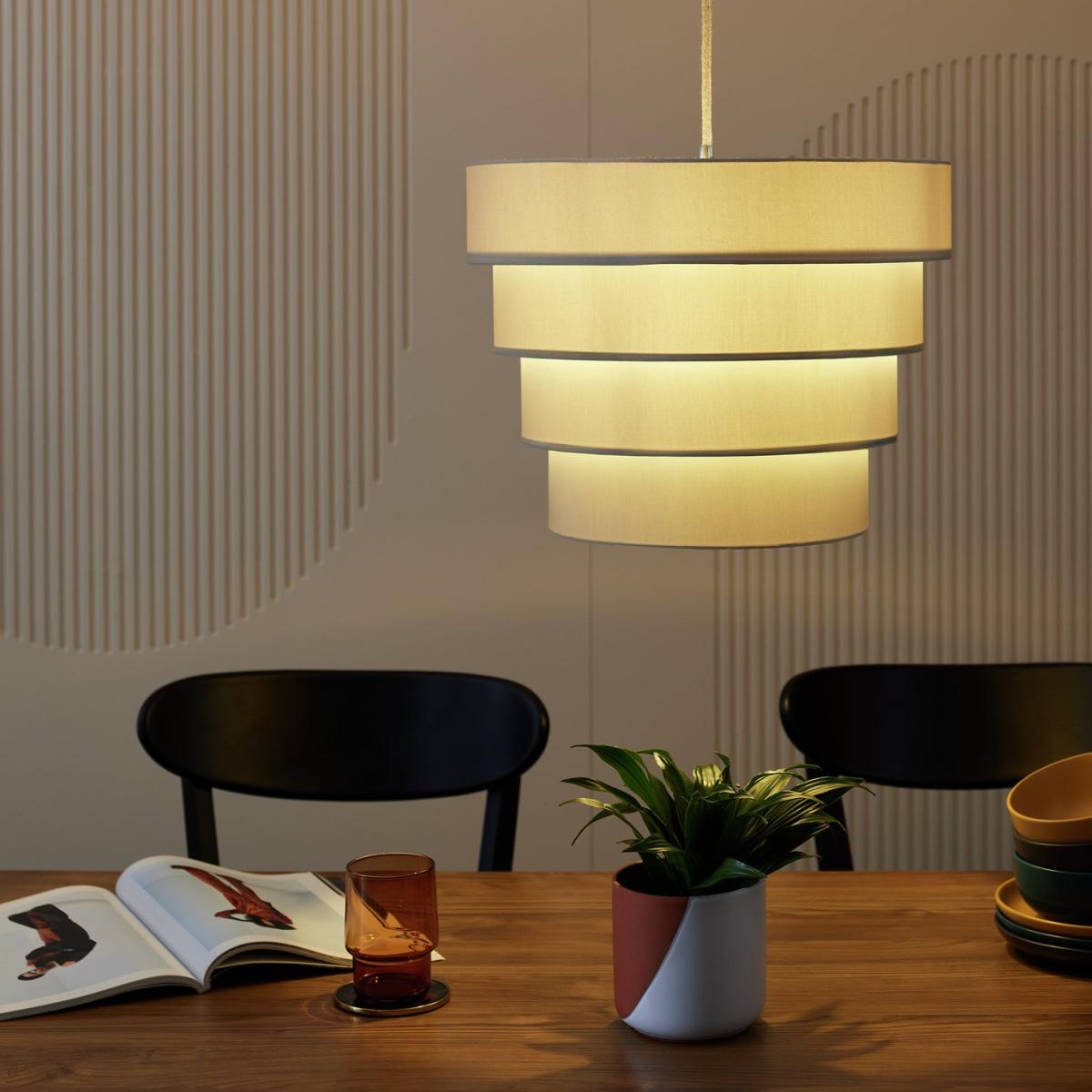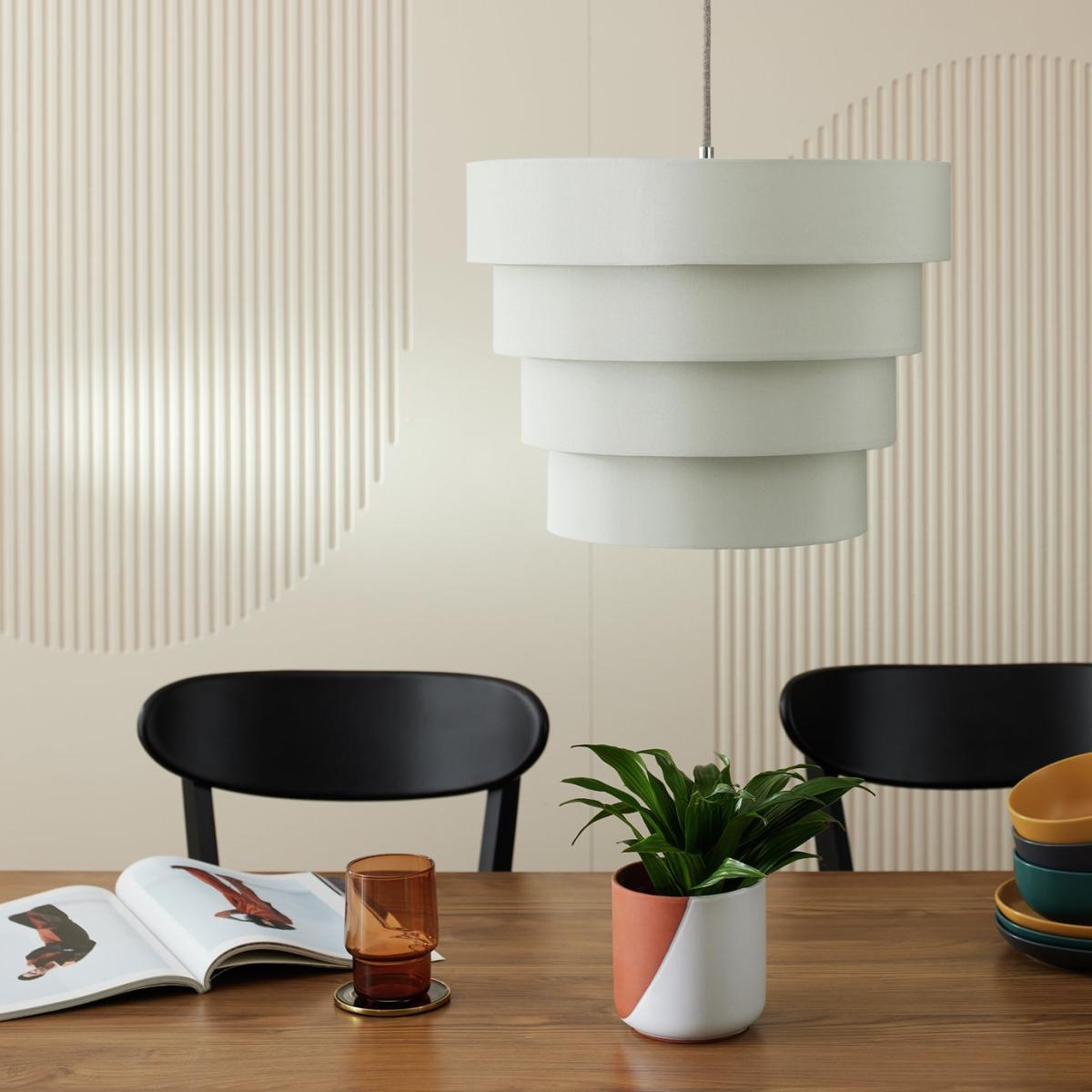 I love this grey stacked lamp shade for its modern yet versatile look, making it a great addition in a range of interiors from contemporary to minimalist schemes. Its tiered design adds subtle visual interest without overwhelming the space, while the neutral grey keeps it easy to coordinate with existing colour palettes. Practical styling tips include pairing it with a simple metal or matte black lamp base for a sleek finish, or mixing it with natural materials like wood or rattan to add warmth. It works especially well in living rooms, bedrooms, or even hallways, where it can serve as a statement piece or blend seamlessly into your lighting scheme. Keep the space uncluttered around it to allow its sculptural form to take centre stage.