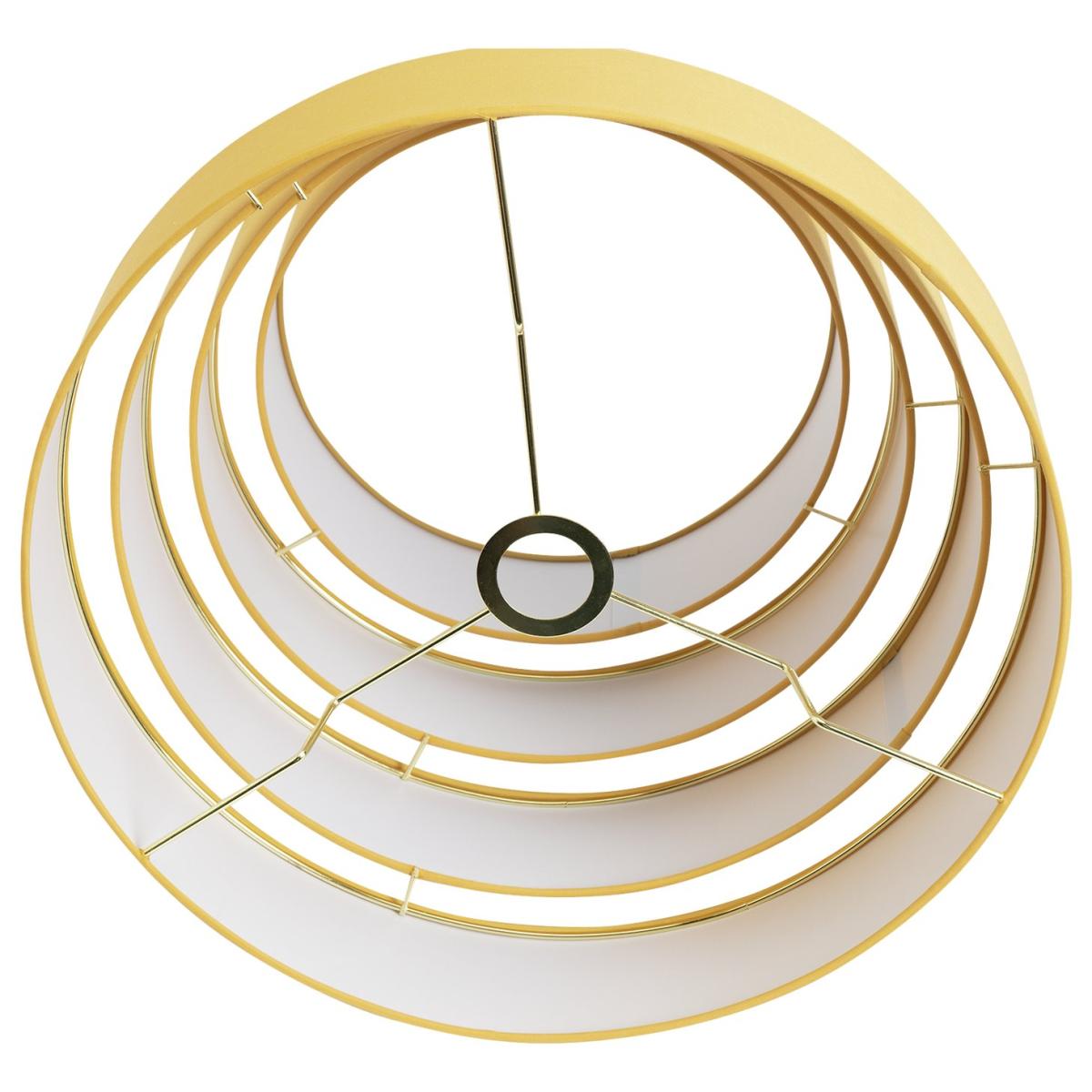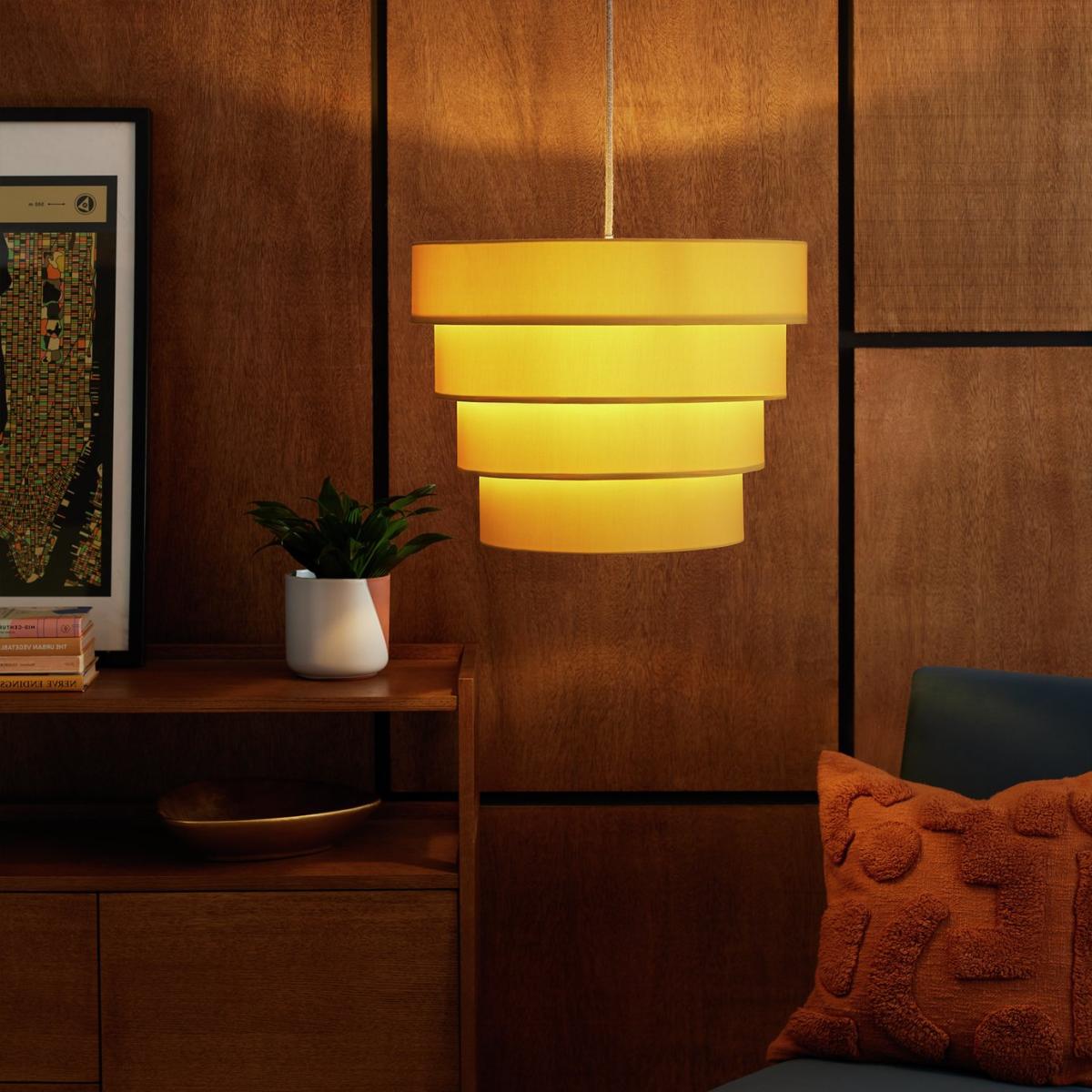 Ready to make a retro style statement? Go a shade mid-century with this striking 4-tier design. In bold mustard fabric it'll brighten up your ceiling to no end. The inside is smart too. With a quality brass plated frame. Easy to put up and simple to love. Made from polyester. Size H34cm, Diameter 45cm. Recommended maximum bulb wattage 15 watts. Minimal assembly. Easy fit shade. Manufacturer's 1 year guarantee.