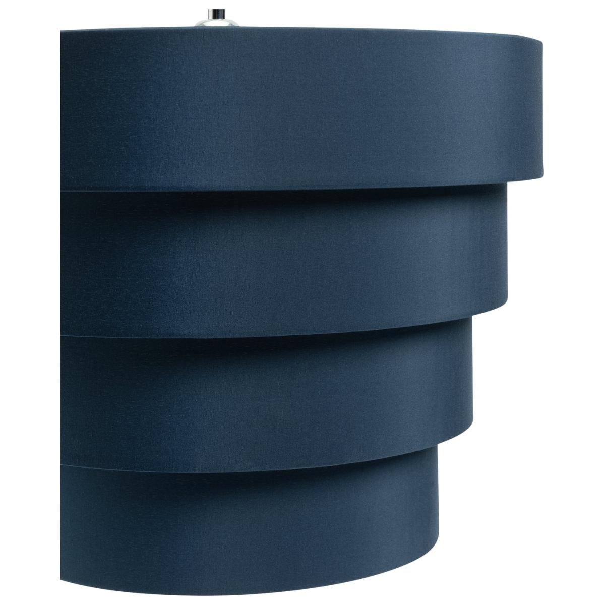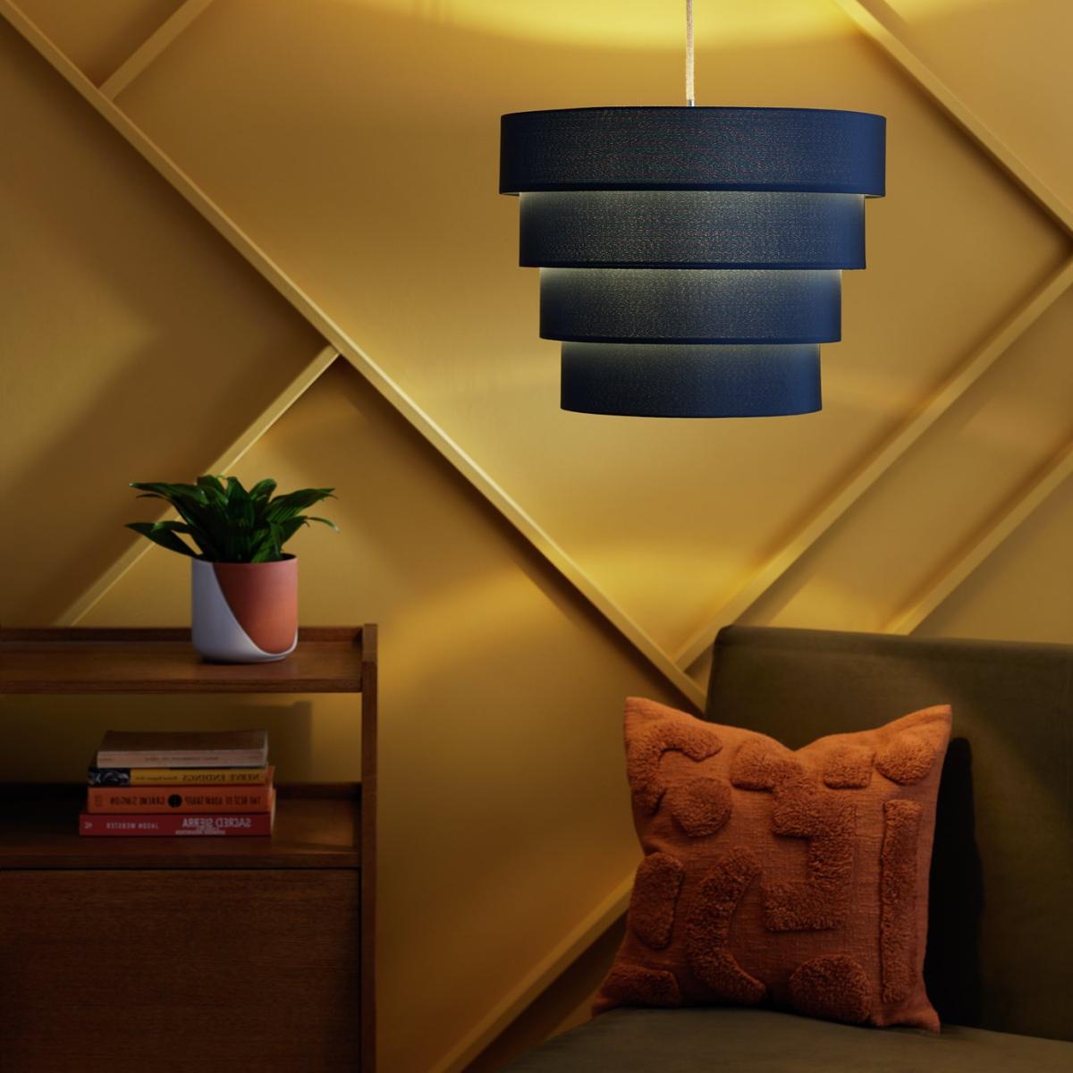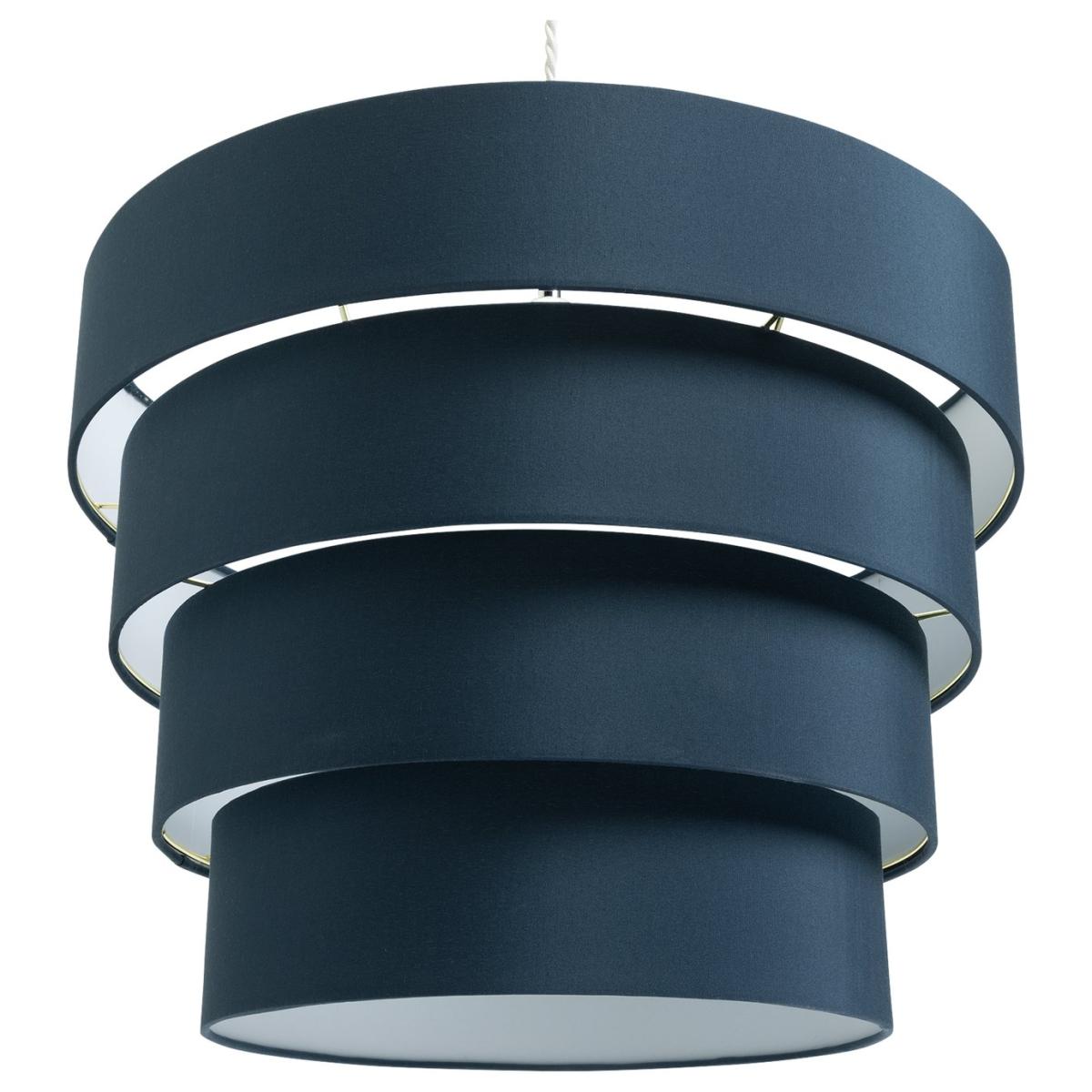 Ready to make a retro style statement? Go a shade mid-century with this striking 4-tier design. In rich navy fabric it'll brighten up your ceiling to no end. The inside is smart too. With a quality brass plated frame. Easy to put up and simple to love. Made from polyester. Size H34cm, Diameter 45cm. Recommended maximum bulb wattage 15 watts. Minimal assembly. Easy fit shade. Manufacturer's 1 year guarantee.