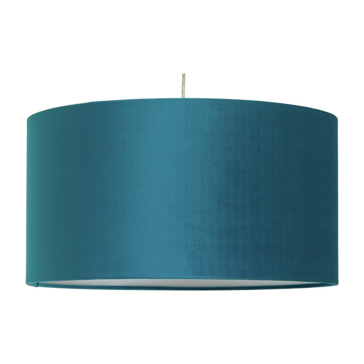 Lower the lights! This luxurious velvet shade in an elegant teal creates just the right mood for cosy evenings in. Sumptuous and indulgent, perfect if you're seeking a little Luxe sophistication. Our classic drum shape works three ways. Fit it as a ceiling shade in the lounge, to a lamp base by your bed or as a floor lamp to throw light on darker corners. Effortlessly diffuses the light to create a subtle, ambient glow. Heavenly!