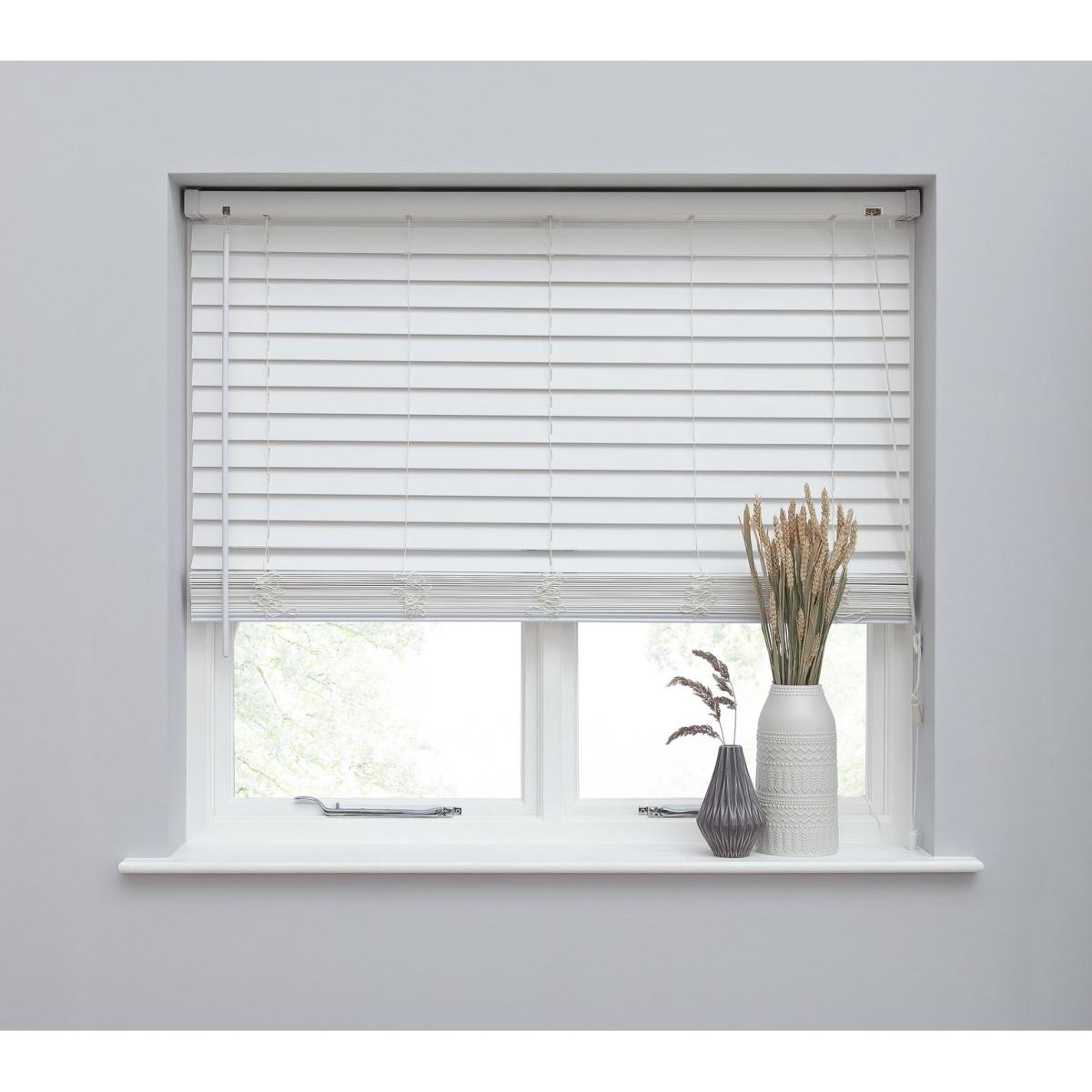 I love this faux wooden blind for its versatility and clean, modern look. The white finish makes it a perfect fit for minimalist, Scandi, or contemporary interiors, adding texture without cluttering the space. It works well in kitchens, bathrooms, or living areas where practicality and style are key, as it’s easy to maintain and resists moisture. For styling tips, pair it with neutral tones and natural fibres to create a calm environment, or add pops of colour through accessories to keep the look fresh. Its neutral aesthetic makes it a flexible choice for both classic and modern schemes.