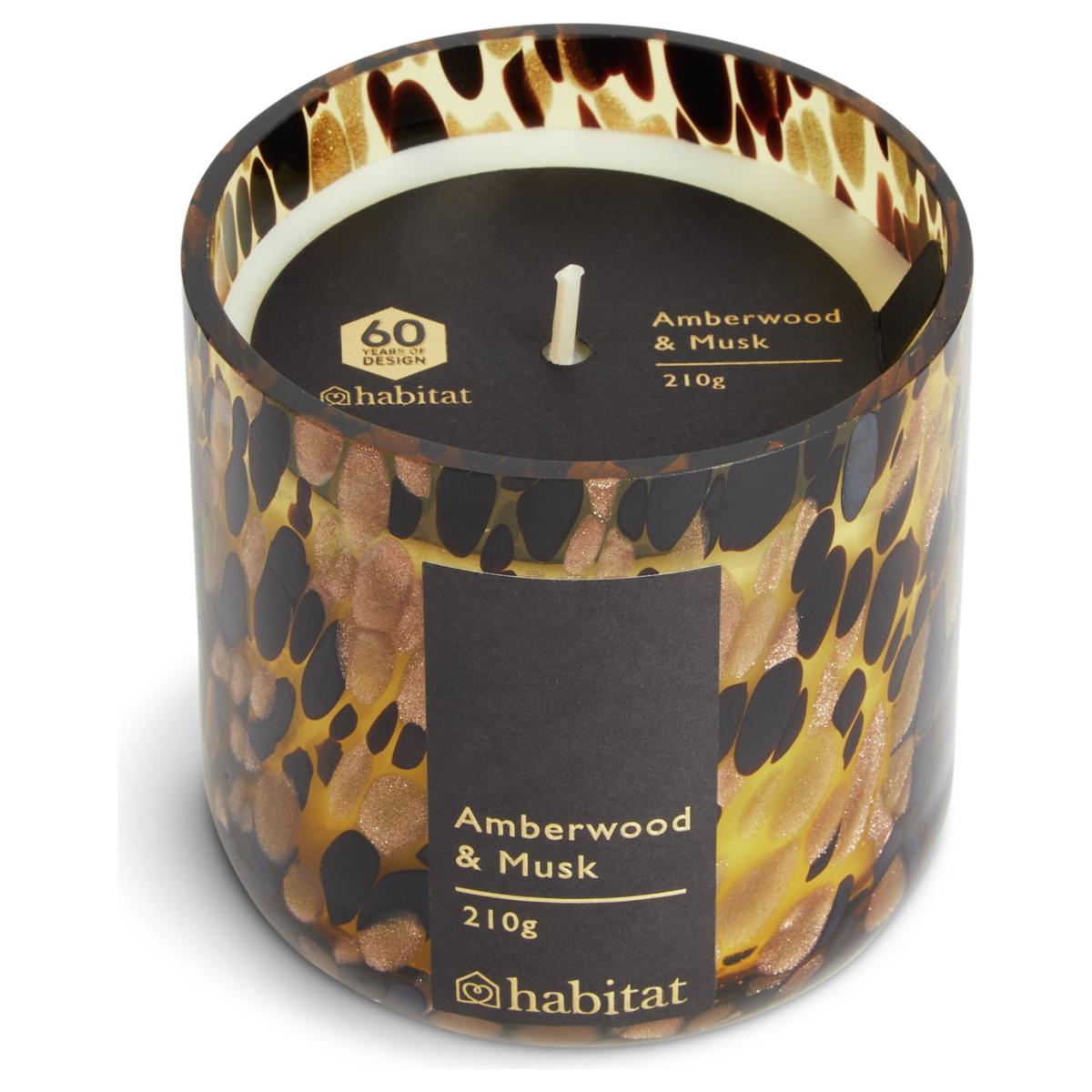 Indulge in the fragrant scent of Amber Wood and Musk where woody base notes mingle with powdery, seductive musk. Poured into the most beautiful confetti glass holder. A delightful 3 wick candle from our designer Tom Sullivan who likes to integrate charm and personality into his designs. A warm and inviting keepsake of a gift. The Habitat 60 Gold Edit has been specially commissioned in celebration of Habitat's 60 years of British design. A beautiful capsule collection that is unapologetically luxurious, wonderful for celebrations and year-round entertaining. Part of the Habitat 60 Gold Edit collection. Amberwood & Musk scent. Paraffin wax. Approximate burn time 35 hours. Size H8.5, Diameter 8cm.