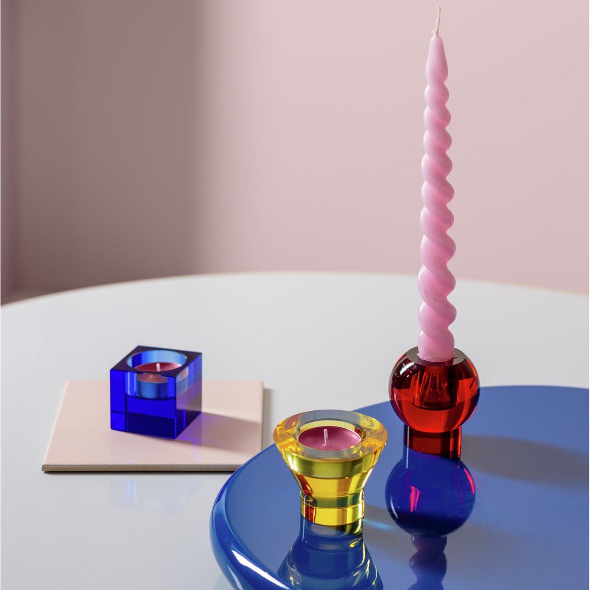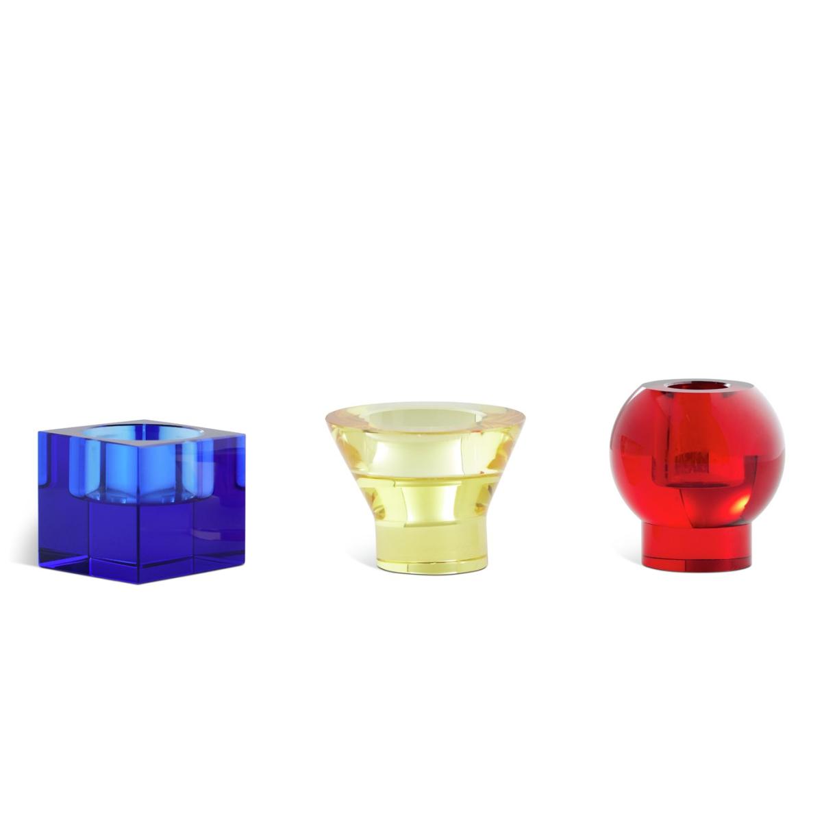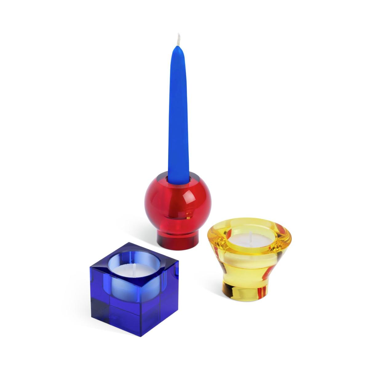 Sculpture and function combine to create this striking stacking glass candle holder designed by inhouse designer Ross Mountford. 3 in 1, it utilises solid primary colours and geometric forms in crystal clear K9 glass to create three individual elements that work together or alone. Combining 2 tealight holders and 1 taper candle holder, each piece is moulded and finished by hand. Candles not included. Part of the specially commissioned collection in celebration of Habitat's 60 years of British design. Size (small) H4.5, Diameter 5cm. Size (medium) H5, Diameter 7cm. Size (large) H6, W6, D6cm. Part of the Habitat 60 collection.
