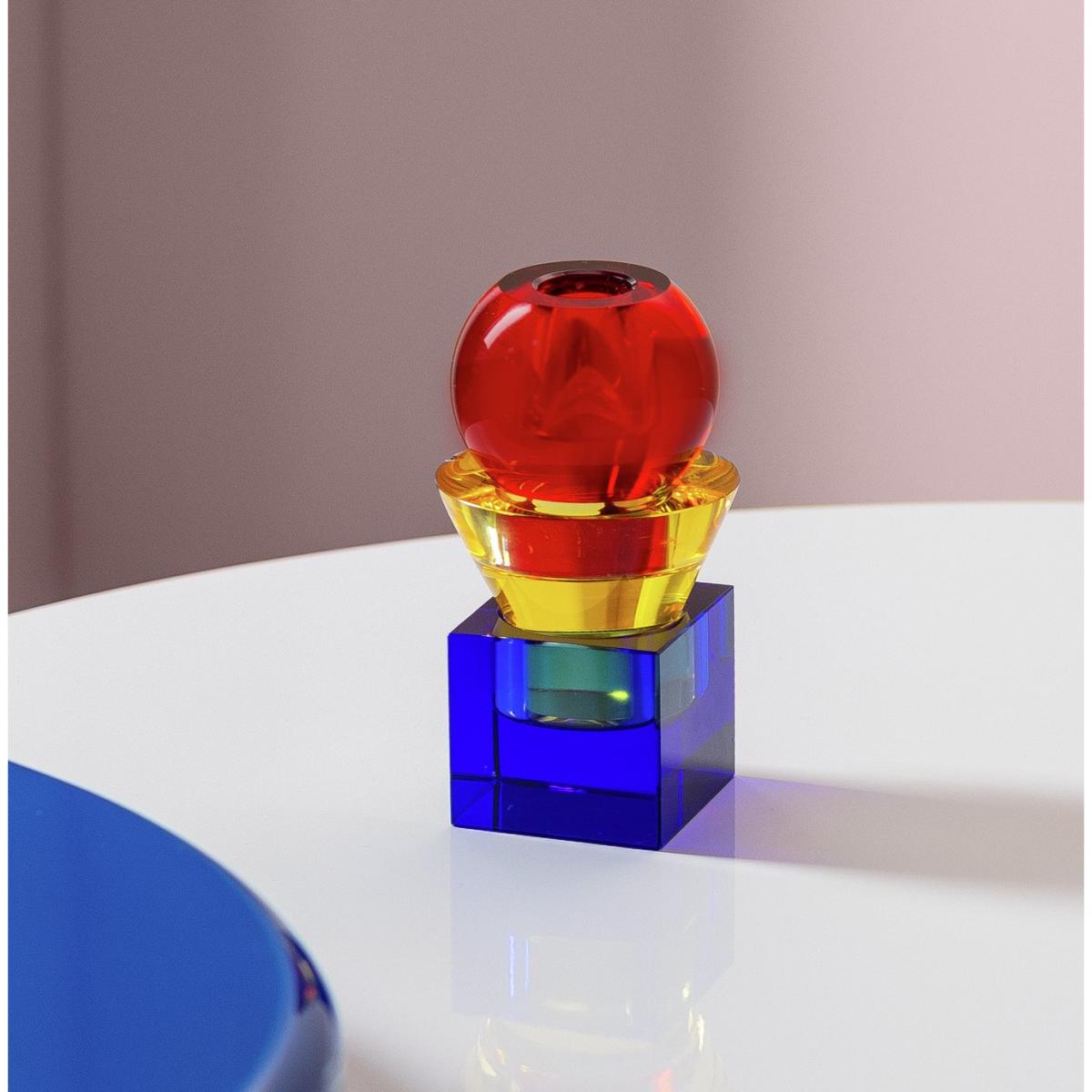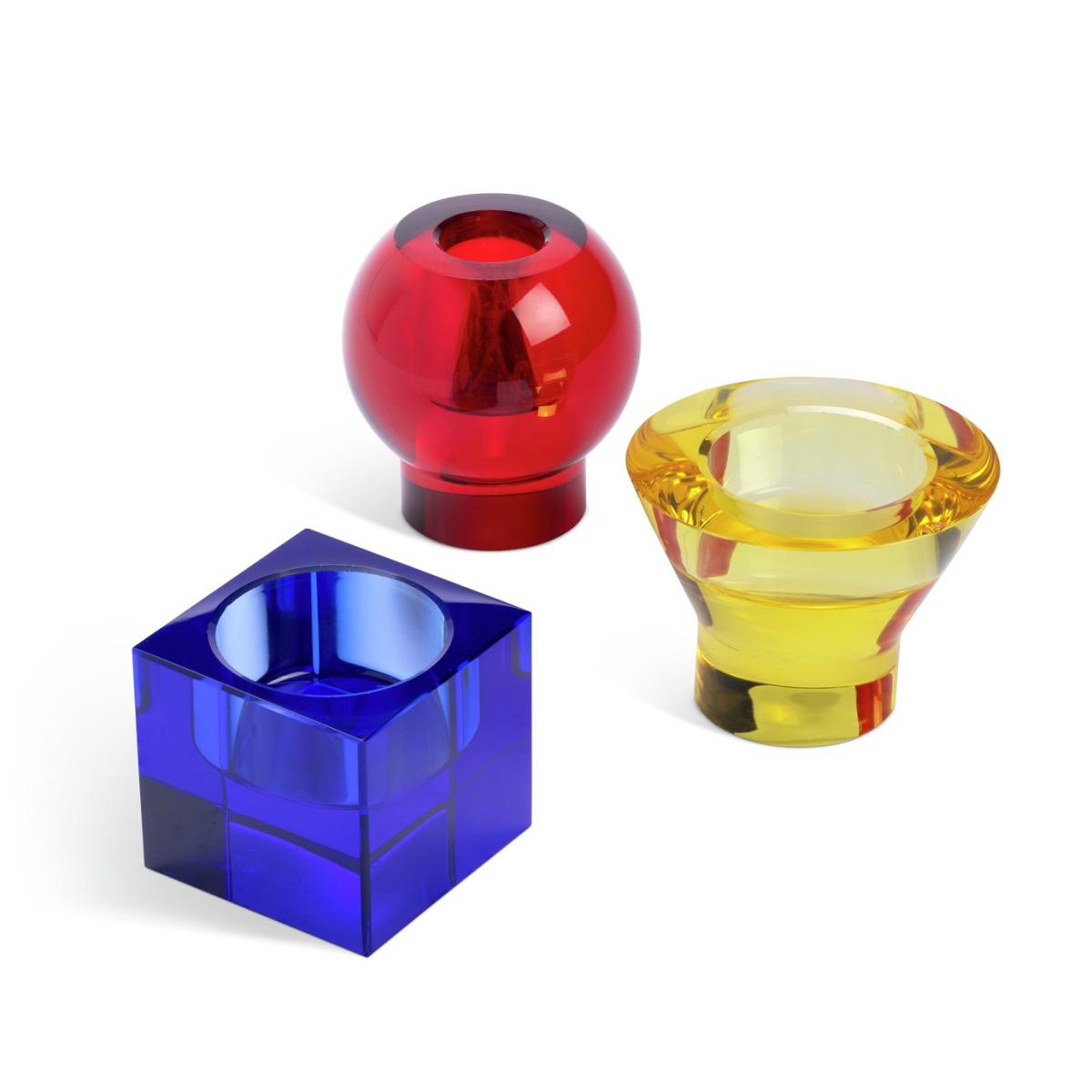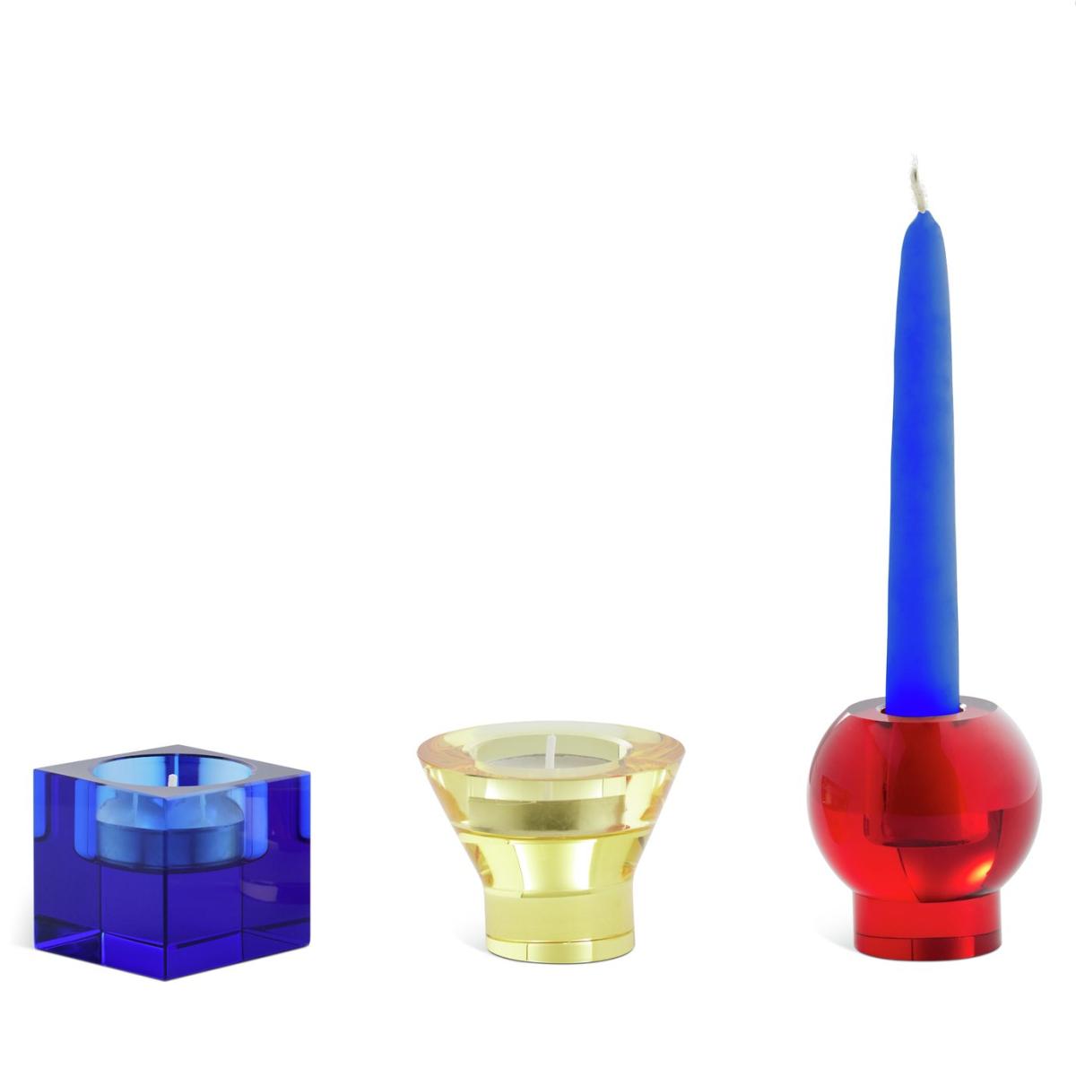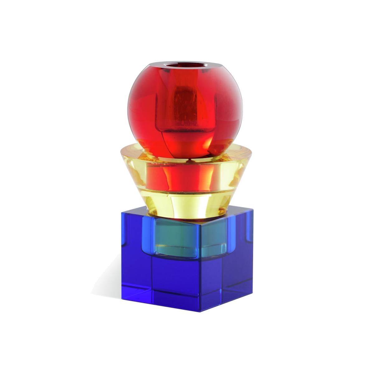 Sculpture and function combine to create this striking stacking glass candle holder designed by inhouse designer Ross Mountford. 3 in 1, it utilises solid primary colours and geometric forms in crystal clear K9 glass to create three individual elements that work together or alone. Combining 2 tealight holders and 1 taper candle holder, each piece is moulded and finished by hand. Candles not included. Part of the specially commissioned collection in celebration of Habitat's 60 years of British design. Size (small) H4.5, Diameter 5cm. Size (medium) H5, Diameter 7cm. Size (large) H6, W6, D6cm. Part of the Habitat 60 collection.
