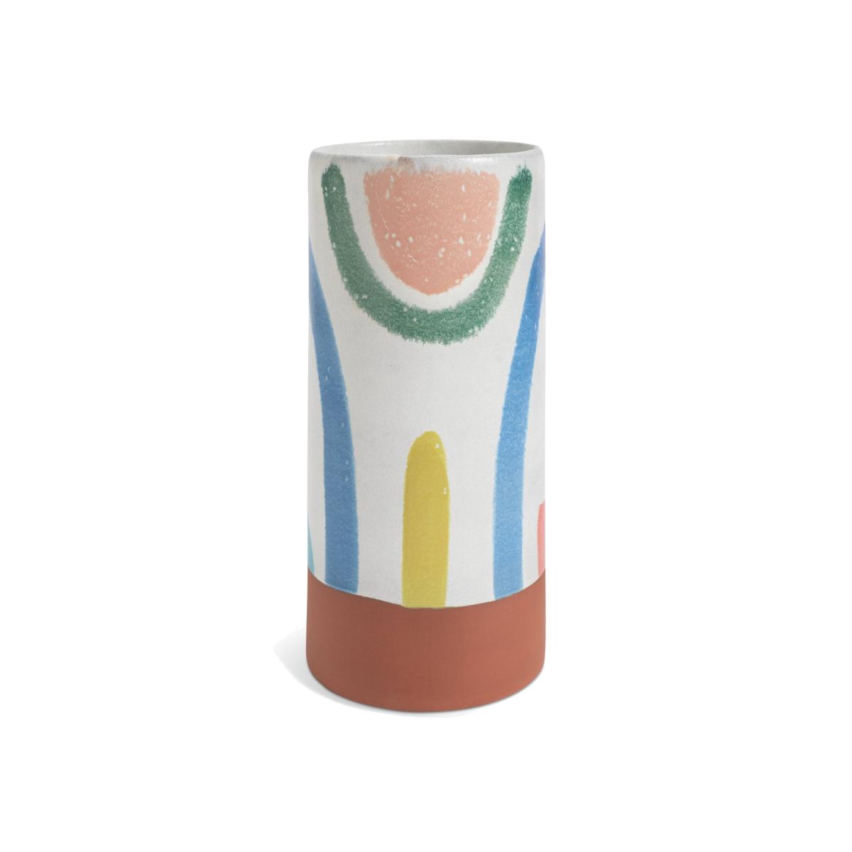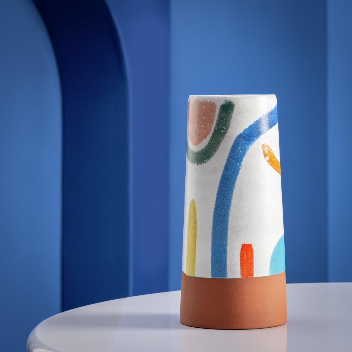 Designer, Silvia Kamodyova has worked with our artisans in Portugal to create each hand painted statement piece in our exclusive Radica terracotta collection. Like this tall vase. Uplifting, colourful and playful, Silvia's intuitive stokes in vibrant hues were inspired by the palette of the 1980s Habitat 'Living with Colour' catalogue. The movement and tactility through the bright brush marks and application of glaze are all synonymous with Silvia's joyful pottery. Part of the specially commissioned collection in celebration of Habitat's 60 years of British design. For Decorative use only. Clean with a soft dry cloth. Size H26, Diameter 12.5cm. Part of the Habitat 60 collection.