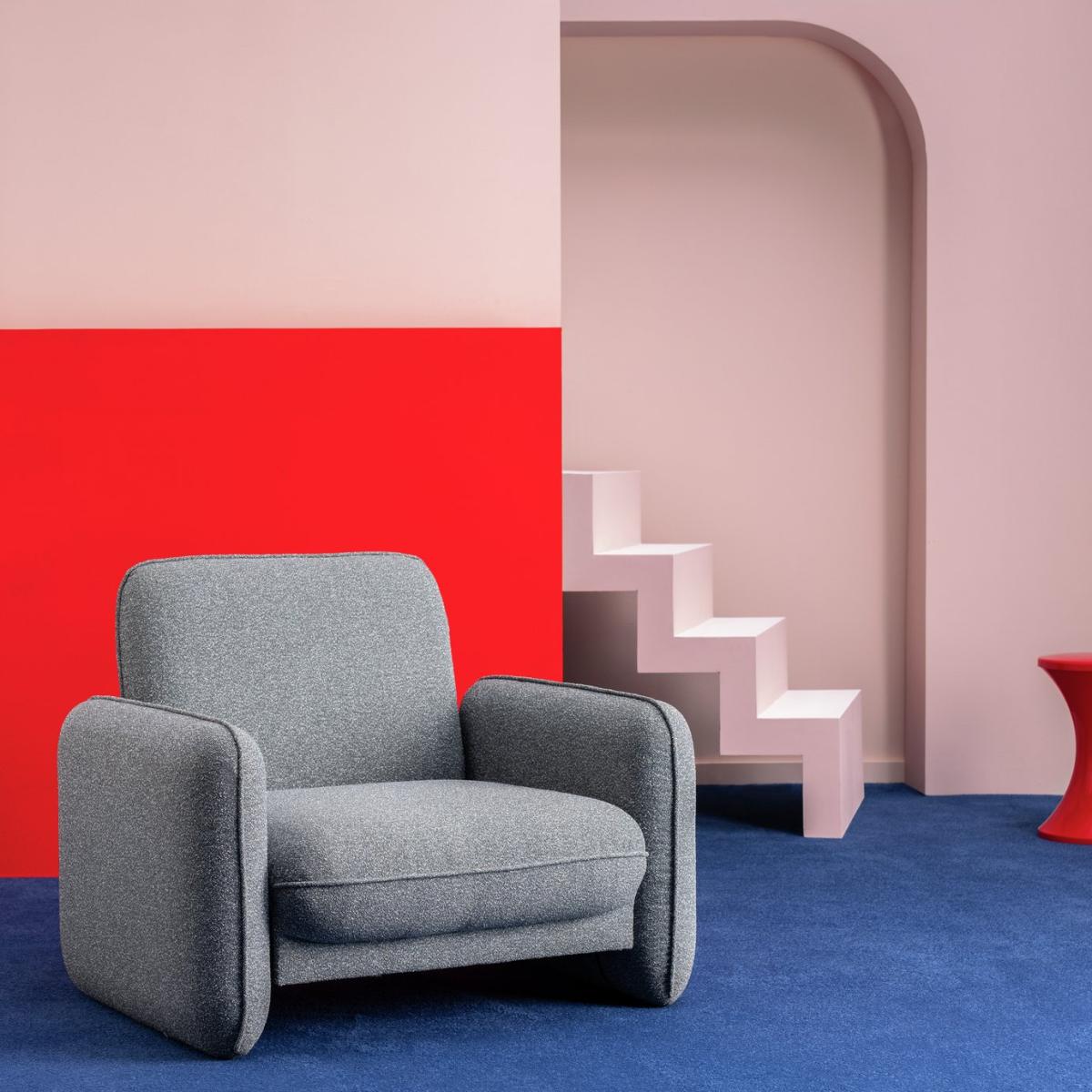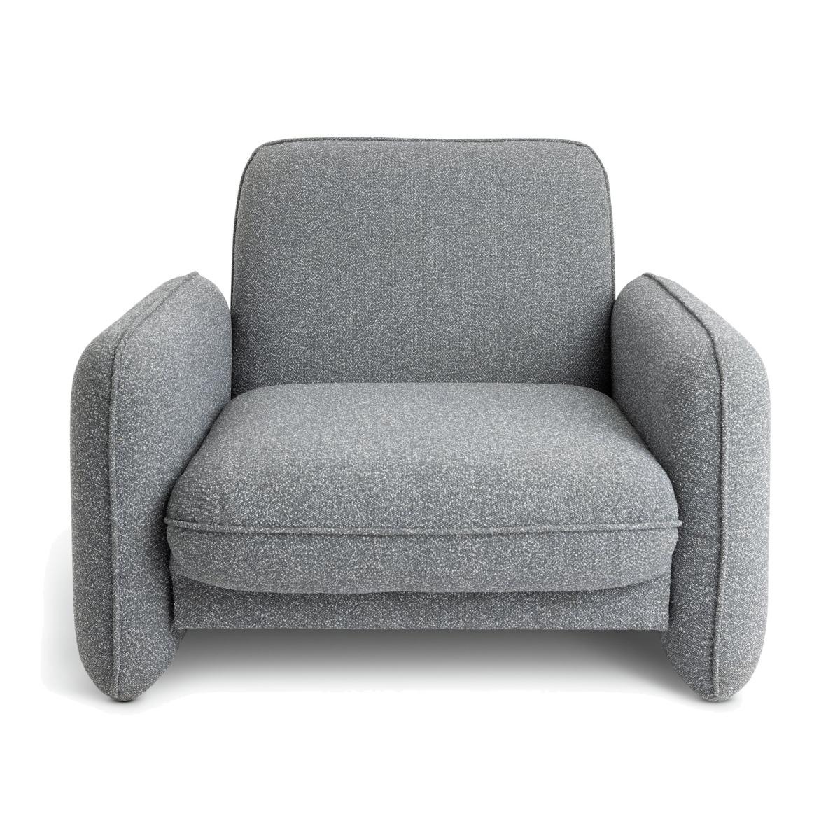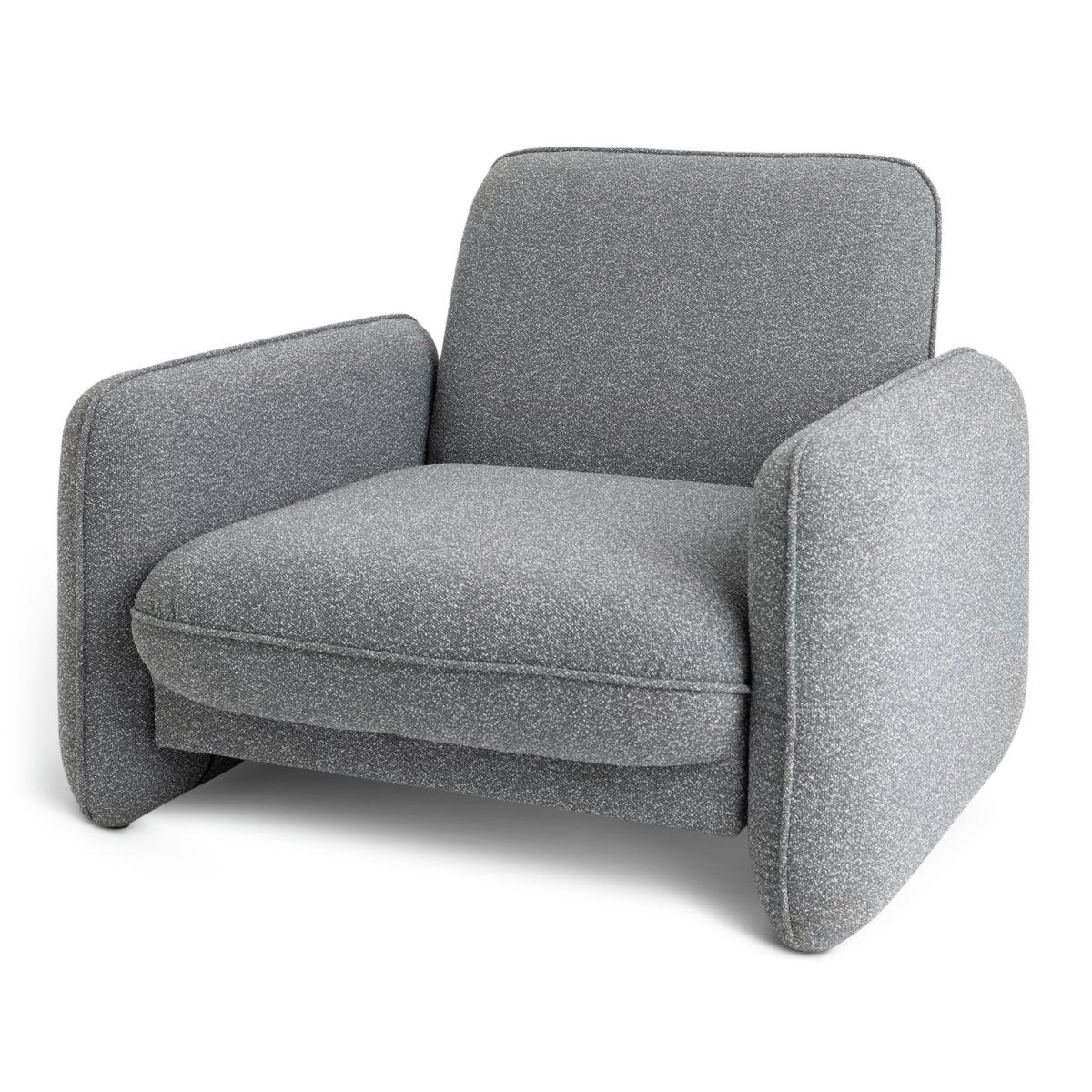 From our in-house senior designer James Cottingham, the personality-packed Trac armchair draws inspiration from 1970s Habitat upholstery, innovative manufacturing methods and diverse materials. With arms that continue to the floor the seat appears to look like its floating. Rounded, inflated forms, chunky piping details and a generous seat depth offer comfort. Upholstered in a speckled and textured boucle-like fabric. Also available as a 2 and 3 seater sofa. Each sold separately. Part of the specially commissioned collection in celebration of Habitat's 60 years of British design. Part of the Habitat 60 collection. Material: Made from 100% boucle. Fixed seat with foam fibre wrap filling. Fixed cushion(s) with foam fibre wrap filling. Free fabric swatch available on this line. Dimensions: Size H76, W94, D92cm. Floor to seat height: 40cm. Depth of seat: 62cm. Height of seat back: 36cm. Width of seating area between arms: 64cm. Height of arm rest: 53cm. Weight 35kg. Professional clean only. Plump cushions regularly to maintain shape. Fully assembled. Maximum individual user weight 150kg. Packaged dimensions: Package size H78, W97, D88cm. FSC certified meaning the materials used for this product are responsibly sourced. General information: Manufacturer's 2 year guarantee.