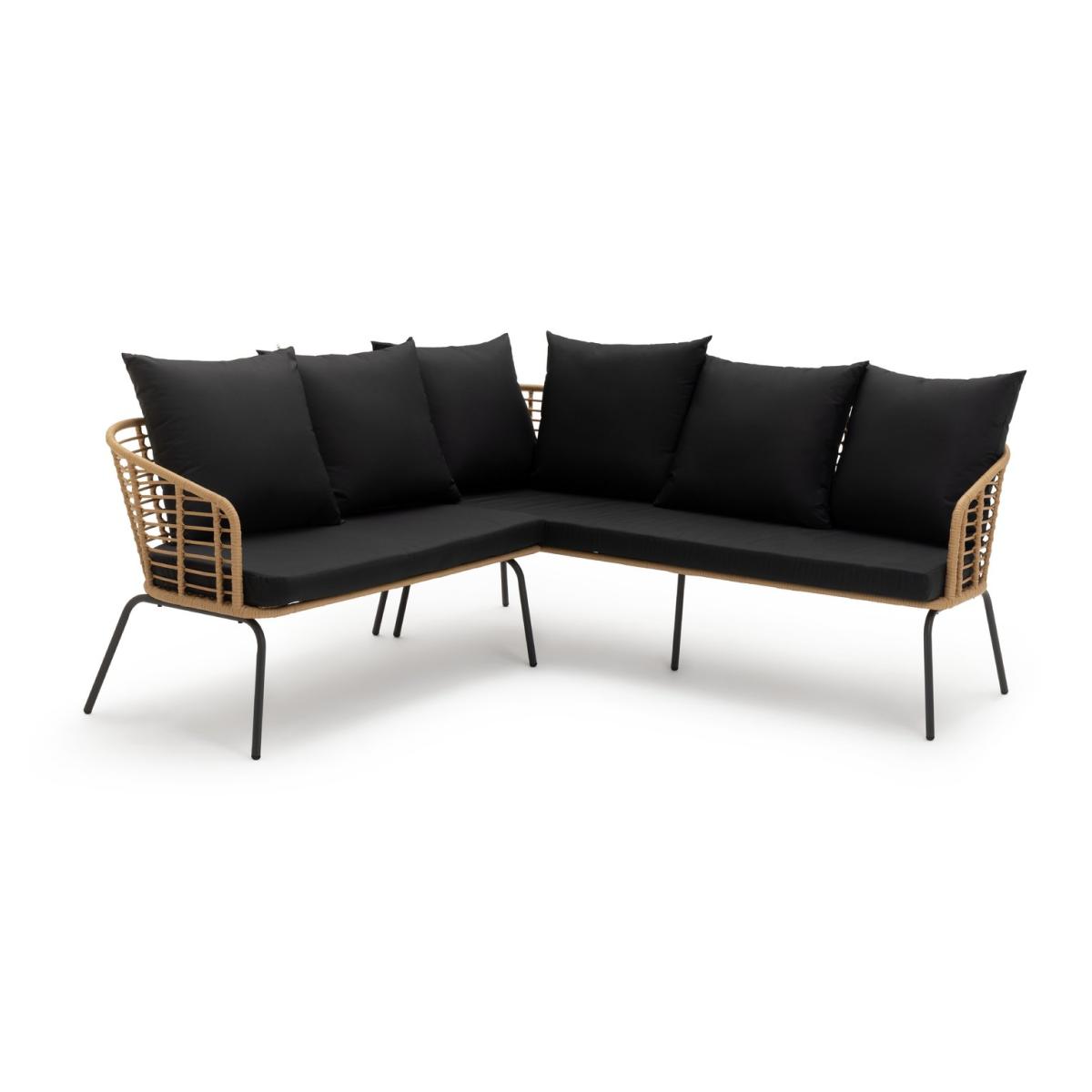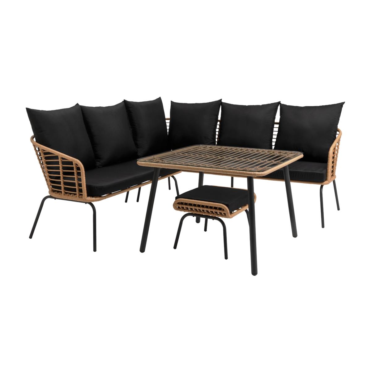 Boho luxe lounging. Find the perfect spot to chill and chat with our garden corner dining set. This 7 seater is a beauty. The black upholstery and handwoven bamboo come together to create a striking contrast. With a choice of seating you can relax on the 2 and 3-seater sofas, or perch on either of the 2 matching stools. All cushioned and delightfully comfy. Built for lazy days and cosy evenings, just add nibbles, drinks, friends and family.