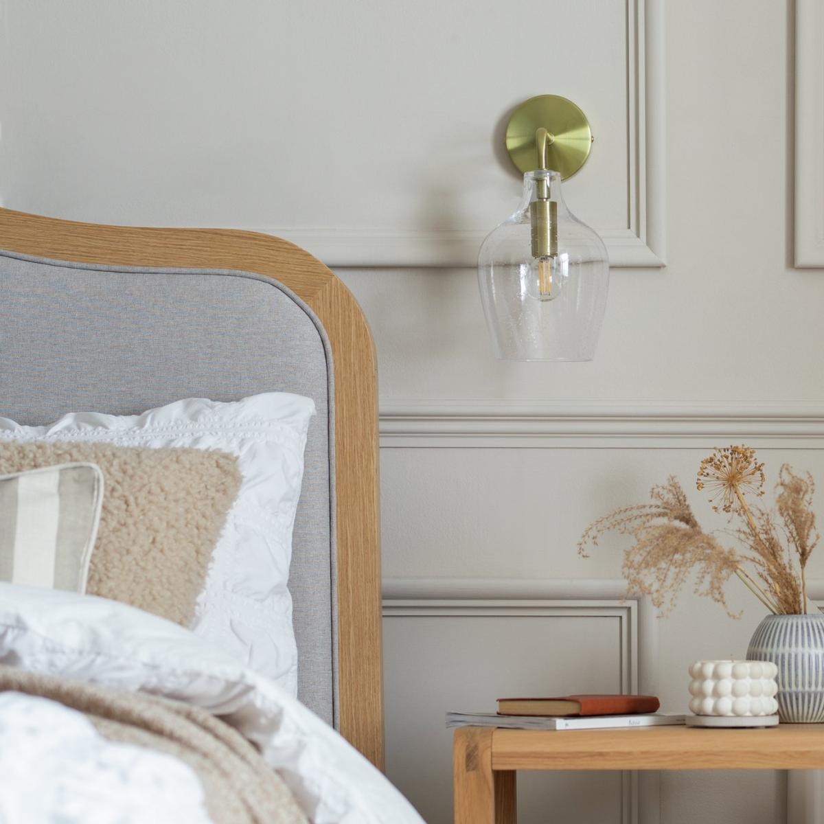 Bubbles and sparkles. Set on a contemporary brass fixing, this striking wall light features a glass bottle shade injected with delightfully random bubbles. Switch on and enjoy the sprinkle of light patterns subtly projected on your wall. Mesmerizing. Finish with a filament bulb to make a super style statement. Dimensions:Size H30, , Diameter 15cm. Bulb Information: Bulbs required 1 x candle E14 small edison screw LED (not included). Recommended maximum wattage: 6 watts. Can not be used with a dimmer switch. General Information: Glass/Metal. IP rating 20 - not suitable for bathroom use. Weight: 1kg. Supplied assembled. Product is hard-wired into electrics. This lighting product is a class 1 fitting. We are excited to be welcoming some of our favourite HOME products into the Habitat range. Your product may arrive in Habitat or HOME packaging. Manufacturer's 1 year guarantee.