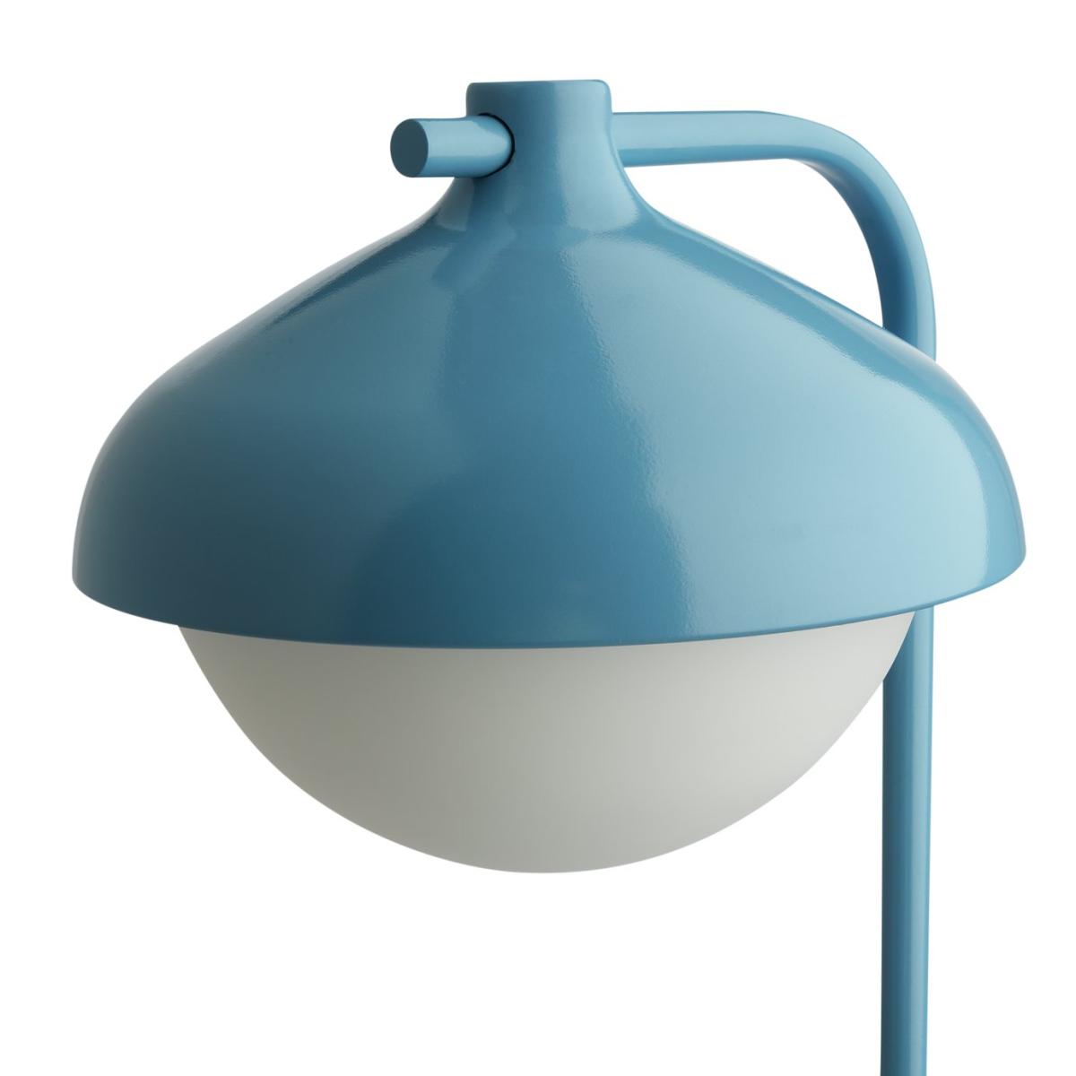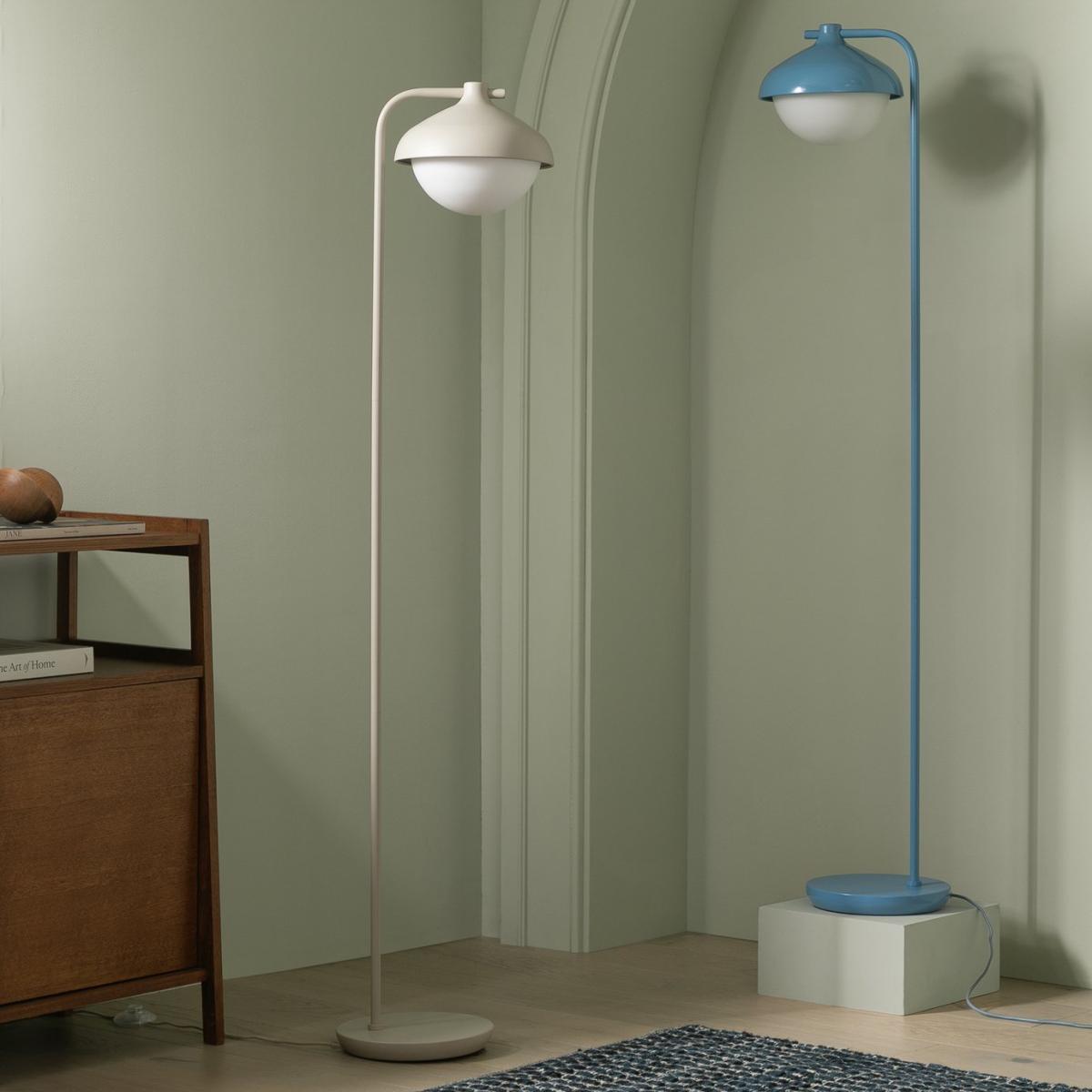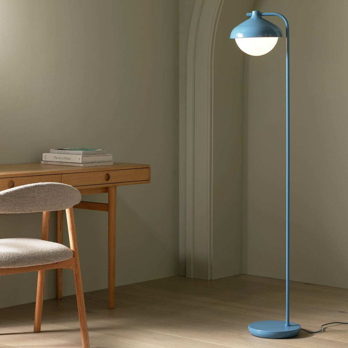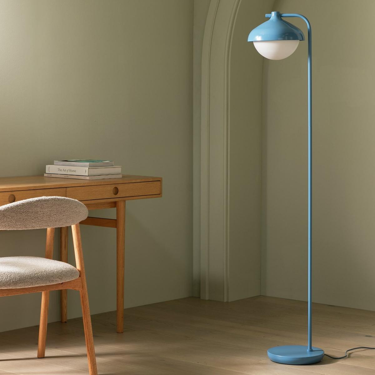 Nestled neatly into its cupule base, the large opal diffused bulbous shade of our Acorn floor lamp emits a soft, mood-making light. Inspired by Scandi style its form is symmetrically balanced with weighted base and finished in a cornflower blue coloured powder coating. Dimensions: Size H152, W33, D25 cm. Diameter 25cm. Diameter of base 25cm. Shade size H12.7, D 25cm. Cord length 1.8m. Bulb Information: Bulb required 1 x candleE1. 4 small edison screw (not included). (not included). 10 watts. (bulb not included). LED bulb only. General Information: Shade material: metal. Base material: metal. Foot switch. Not suitable for bathroom use. Minimal assembly. Product is mains powered plug in. This lighting product is a class 2 fitting. Weight 5.89kg. Manufacturer's 1 year guarantee.