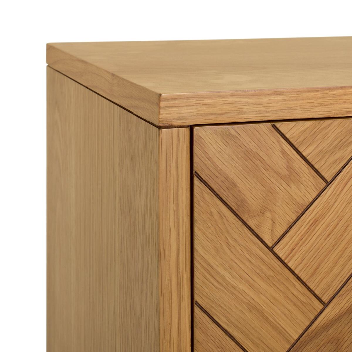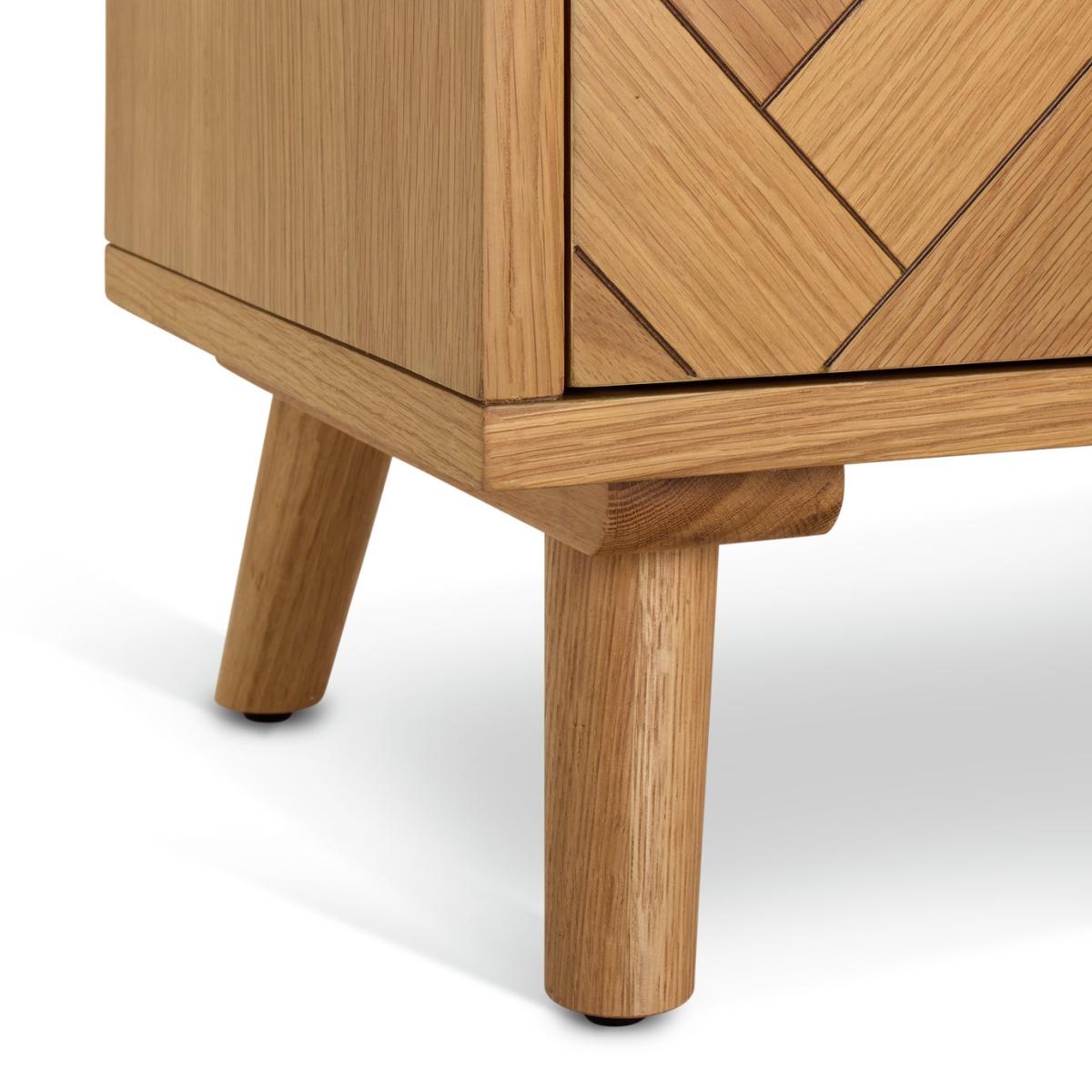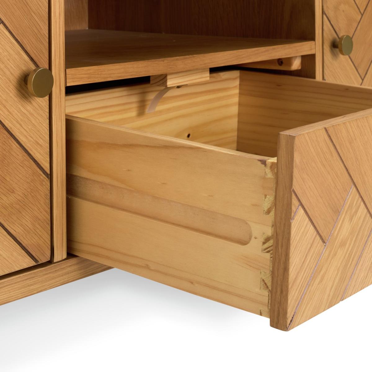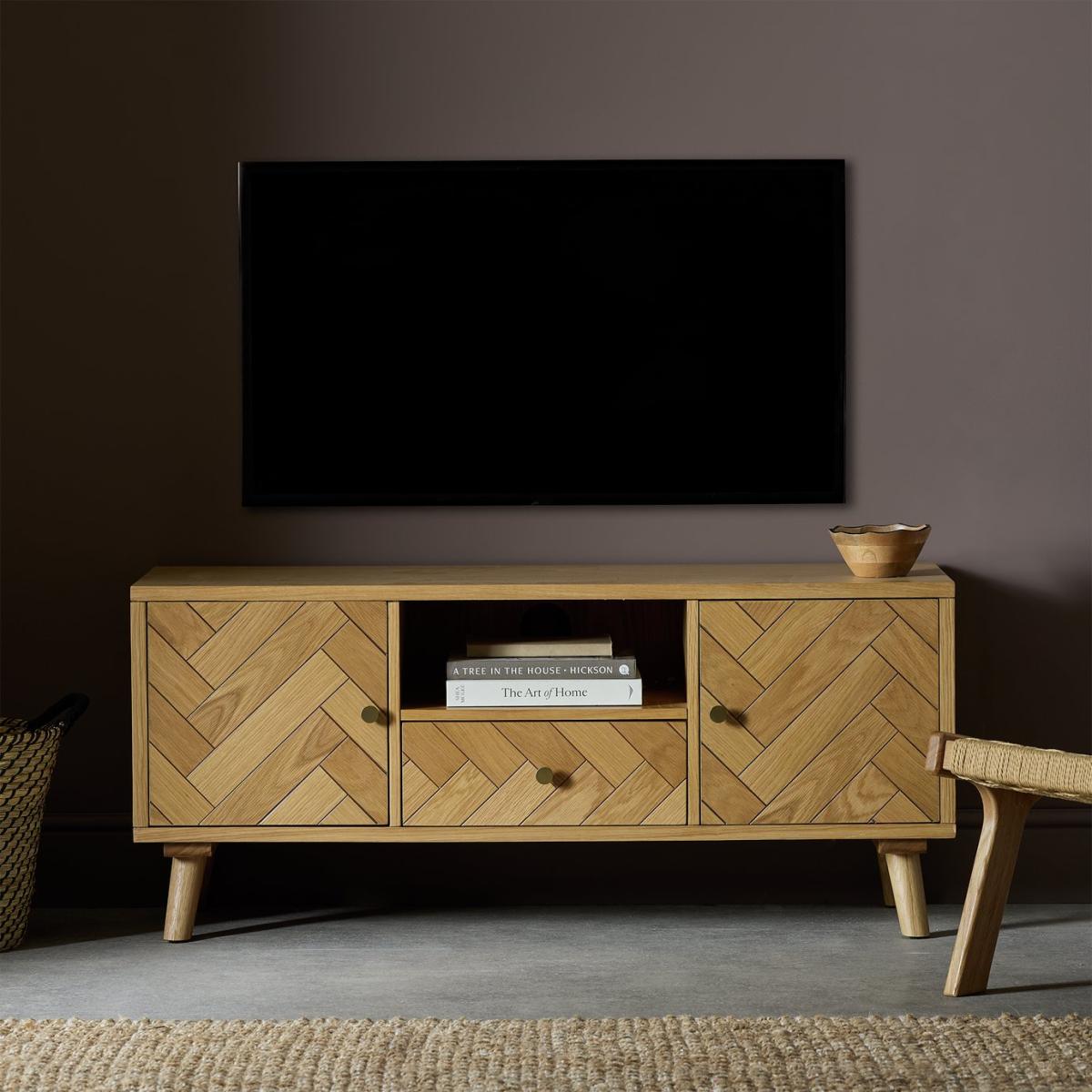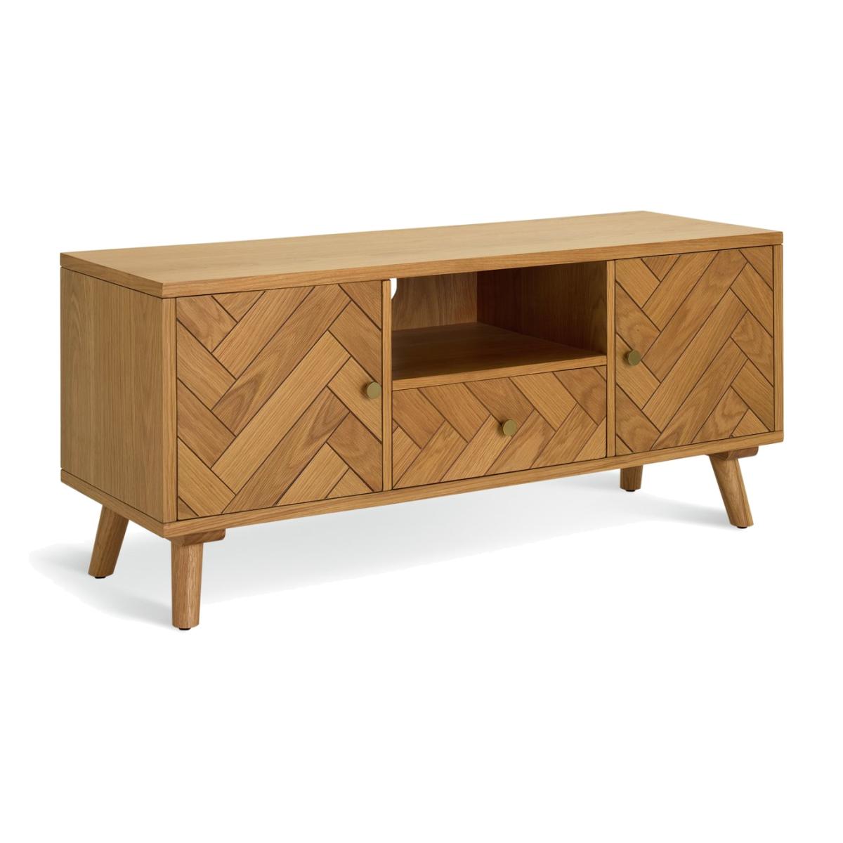 Come home to Afram, the strikingly, stylish TV cabinet. Designed with a herringbone parquet pattern with bronzed handles. With 2 cupboards, 1 drawer and a handy cubby area to store remotes, gaming controls or books. Pop any TV up to 55 inches on Afram, cable access is easy. Fashionably functional. And what's more? Afram is all about minimal and simple assembly, just attach the legs and you're good. Part of the Afram collection. Made from MDF and oak. Size H 52.5, W 120, D 40cm. Weight 33kg. Wooden runners. 2 shelves. 2 doors. Bronze effect handles. 1 media storage section. Largest height of media equipment sections 15cm. Easy cable access. Suitable for screen sizes up to 55in. Maximum weight of TV 15kg. Self-assembly - 1 person recommended. Package Dimensions: Package 1 dimensions: H49, W127, D47cm. General information: Manufacturer's 2 year guarantee. FSC certified meaning the materials used for this product are responsibly sourced.