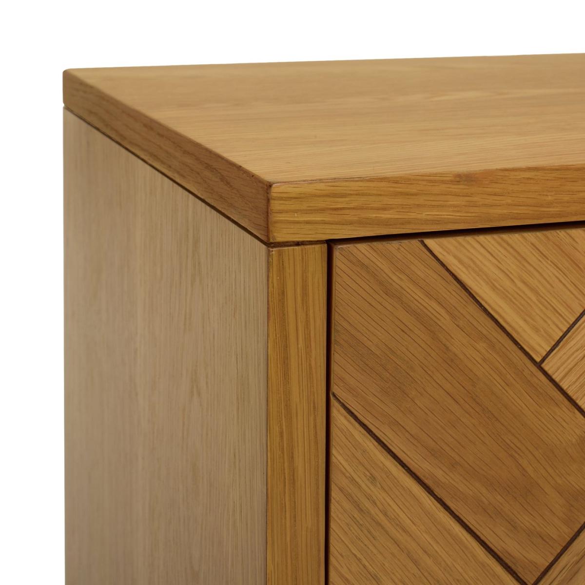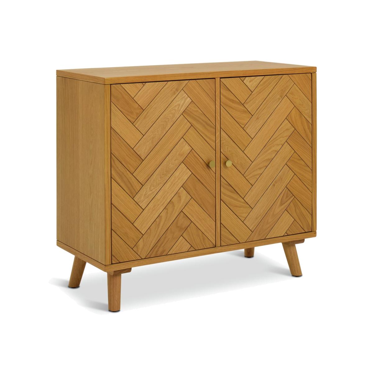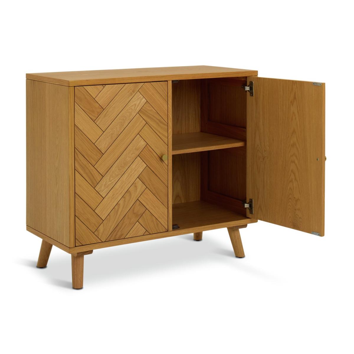 Come home to Afram, the strikingly, stylish sideboard. Designed with a herringbone parquet paneling with bronzed handles. Fashionably functional. Open the 2 doors to reveal shelved storage space to help keep a room clutter free. A distinctive piece of furniture with plenty of contemporary character. And what's more? Afram is all about minimal and simple assembly, just attach the legs and you're good. Part of the Afram collection. Made from MDF and oak. Size H 80, W 90, D40cm. Bronze effect handles. 2 doors. 1 fixed shelf. Weight 28kg. Self-assembly - 1 person recommended. Maximum load weight 60kg. Package Dimensions: Package 1 dimensions: H76.5, W97, D127cm. General information: Manufacturer's 2 year guarantee. FSC certified meaning the materials used for this product are responsibly sourced.