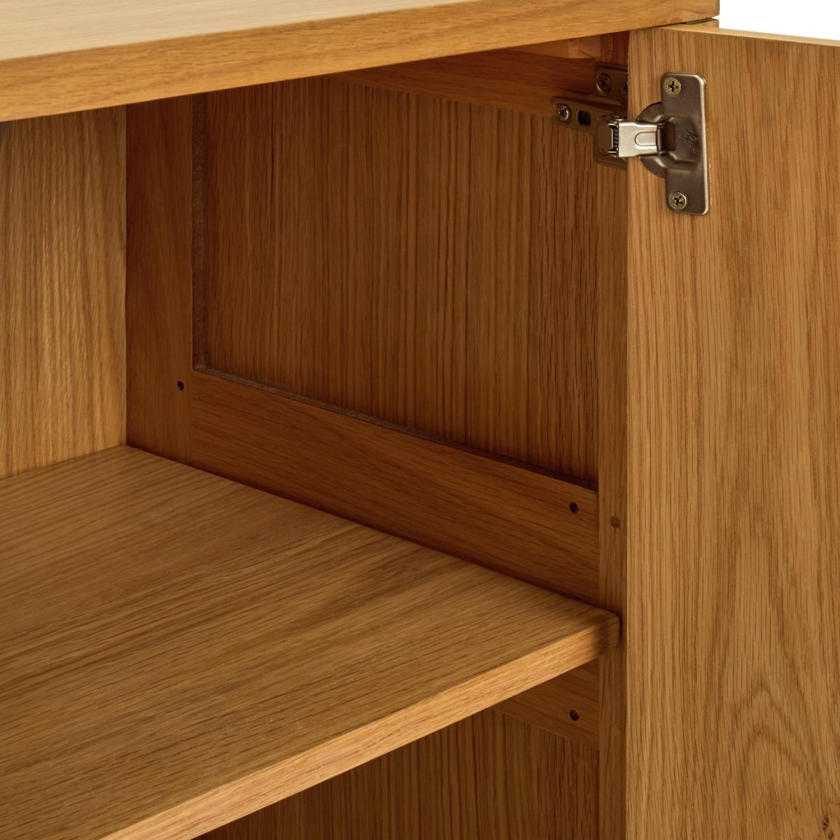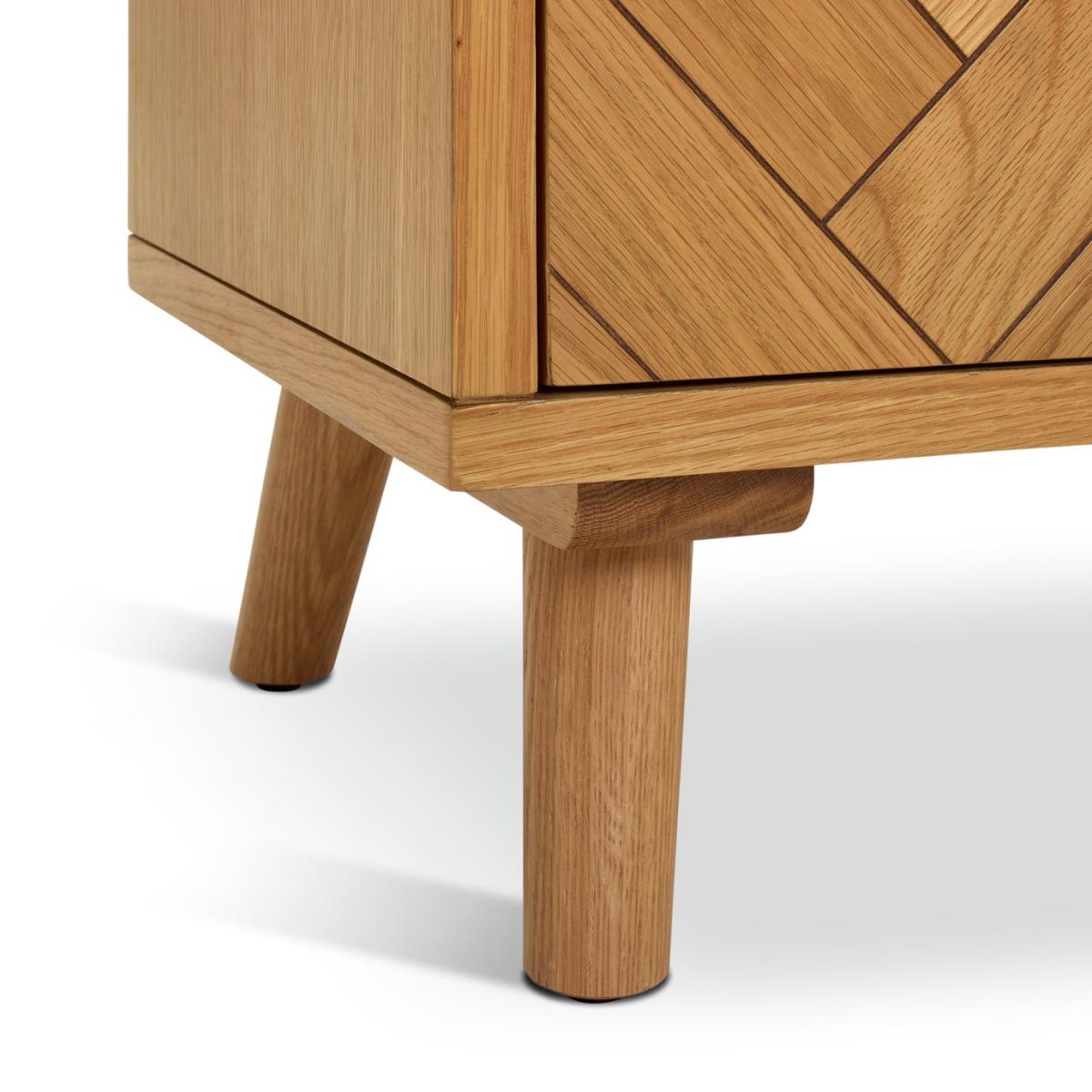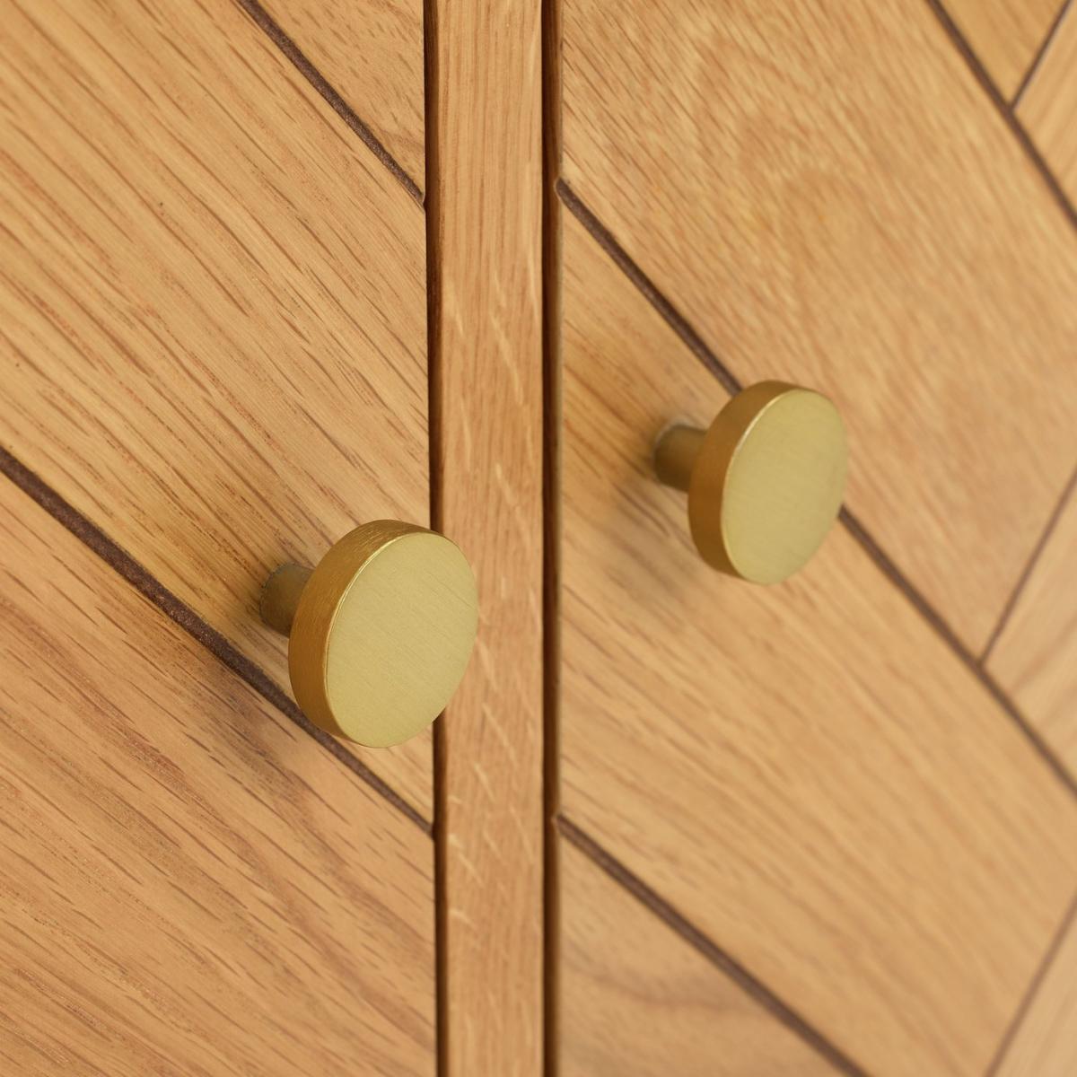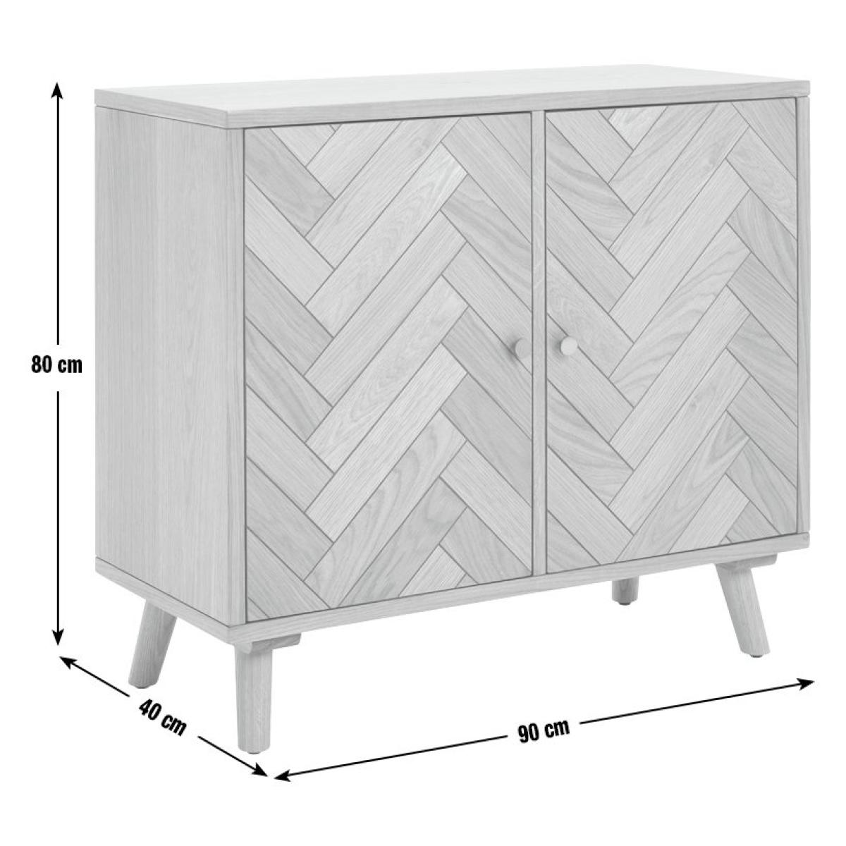 Come home to Afram, the strikingly, stylish sideboard. Designed with a herringbone parquet paneling with bronzed handles. Fashionably functional. Open the 2 doors to reveal shelved storage space to help keep a room clutter free. A distinctive piece of furniture with plenty of contemporary character. And what's more? Afram is all about minimal and simple assembly, just attach the legs and you're good. Part of the Afram collection. Made from MDF and oak. Size H 80, W 90, D40cm. Bronze effect handles. 2 doors. 1 fixed shelf. Weight 28kg. Self-assembly - 1 person recommended. Maximum load weight 60kg. Package Dimensions: Package 1 dimensions: H76.5, W97, D127cm. General information: Manufacturer's 2 year guarantee. FSC certified meaning the materials used for this product are responsibly sourced.