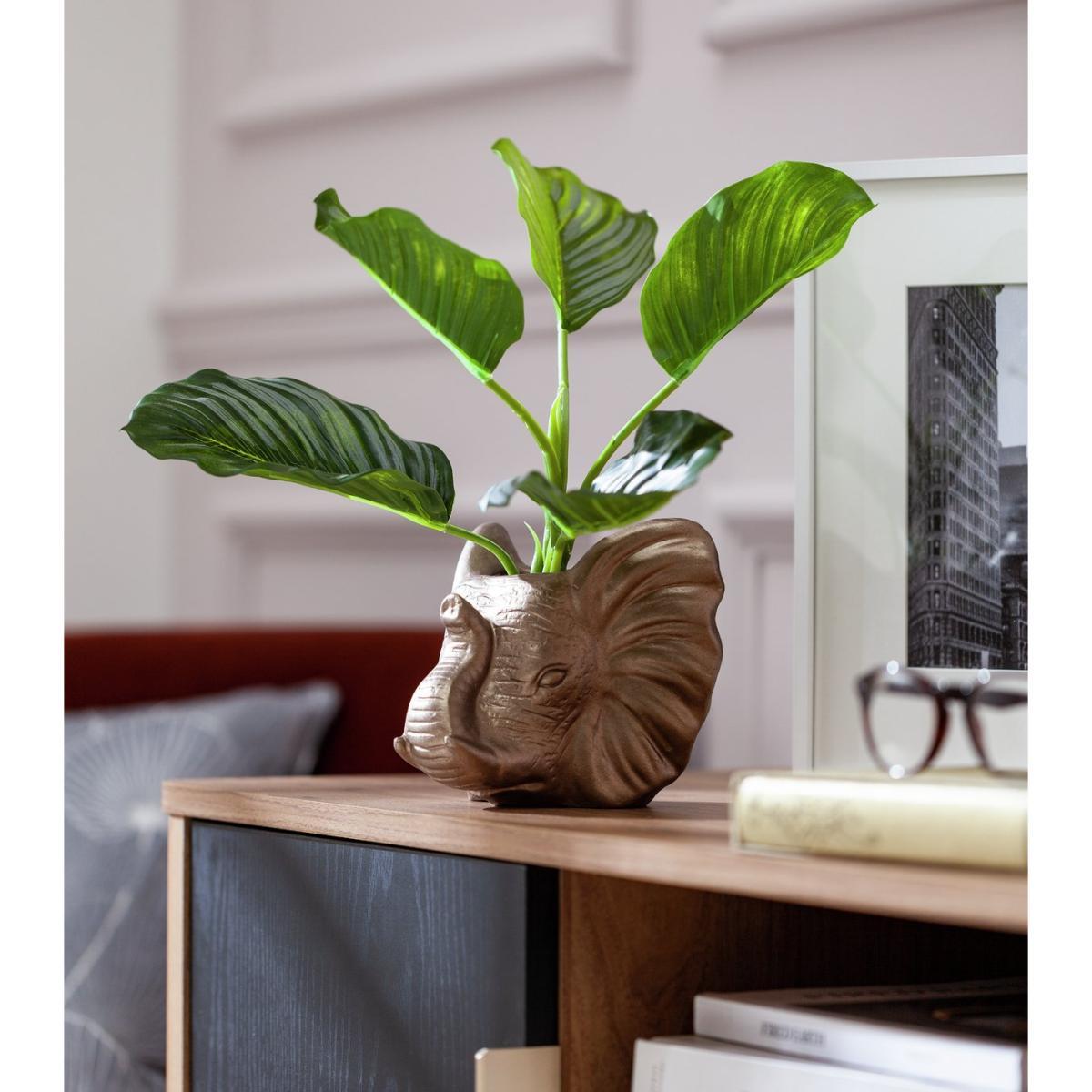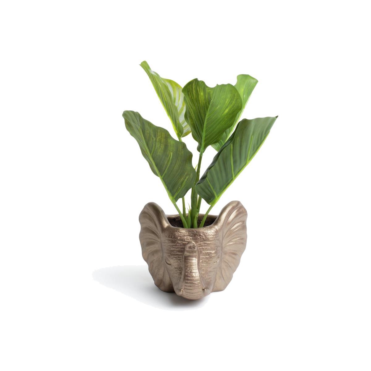 Full of personality our luxurious elephant planter is finely crafted in a rich metallic antique gold. Home to a lush, wax-leaved faux plant that brings touch of the exotic in. Think of palaces and silks, think of warm days in India. Our ornamental planter looks good in any setting, bedroom bathroom or lounge. No need to water, just dust. A tropical delight.