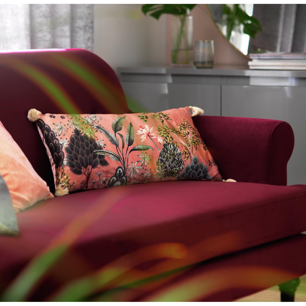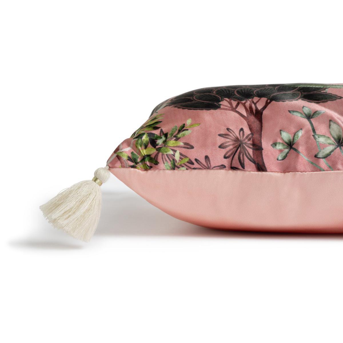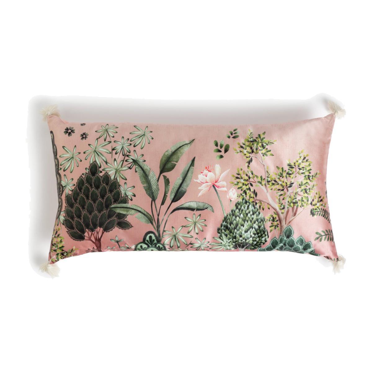 Exotic beauty. Our Garden Print cushion features the stunning flora of faraway lands. Oversized trees, bushes and palm fronds burst to life on this silk-effect cushion with tassels at the corners. Pair with our Garden Print bedding set, or layer on your sofa with other brightly colour cushions for a luxurious and trendy room update.