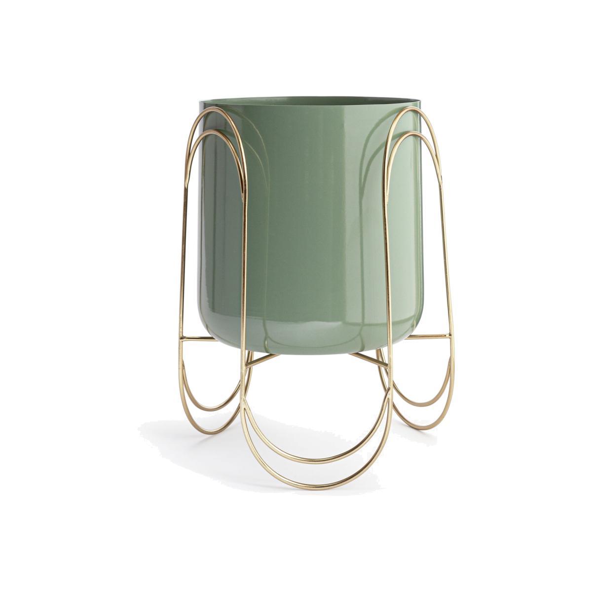 Hey good looking. With a pop of colour and added height, this bold statement of a floor planter will really enrich your home. A cool jade, large enamel-style pot sits securely in a frame with funky scalloped feet and curves in all the right places. In brass coated steel it's strong enough for bigger botanicals - faux or real. Try a classic cheese plant or flashy fern. No need to be shy. Let's hit the big time with this one. Size H36.5, W25, D25cm. Diameter 25cm.