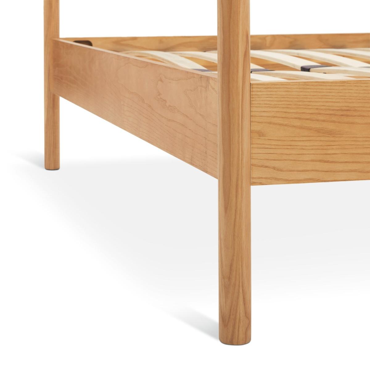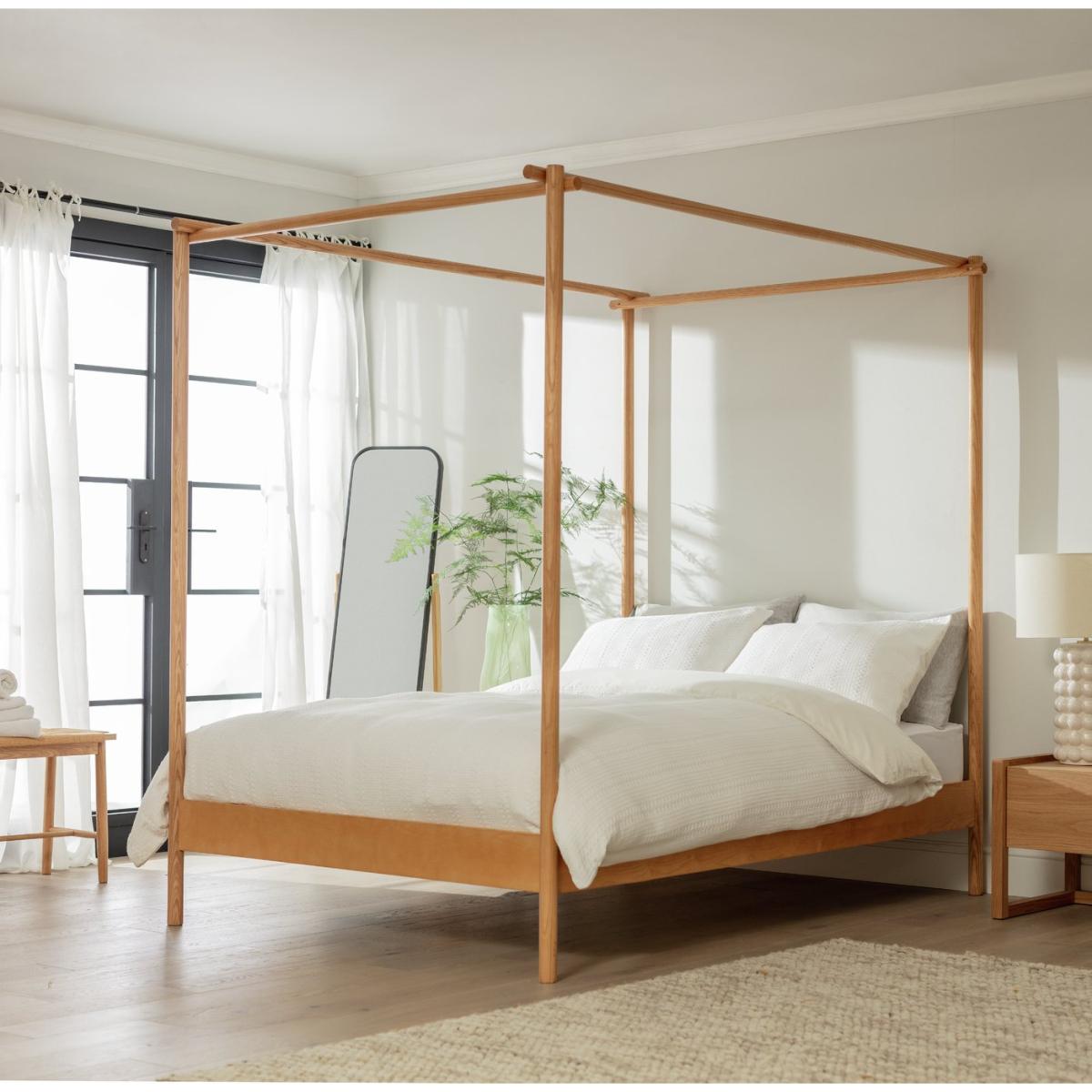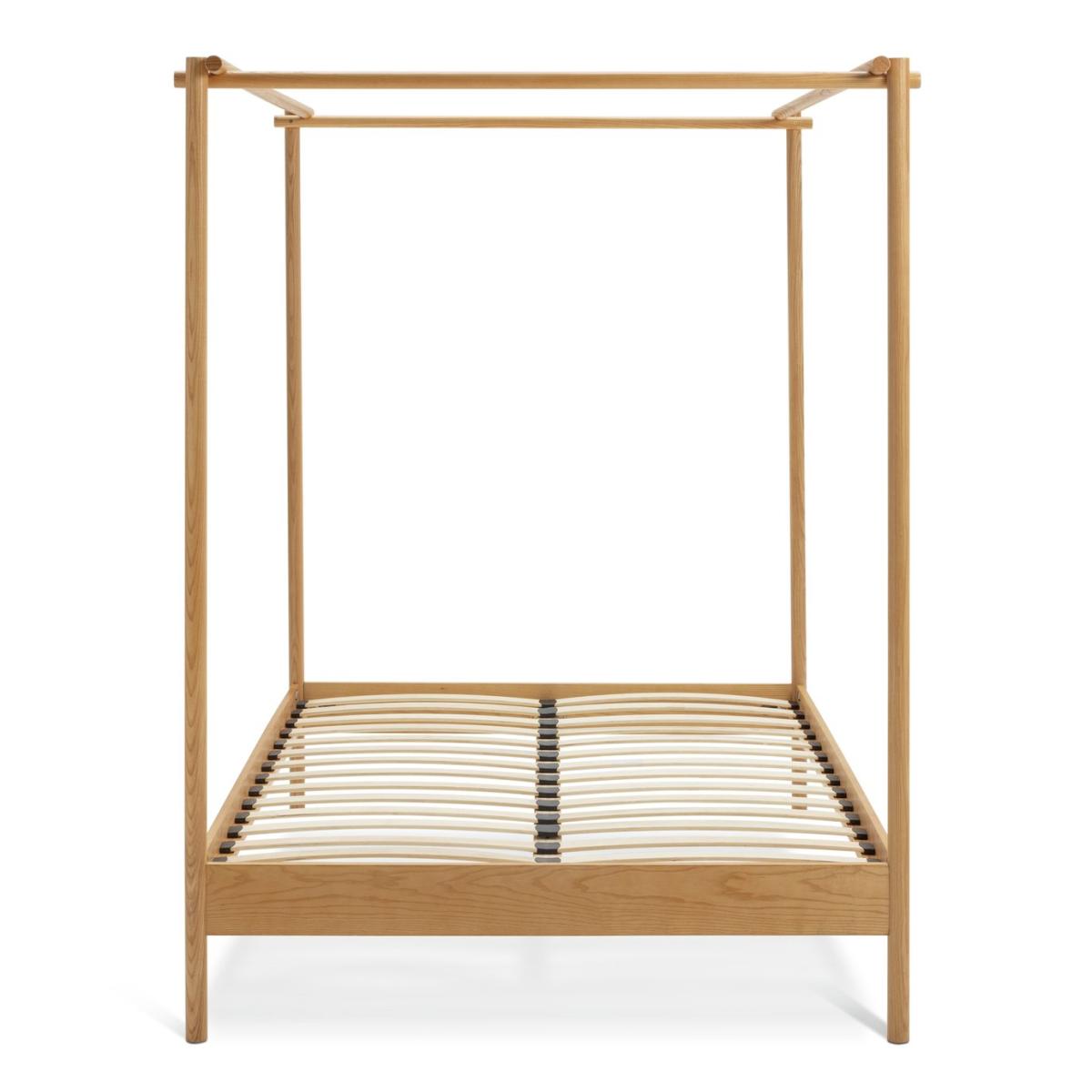 How do you enjoy maximum minimalism in your sleep space? Choose our Scandi-esque modern 4 poster. The tall clean lines create a stunning silhouette that's serenely light and airy. And look at the attention to detail. Akari is crafted from solid ash with upright dowels and sprung wooden slats. This is a classic bed that's also comfortably contemporary. Part of the Akari collection. Wooden frame. Base with wooden slats. Size W163.5, L213, H195cm. 21cm clearance between floor and underside of bed. Weight 35.6kg. Total maximum user weight 220kg. Self-assembly - 2 people recommended. General Information: Manufacturer's 1 year guarantee. FSC certified meaning the materials used for this product are responsibly sourced.