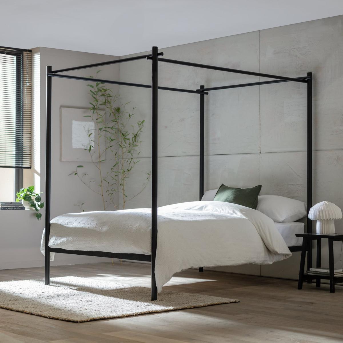 How do you enjoy maximum minimalism in your sleep space? Choose our Scandi-esque modern 4 poster. The tall clean lines create a stunning silhouette that's serenely light and airy. And look at the attention to detail. Akari is crafted from metal with upright dowels and sprung wooden slats. This is a classic bed that's also comfortably contemporary. Part of the Akari collection. Metal frame. Metal feet. Base with plywood slats. Size W162, L214, H194.5cm. 30cm clearance between floor and underside of bed. Weight 65kg. Total maximum user weight 220kg. Self-assembly - 2 people recommended. General Information: Manufacturer's 2 year guarantee. FSC certified meaning the materials used for this product are responsibly sourced.