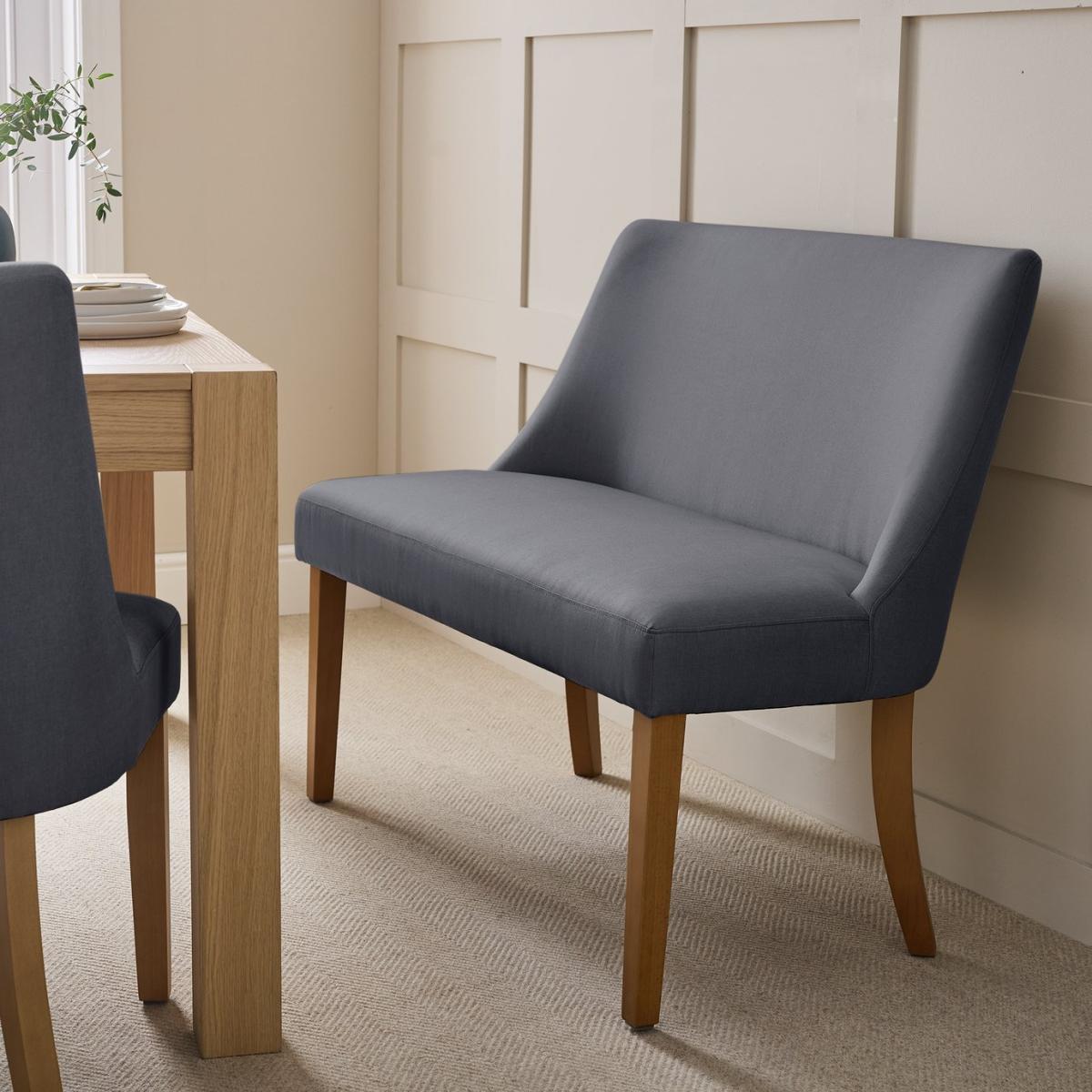 Fine dining starts with fine seating. Our modern dining bench combines comfort with contemporary design. Dark grey upholstery pairs beautifully with the solid beechwood. With rear legs that add flair and bring a distinctively elegant touch. The padded seat and ergonomic shaped backrest support you all the way. So settle in, the night is young. Part of the Alec collection. Chair: Size H88, W110, D62.5cm. Seat height 51.5cm. Upholstered frame with beech legs. Fabric seat pad. 1 bench. Bench made from solid wood frame. Fabric seat pad. Self-assembly - 2 people recommended. Max user weight per chair 130kg. Individual chair weight 12.4kg. Wipe clean with a soft cloth. Package Dimensions: Chair package size: H58, W111, D64cm. General information: Manufacturer's 1 year guarantee. FSC certified meaning the materials used for this product are responsibly sourced.