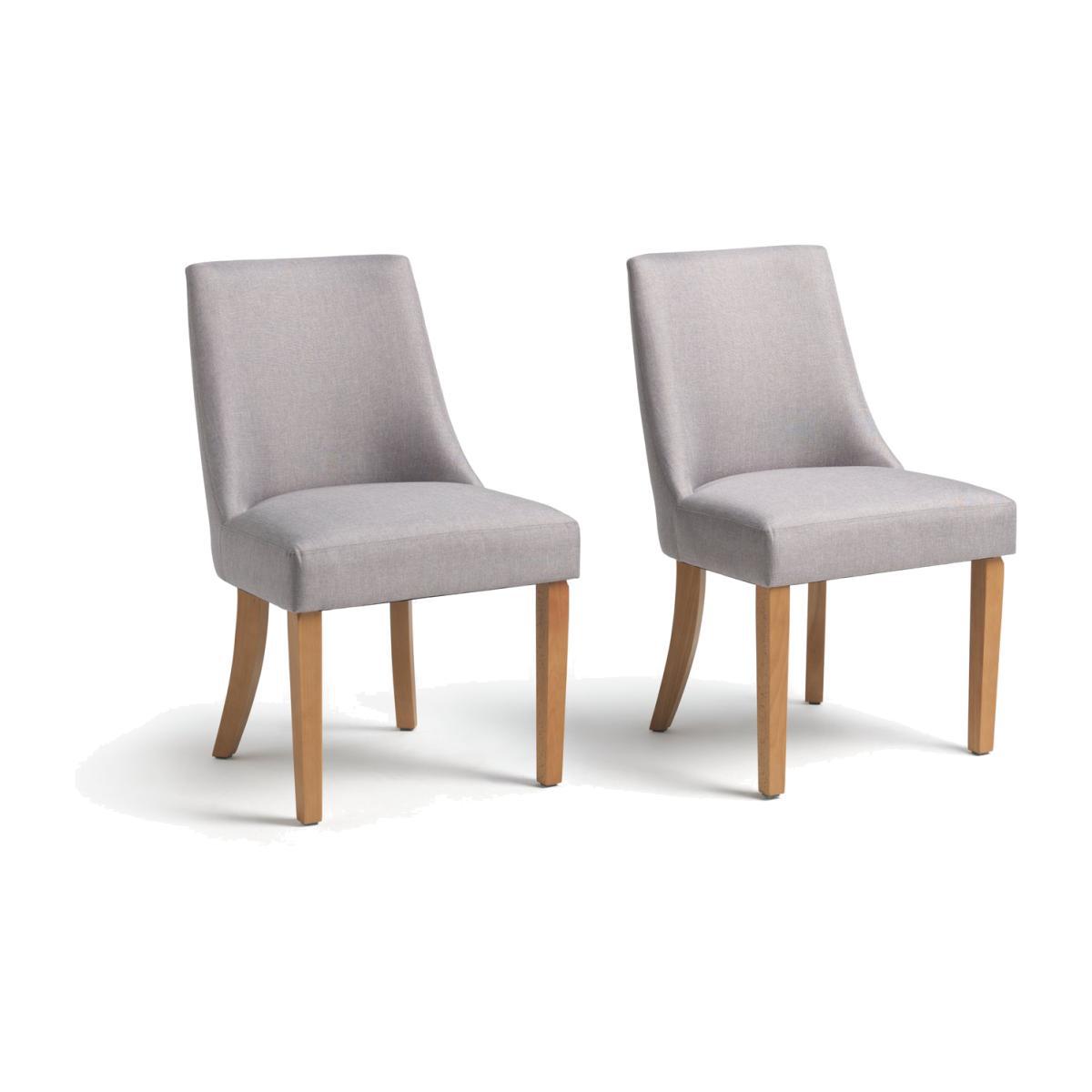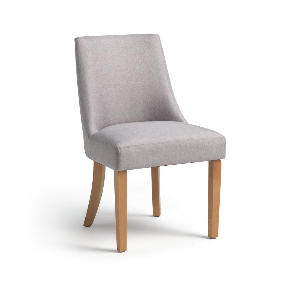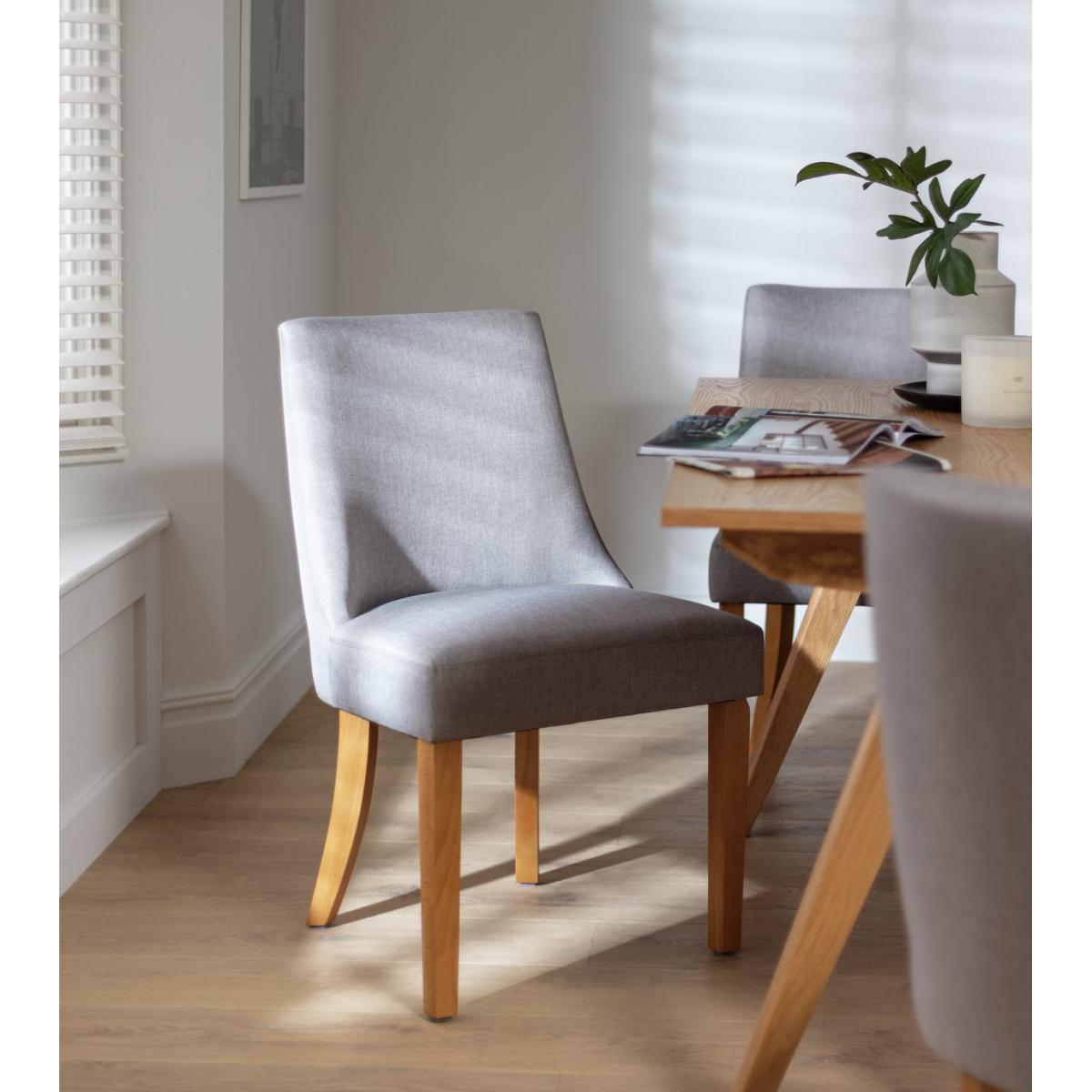 Fine dining starts with fine seating. Our pair of modern midback dining chairs combine comfort with contemporary design. The soft grey upholstery sits beautifully against the natural beechwood. And the gently curved back legs bring a distinctively elegant touch. Enjoy relaxing over a meal? The padded seat and shaped backrest support you all the way. So pull up a chair, settle in, the night is young.