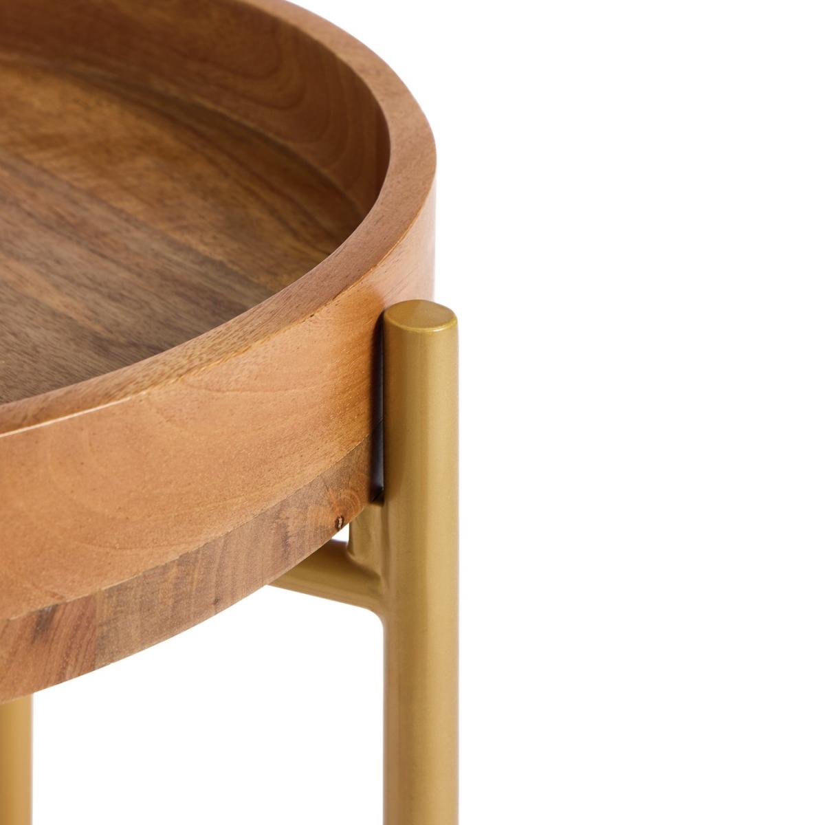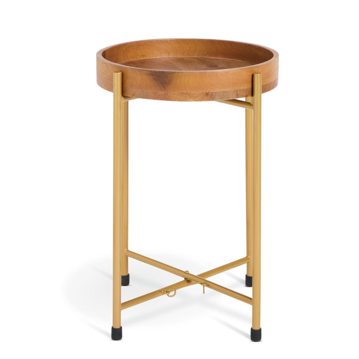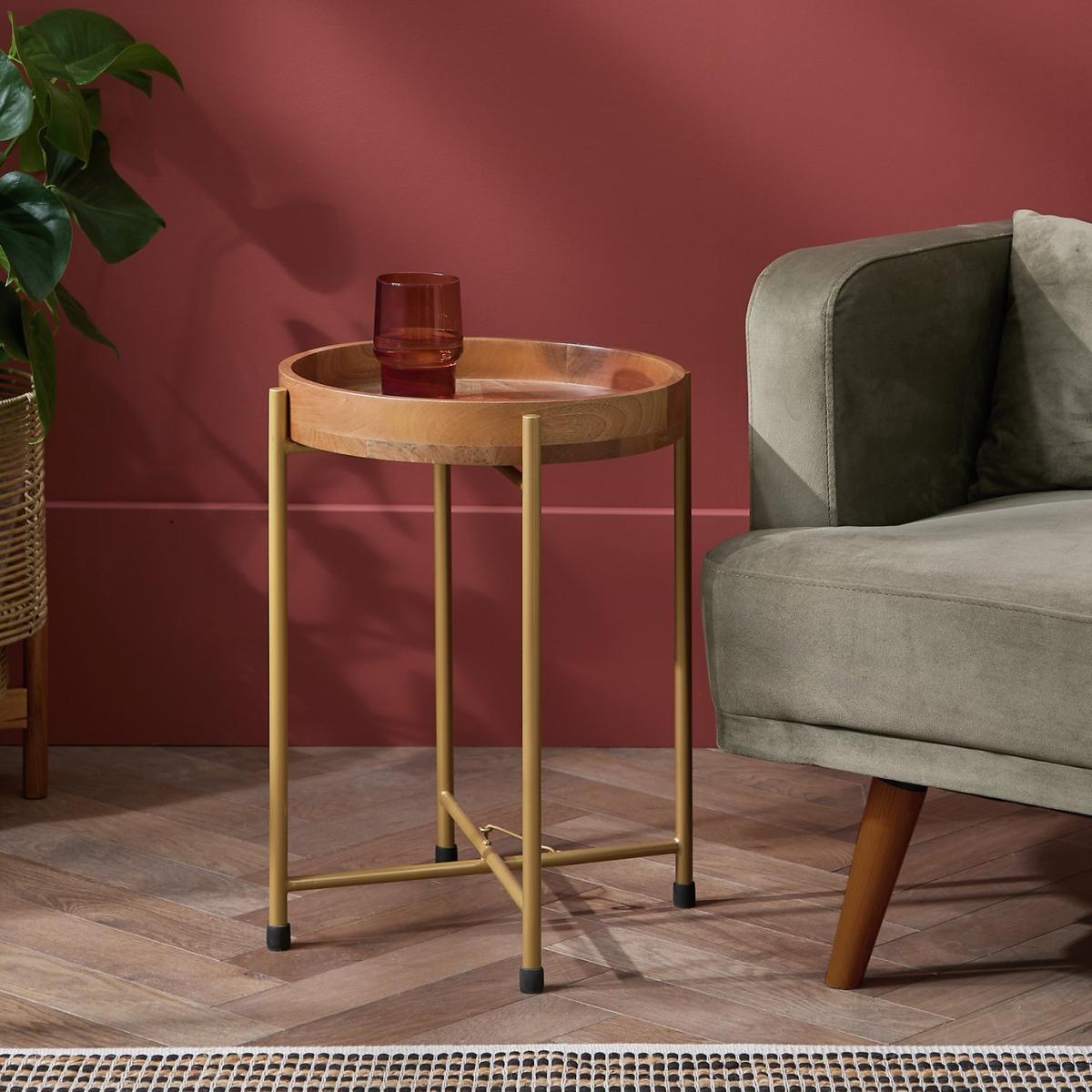 Tray chic. Aleda's here to hold the goods and steal the spotlight. With a natural wood top that doubles as a tray and sleek gold legs, it's minimal but glam. The perfect perch for coffee, a candle or your collection of snacks. Sofa-side, bedside, wherever-you-like-side, it fits right in. And stands right out. Part of the Aleda collection. Size H 50.16, W 40, D 40cm. Folded table width 40cm. Made from solid wood and metal. Weight 2.55kg. Self-assembly - 2 people recommended. Maximum load weight 8kg. Package Dimensions: Package 1 dimensions: H58.5, W11.5, D47cm. Package 1 weight: 5kg. General information: By choosing FSC certified products, you are supporting responsible management of the world's forests. Manufacturer's 1 year guarantee.