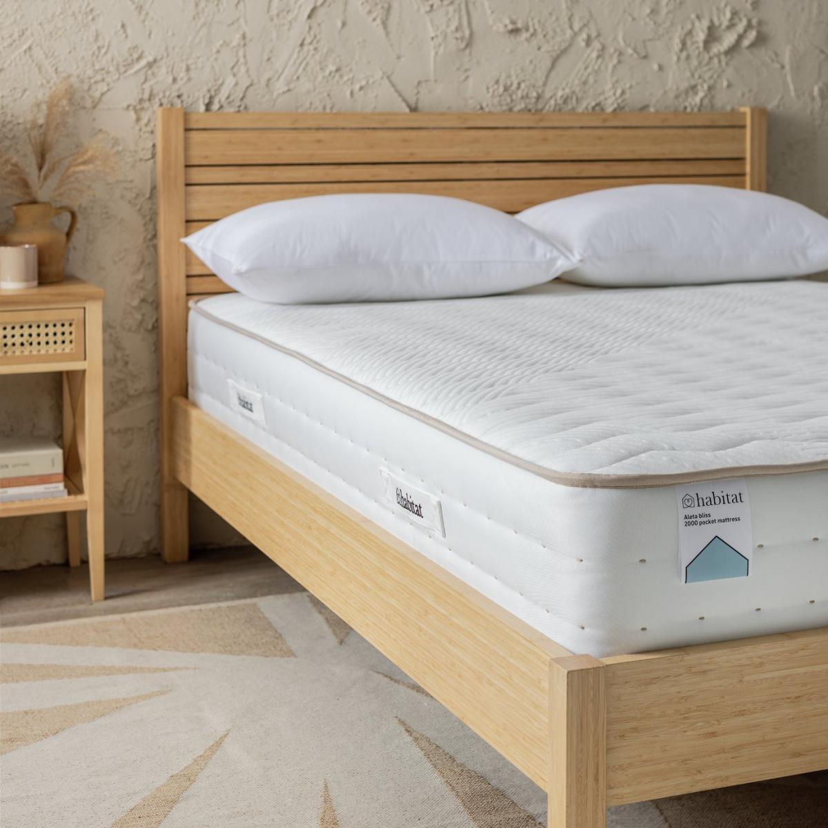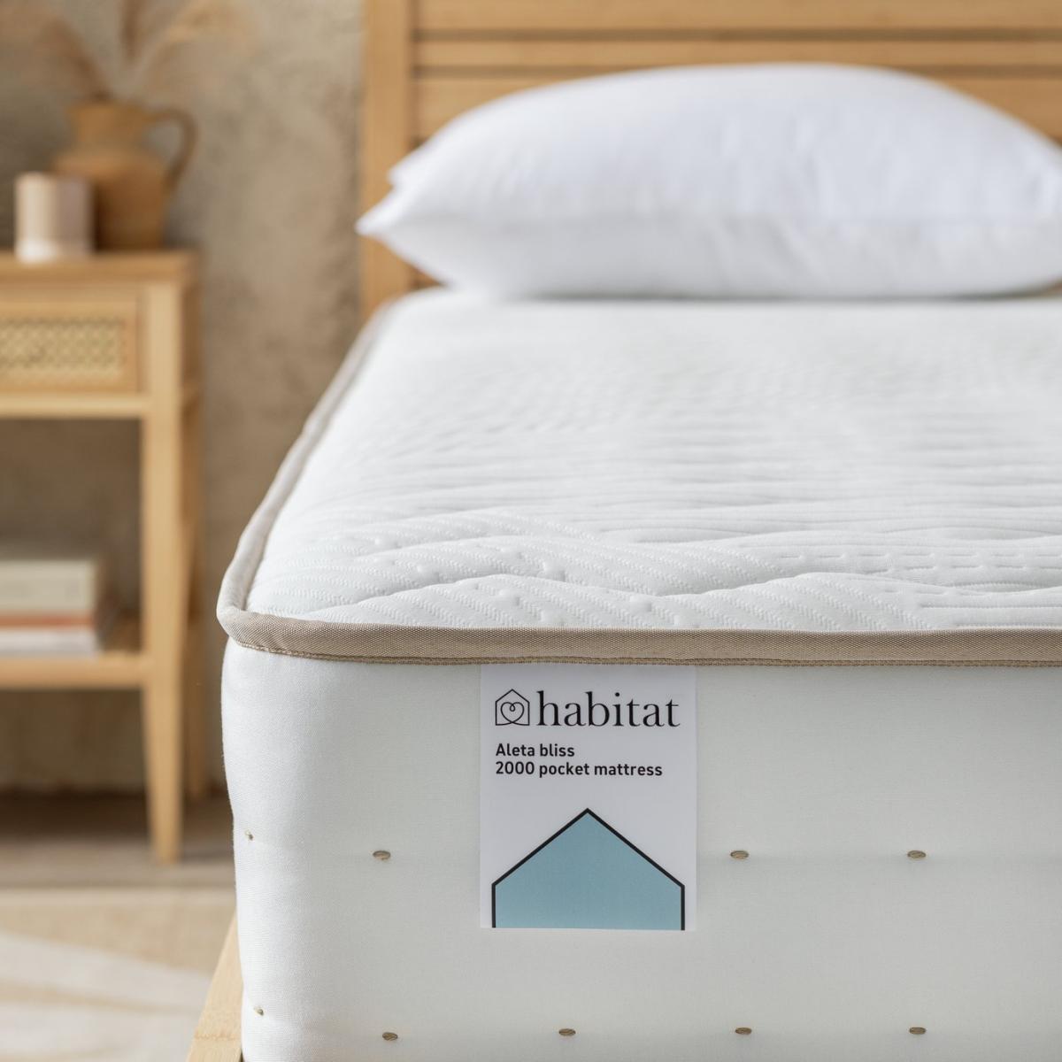 Sleep naturally. Our ultra-comfortable double Aleta mattress is filled with organic cotton, plus bamboo, Tencel, flax and hypoallergenic, breathable cushioning layers. The fabric also has an anti-allergy treatment. Foam free and quilted, the 2000 individually responsive pocket springs mellow any movement. No wonder this mattress is called Bliss. Easy to care for. No need to turn this mattress. A simple, regular rotation keeps it in tip top shape. At Argos Home we want you to get the best night's sleep possible, so we offer a 100 night comfort promise on our mattresses. Try your new mattress for up to 100 nights and if you aren't sleeping soundly, we'll offer you an exchange for one that suits you better. Part of the Aleta collection. Medium feel. Pocket sprung mattress with 2000 springs. Knit cover with quilted finish. No roll together. Anti allergy. Mattress size W135, L190, D27cm. No-turn mattress. Rotate mattress regularly. Made in the UK.