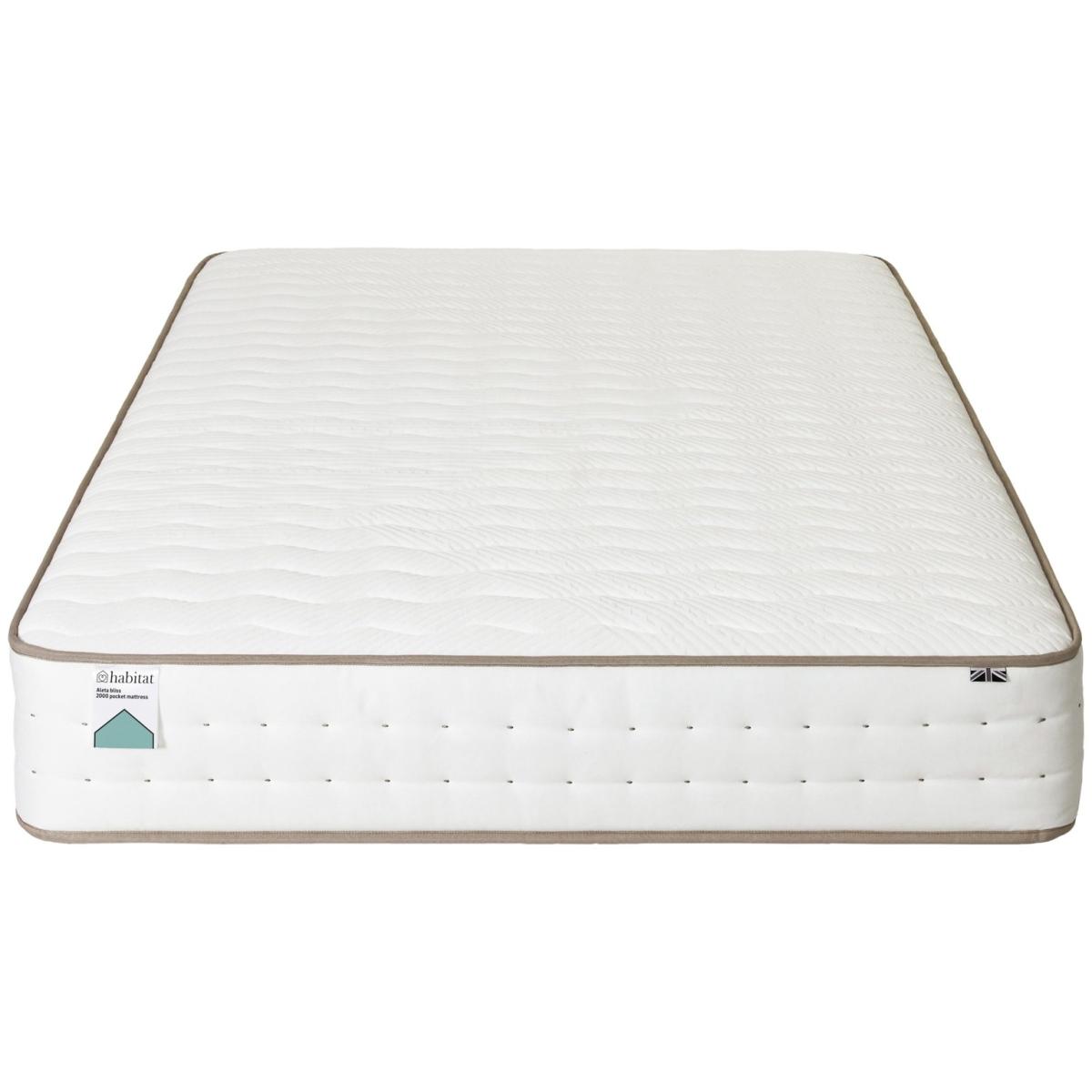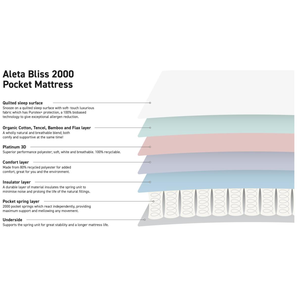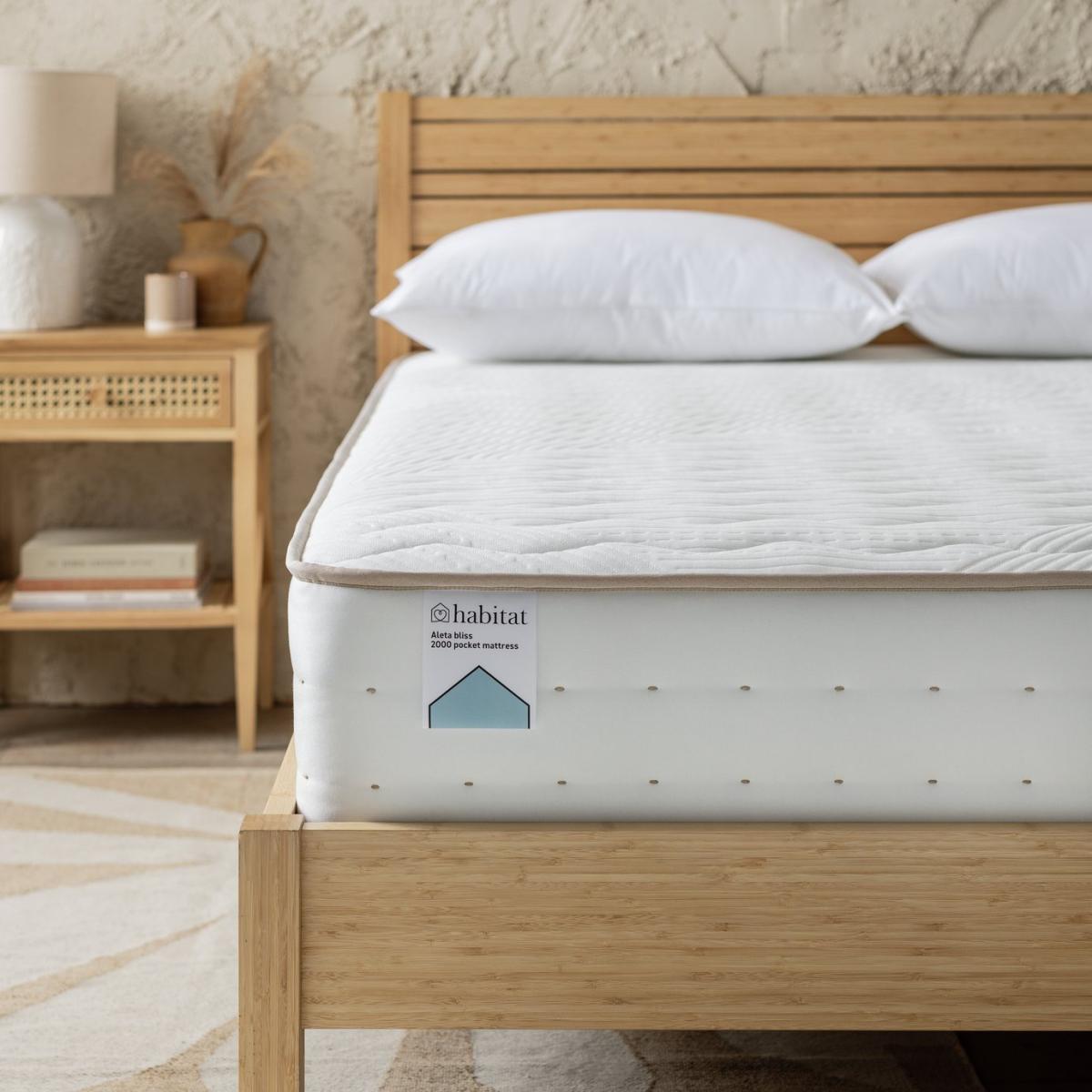 Sleep naturally. Our ultra-comfortable king size Aleta mattress is filled with organic cotton, plus bamboo, Tencel, flax and hypoallergenic, breathable cushioning layers. The fabric also has an anti-allergy treatment. Foam free and quilted, the 2000 individually responsive pocket springs mellow any movement. No wonder this mattress is called Bliss. Easy to care for. No need to turn this mattress. A simple, regular rotation keeps it in tip top shape. At Argos Home we want you to get the best night's sleep possible, so we offer a 100 night comfort promise on our mattresses. Try your new mattress for up to 100 nights and if you aren't sleeping soundly, we'll offer you an exchange for one that suits you better. Part of the Aleta collection. Medium feel. Pocket sprung mattress with 2000 springs. Knit cover with quilted finish. No roll together. Anti allergy. Mattress size W150, L200, D27cm. No-turn mattress. Rotate mattress regularly. Made in the UK.