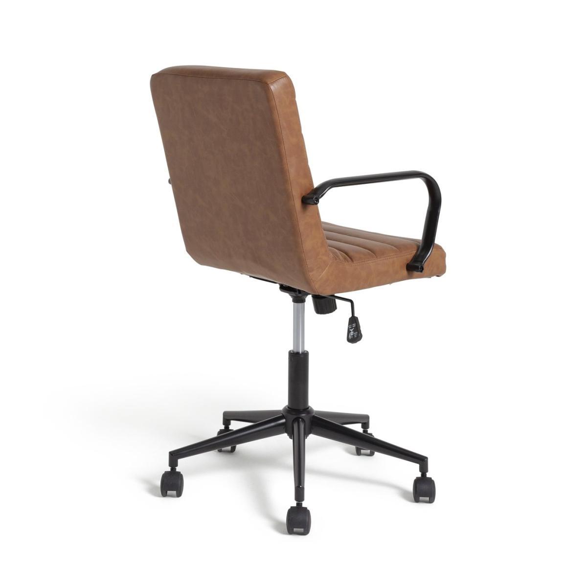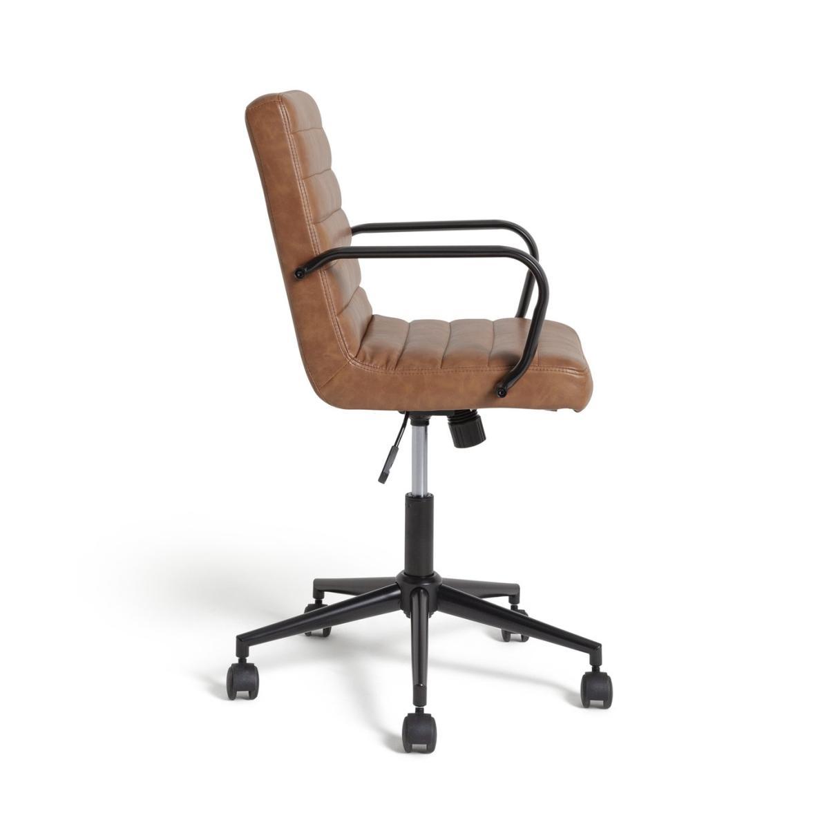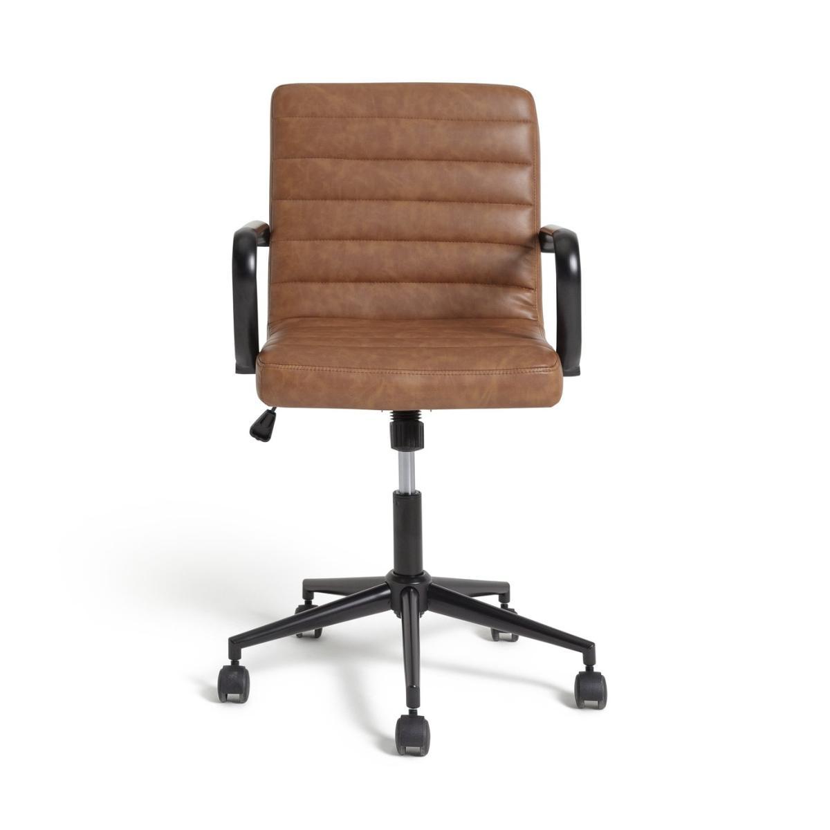 I love this office chair for its timeless tan faux leather finish, which adds a warm, inviting touch to any workspace. It pairs well with both modern and vintage interiors, working particularly well in neutral or earthy colour schemes. It’s a practical choice for creating a professional yet relaxed environment. To style around it, consider adding a soft throw or colourful cushions to soften the look or pairing it with a sleek desk for a functional set-up. Its understated design means it can easily blend into a variety of home offices, making it a versatile addition that’s both comfortable and stylish.