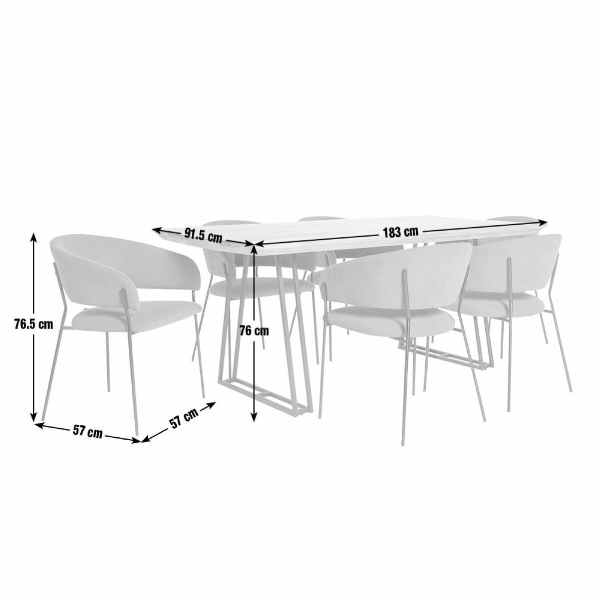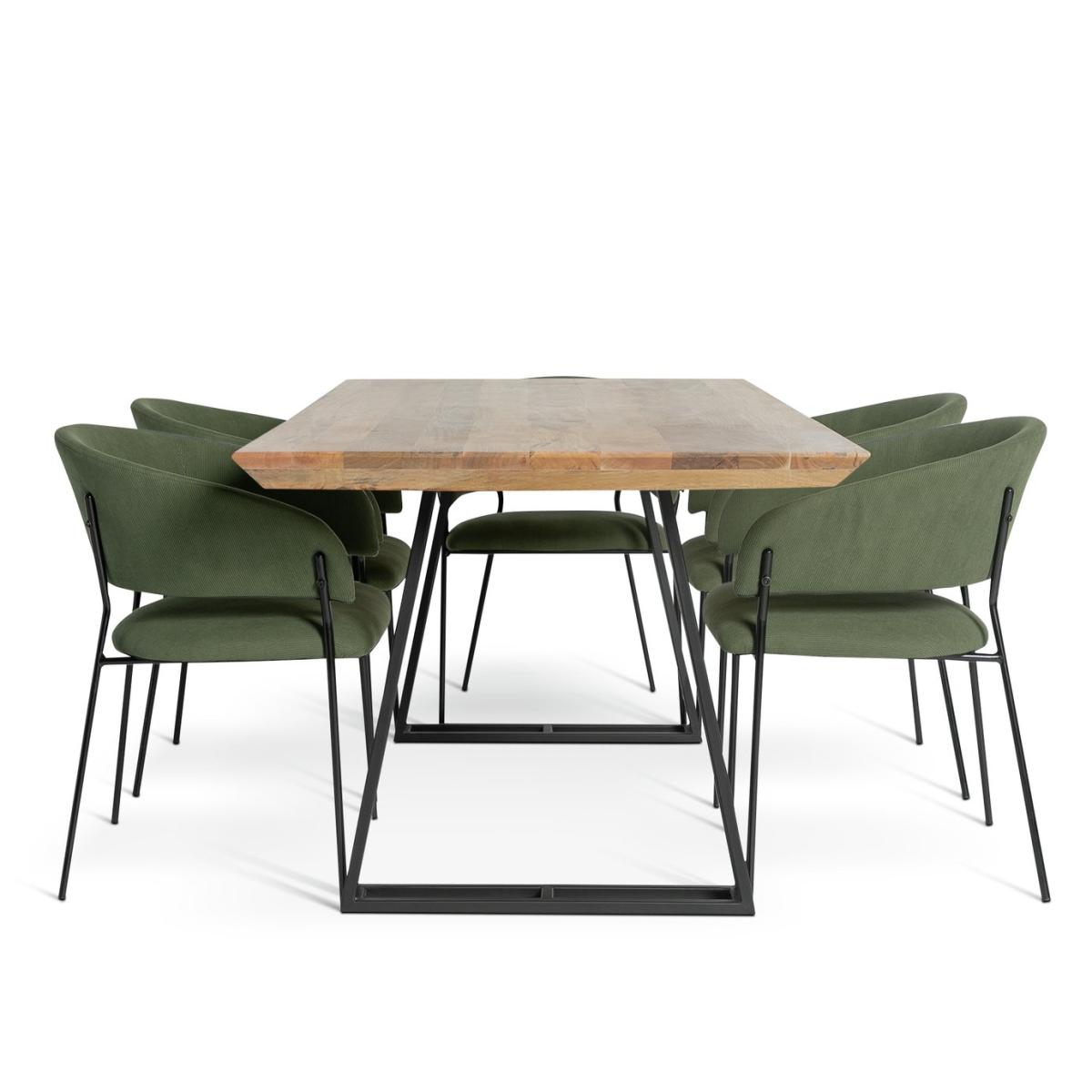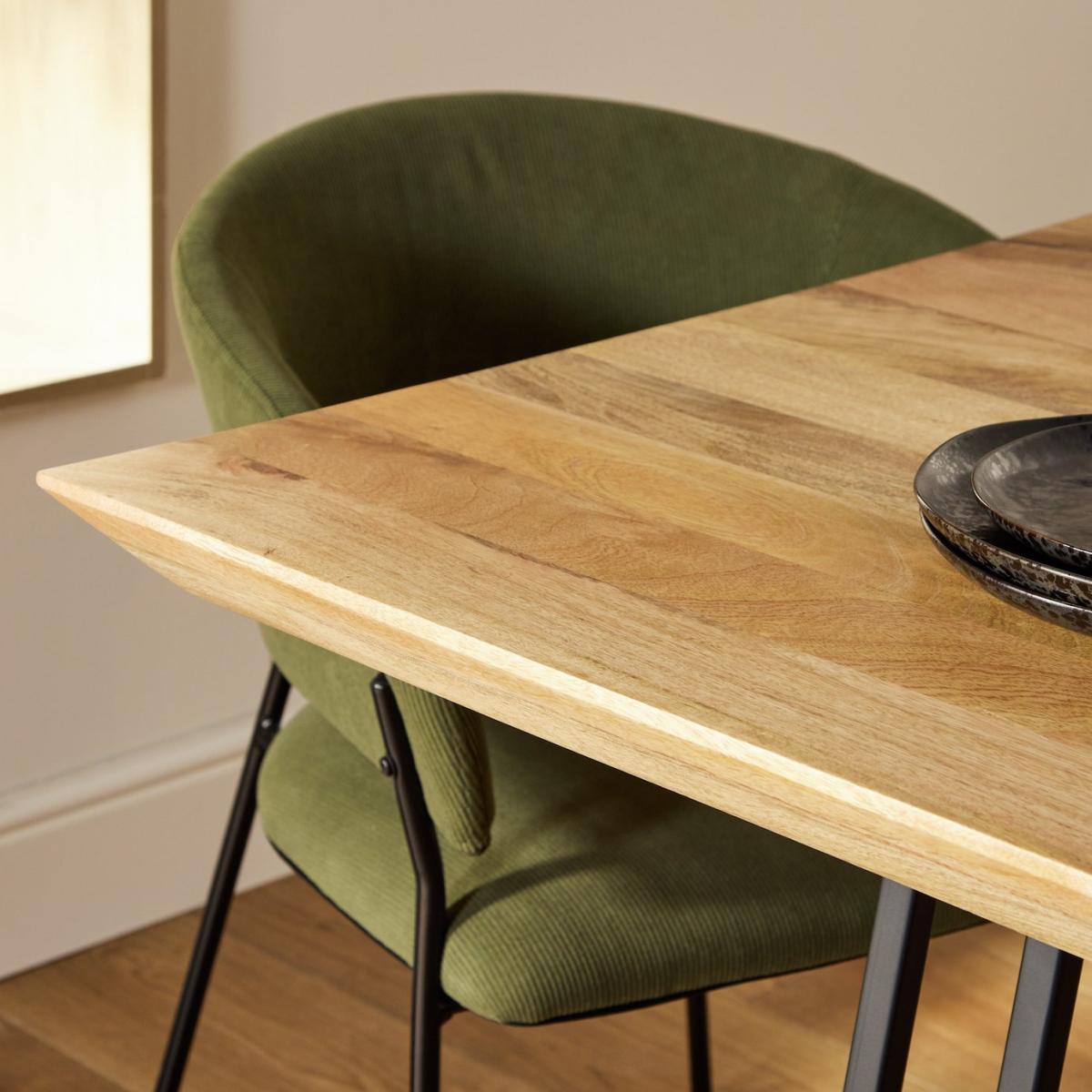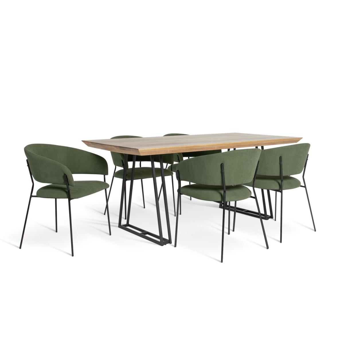 Simple lines, standout style. The Amory dining set blends rich mango wood, corded fabric and black metal for a contemporary industrial feel. The spacious tabletop provides plenty of room for family dinners or friendly get-togethers. Olive green curvaceous chairs add a pop of colour and comfort. Relaxed, refined, and made for everyday living. Part of the Amory collection. Table: Table size H76, W91.5, L183cm. Solid wood table with metal legs. Solid wood table top finish. Chair: Includes 6 chairs. Size of each chair H76.5, W57, D57cm. Metal frame with metal legs. Fabric seat pad. Maximum user weight per chair 130kg. Individual chair weight 6.5kg. Package Dimensions: Table package 1 size H193, W31, D99cm. Individual chair package size H71.5, W57.5, D59cm. General information: Self-assembly - 2 people recommended. Manufacturer's 1 year guarantee. Wipe clean with a damp cloth. By choosing FSC certified products, you are supporting responsible management of the world's forests.