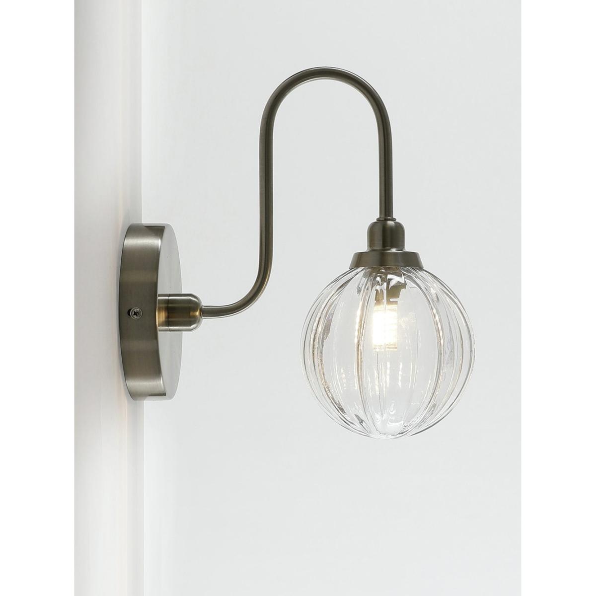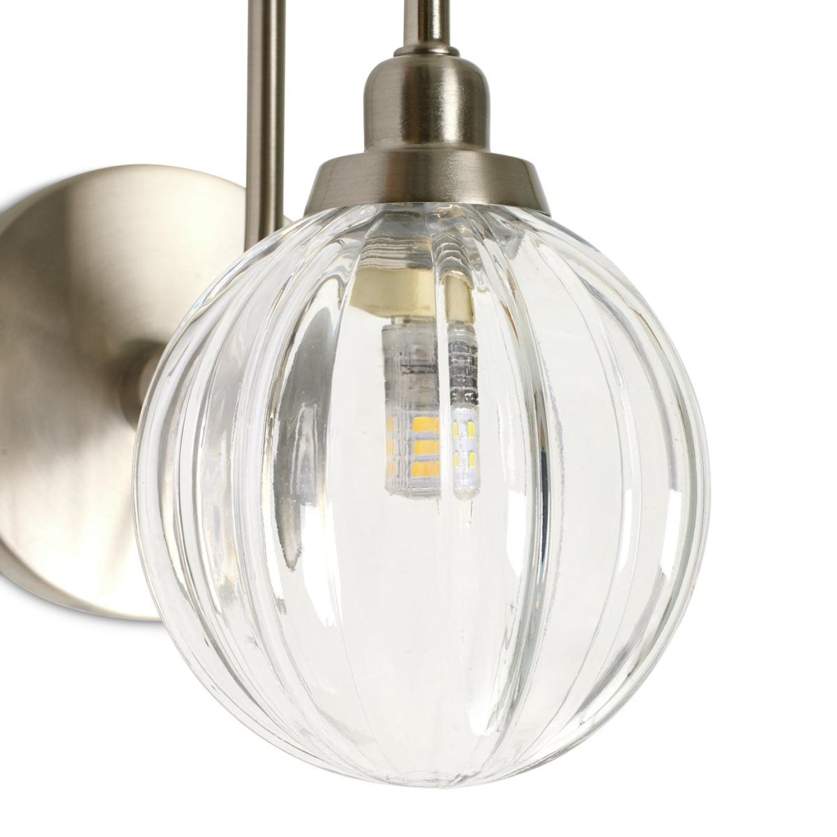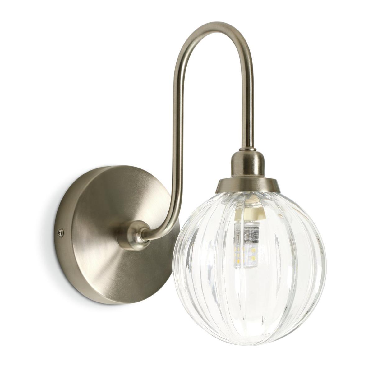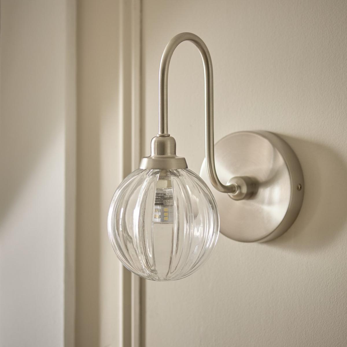 Set the mood with this ribbed glass wall light. Its soft glow adds warmth, making your home feel more inviting. The satin nickel base, with its brushed chrome tone, pairs beautifully with the clear glass globe. Simple. Elegant. Full of character. A timeless addition to elevate your space. Dimensions: Size H25, W12, D22.5cm. Diameter 12cm. None adjustable drop. Bulb Information: Bulbs required 1 x classic capsule G9 LED (included). Recommended maximum wattage: 5 watts. Can not be used with a dimmer switch. LED bulb only. General Information: Metal & Glass. - not suitable for bathroom use. Weight: 1.16kg. Minimal assembly. Product is mains powered plug in. This lighting product is a class 2 fitting. Manufacturer's 1 year guarantee.