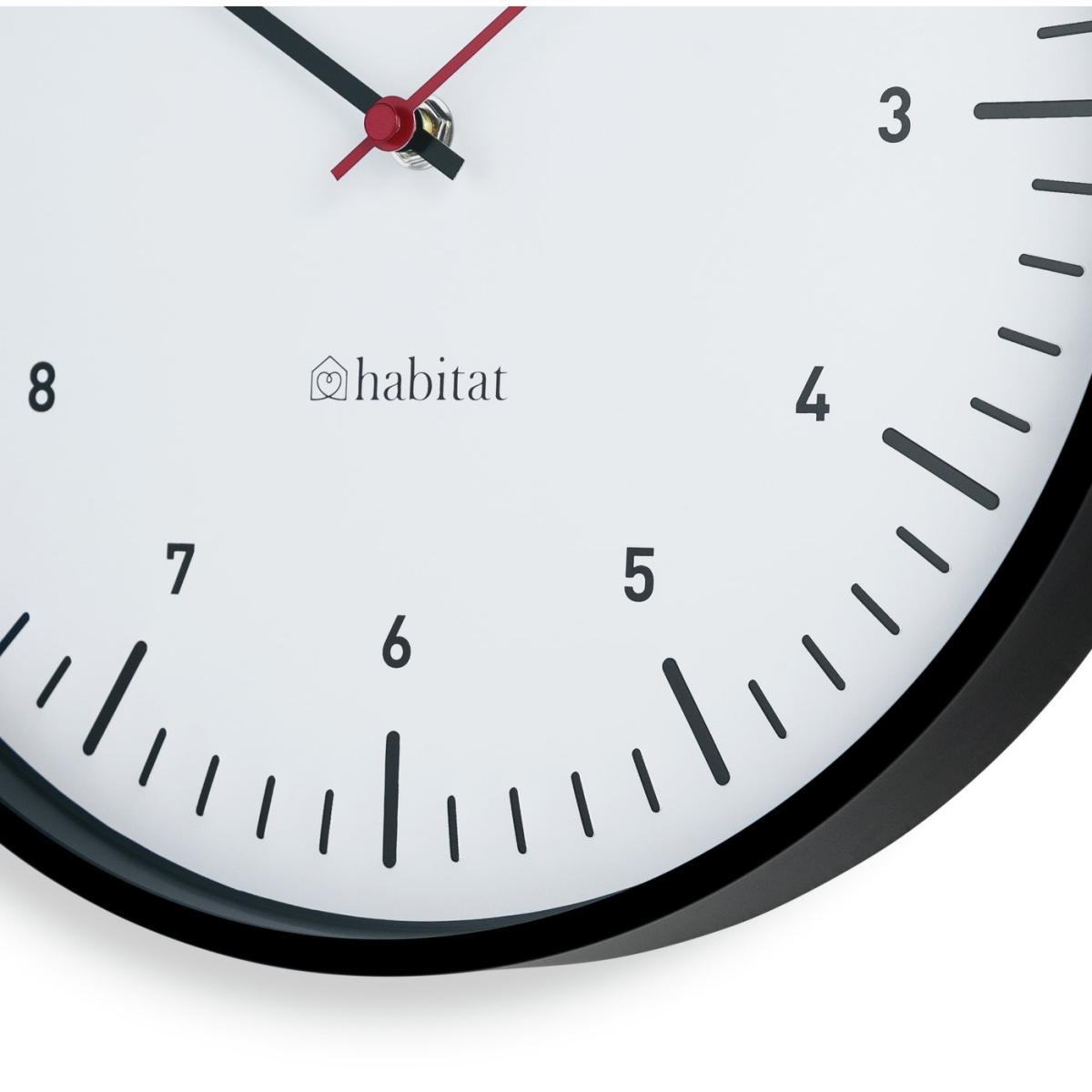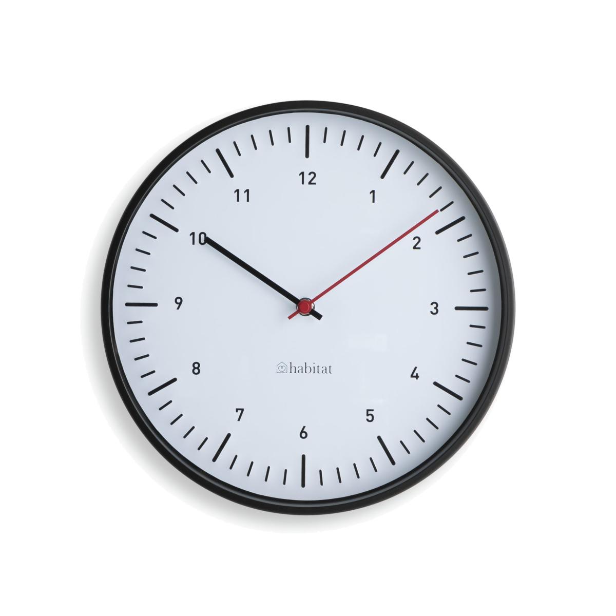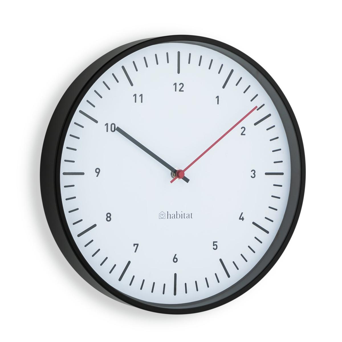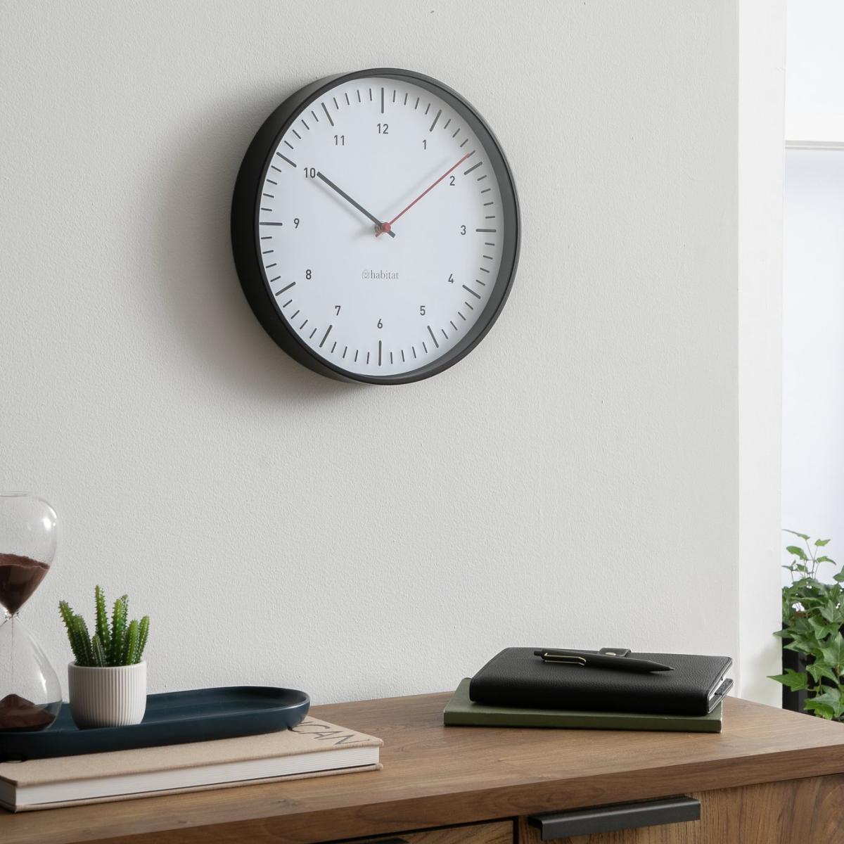 Keep track of the minutes and hours with ease. Our simple wall clock comes with 1 minute interval spacers as well as long hands and an easy-to-read face. With a quartz movement, it is battery operated and easy to hang. Quartz movement. Diameter 30cm. Size H30, W4.5, D30cm. Analogue display. Batteries required 1 x AA (not included). Manufacturer's 1 year guarantee.