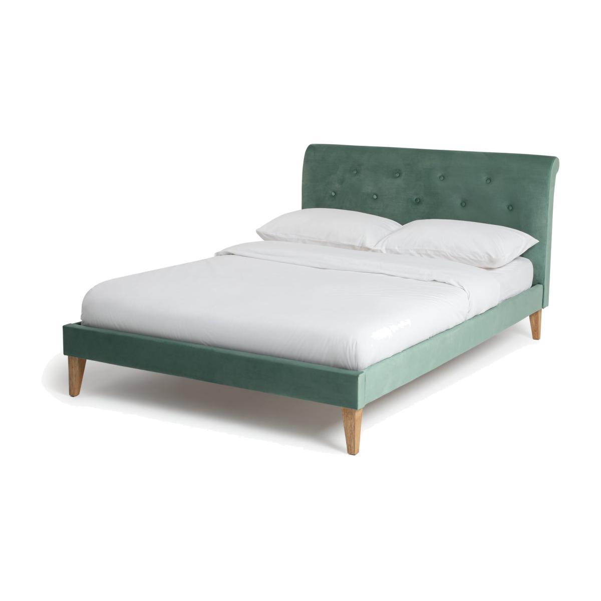Classic and full of character. This beautiful bed frame in soft green is a real statement piece with a luxe and dreamy velvety feel. Tapered wooden legs add a modern twist. Surprising a special someone with breakfast in bed? Our tall and handsome, buttoned scroll headboard has your back, and theirs. Sprung slats support you for a good night's rest, too. Snuggle up, let's get cosy.