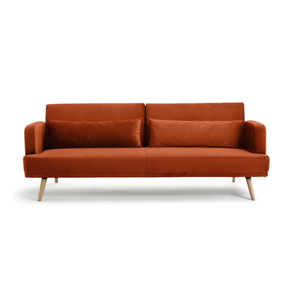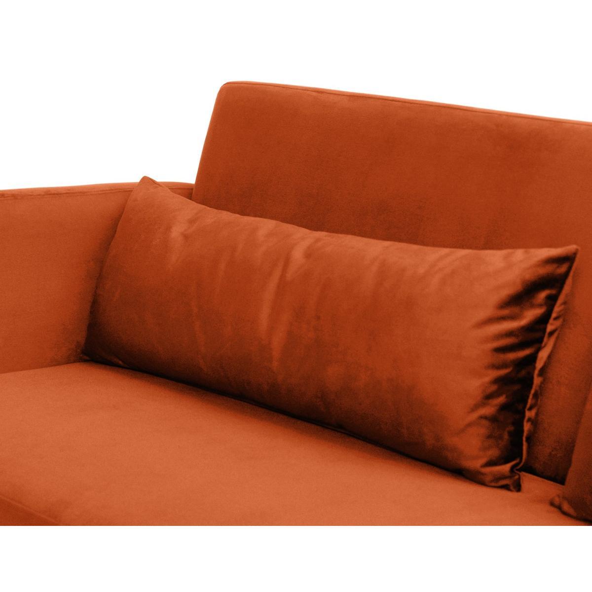 Clic clac, lie me flat. From designer sofa to overnight double bed in seconds. Amazing. Upholstered in flame orange velvet, I am also a contemporary sofa to yearn for. With a soft but firm foam fibre-wrapped seat and 2 gorgeous foam filled bolster cushions, you'll definitely be sitting comfortably. Spread out and sprawl, put your feet up, click the remote on, and let's try a night in together.