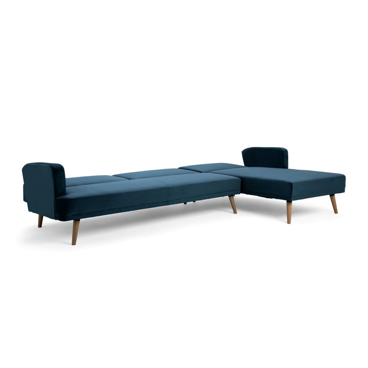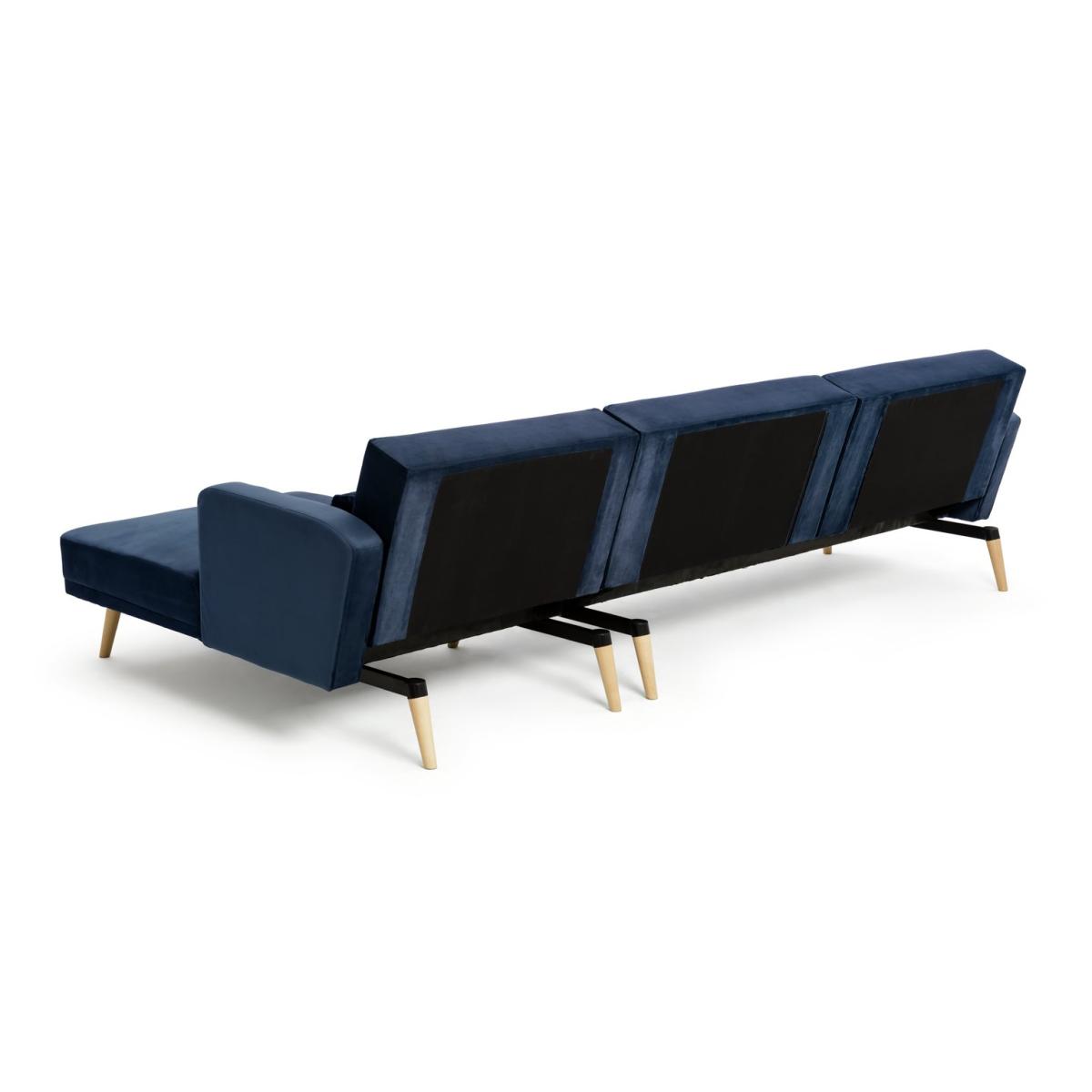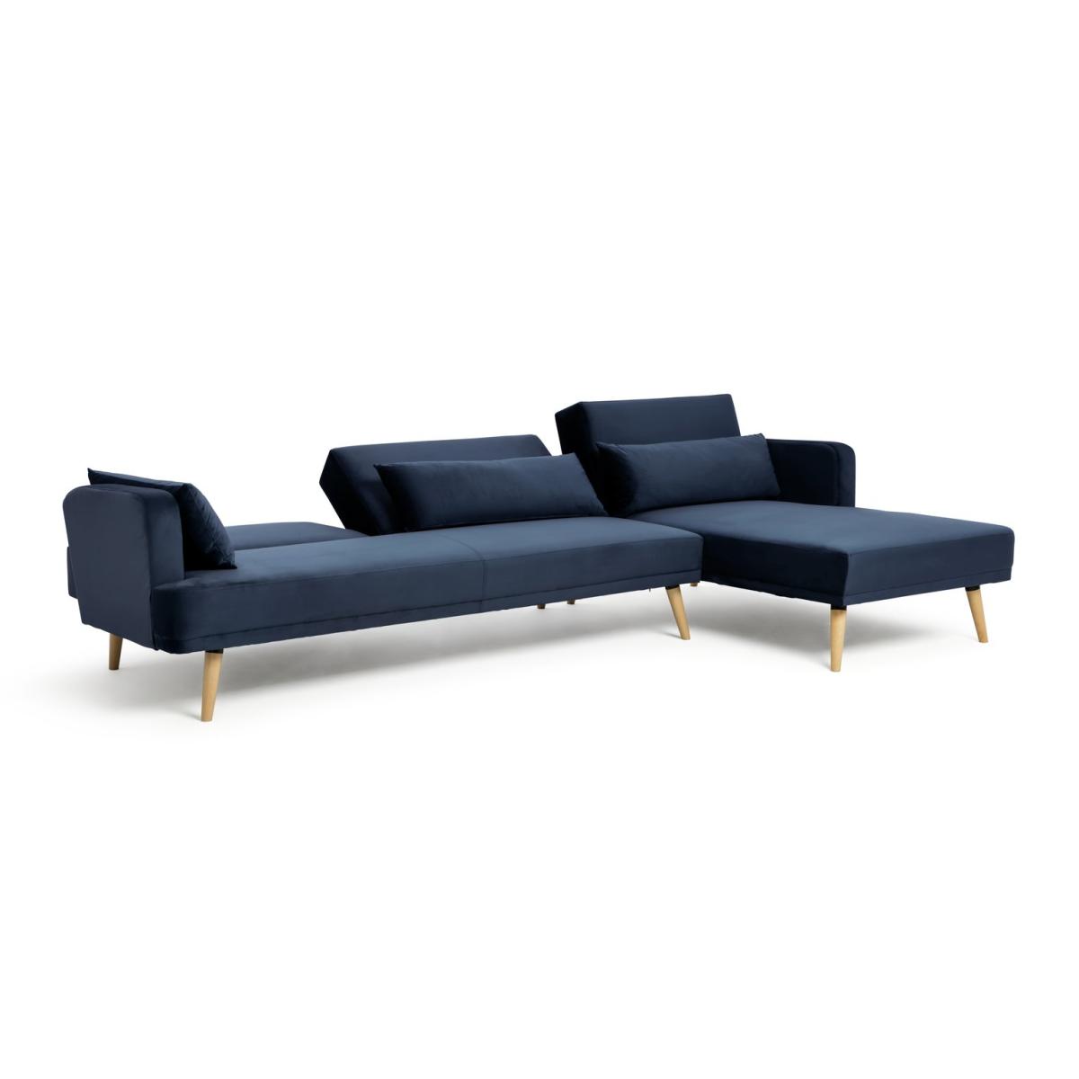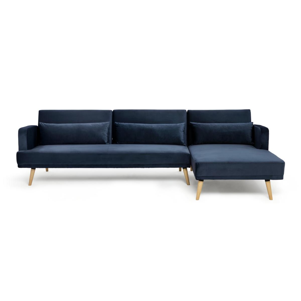 Chaise lounge, chaise sleep. Here's a practical solution to a spare bed problem that's doesn't compromise on style. Upholstered in rich navy velvet, our right corner sofa bed displays its clean modern lines and generous seating. Need a spare bed? With a simple, click, clack movement our 3 seater chaise sofa bed folds down into a compact double. Very handy, Andy.