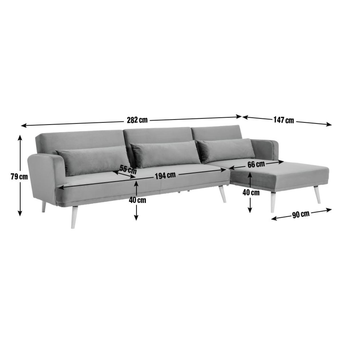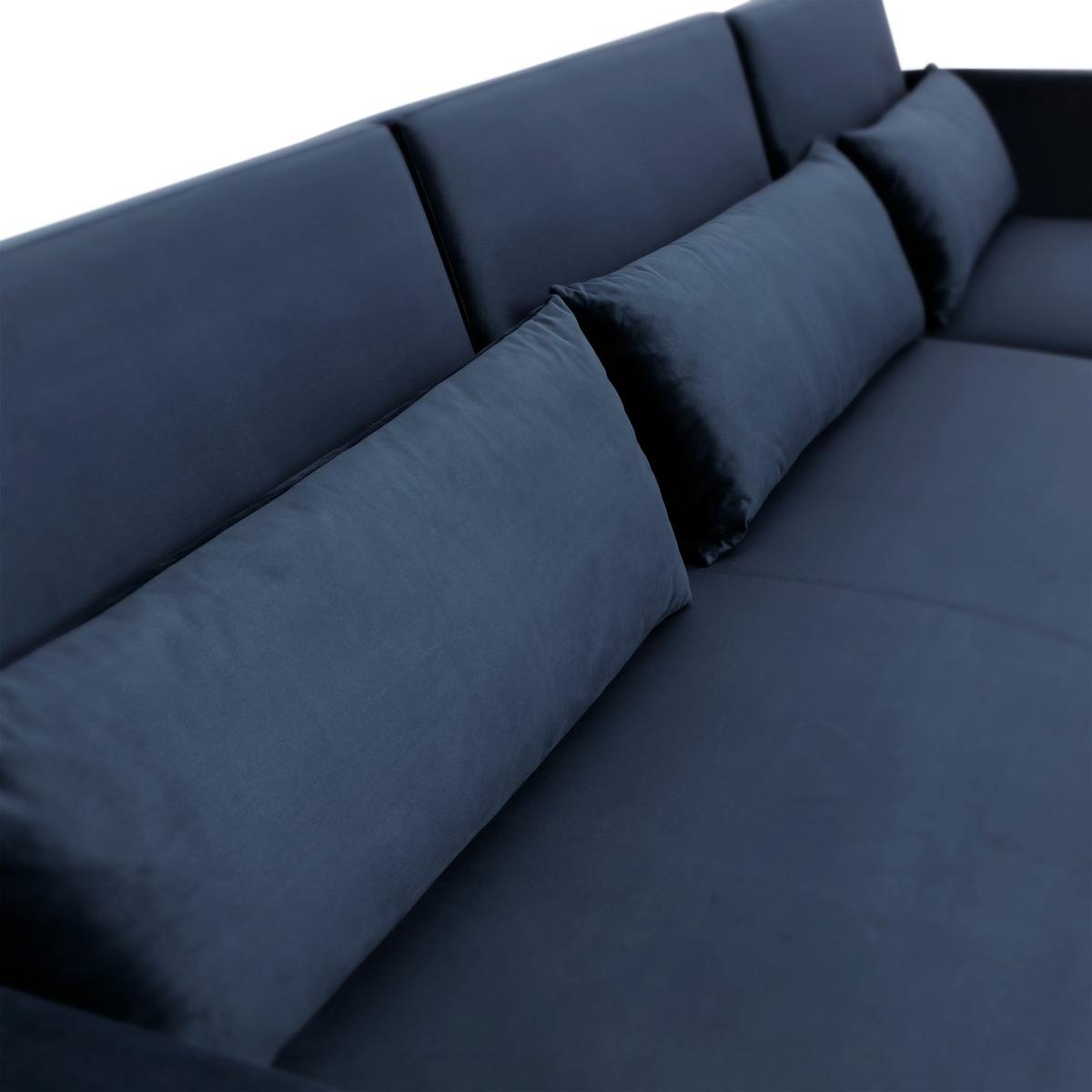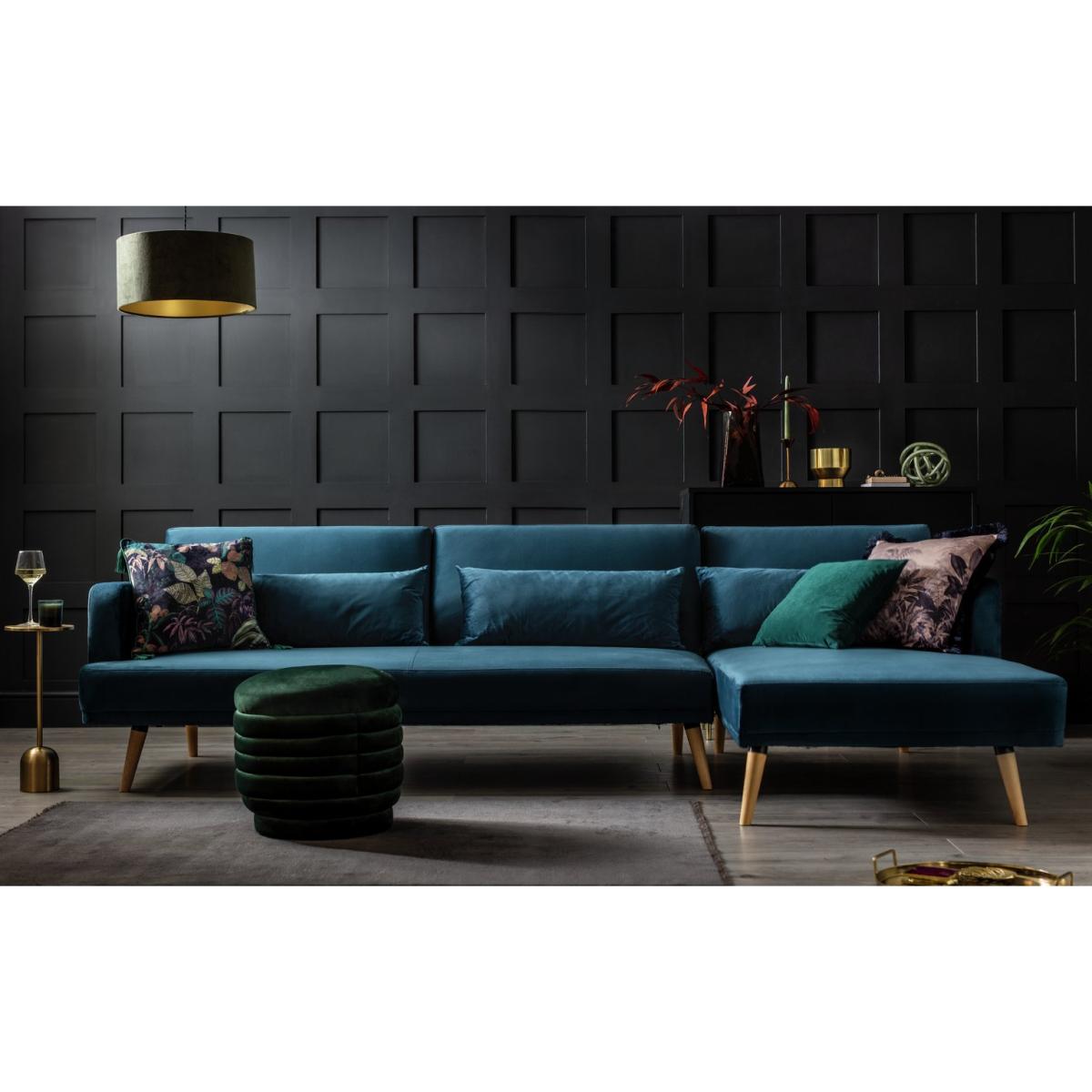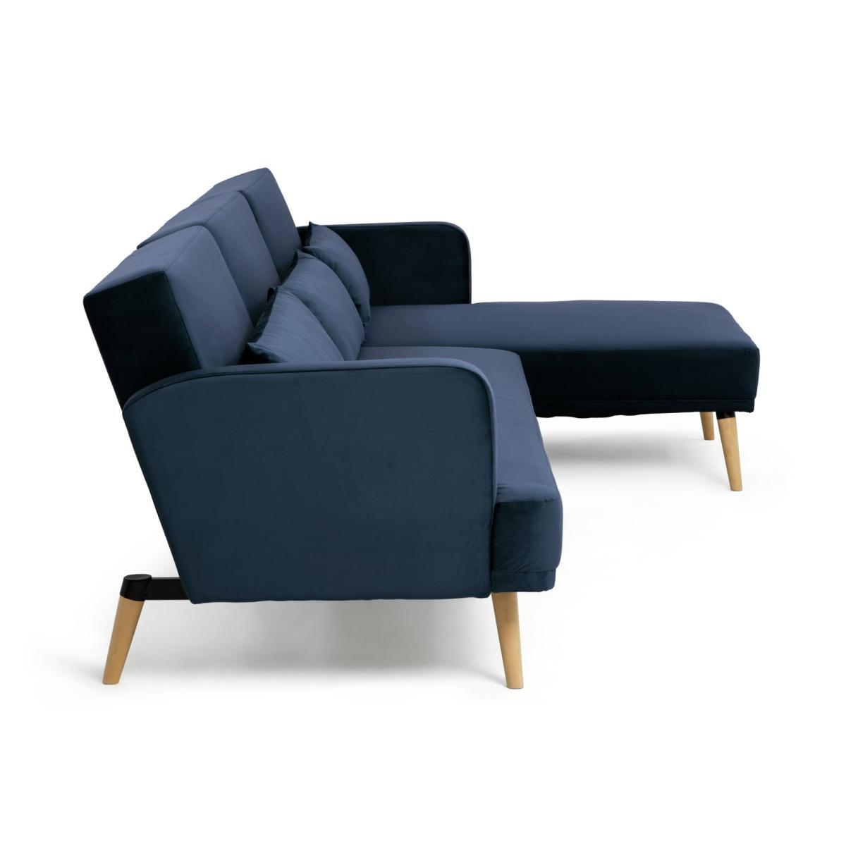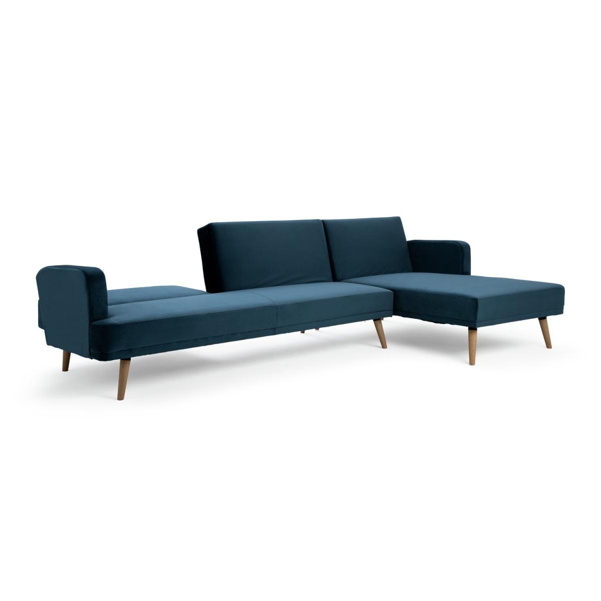 Chaise lounge, chaise sleep. Here's a practical solution to a spare bed problem that's doesn't compromise on style. Upholstered in rich navy velvet, our right corner sofa bed displays its clean modern lines and generous seating. Need a spare bed? With a simple, click, clack movement our 3 seater chaise sofa bed folds down into a compact double. Very handy, Andy.