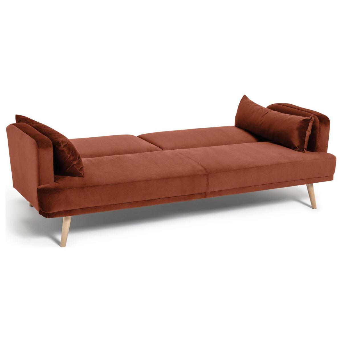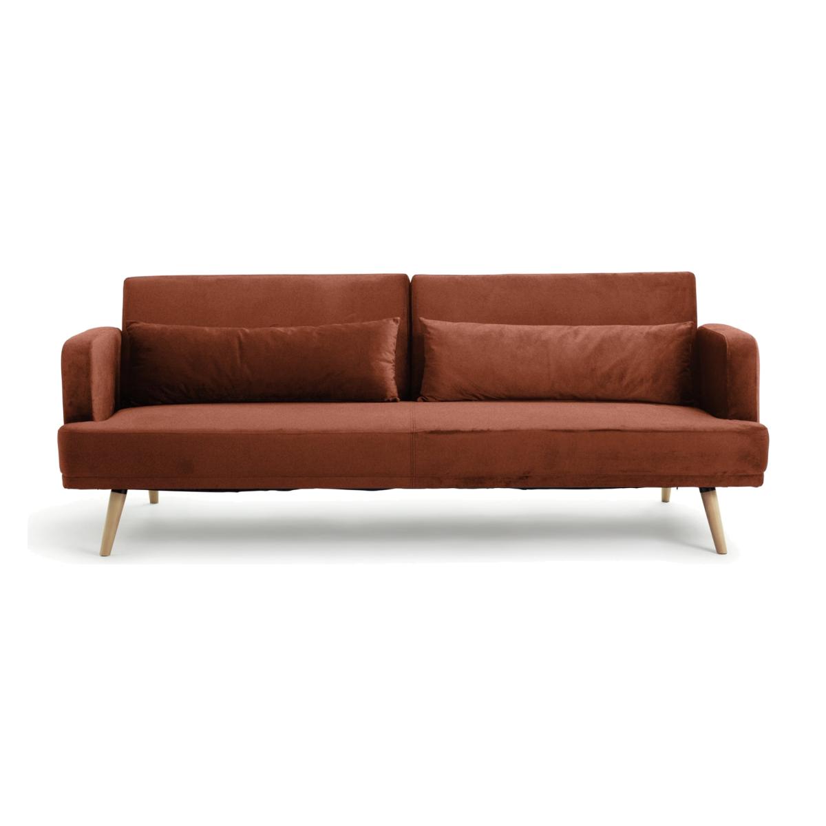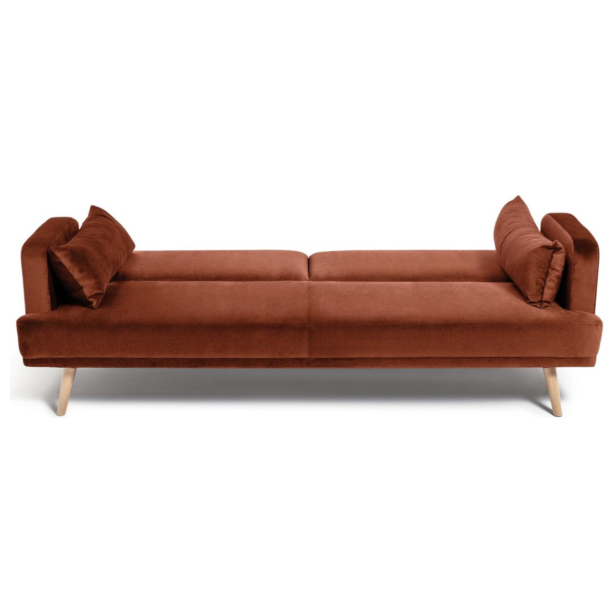 Sofa by day. Bed by night. The Habitat Andy embraces sleek scandi styling with its slender arms, angled legs and rich rust hue. And when you need a spare bed, Andy comfortably converts in seconds. The fabulous long cushions even double as pillows as well as giving the sofa a charming finish. A multi-functional marvel. Part of the Andy collection. Clic clac mechanism. Small single bed. Material: Made from 100% velvet. Fixed seats with foam fibre wrap filling. Removable cushion(s) with fibre filling. Free fabric swatch available on this line. Dimensions: Sofa size H82, W214, D90cm (Depth as bed 110cm). Size of sleeping area:W110, L180cm. Mattress depth: 180cm. Floor to seat height: 40cm. Depth of seat: 56cm. Height of seat back: 42cm. Width of seating area between arms: 180cm. Height of arm rest: 63cm. Weight 45.4kg. Professional clean only. Suitable for occasional use. Plump cushions regularly to maintain shape. Self-assembly - just add feet. Maximum individual user weight 240kg. Packaged dimensions: Package size H22, W220, D113cm. General information: Manufacturer's 2 year frame guarantee. FSC certified meaning the materials used for this product are responsibly sourced.