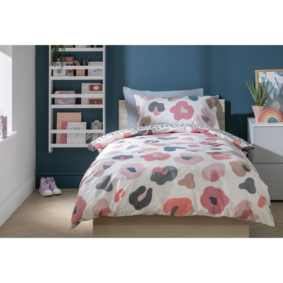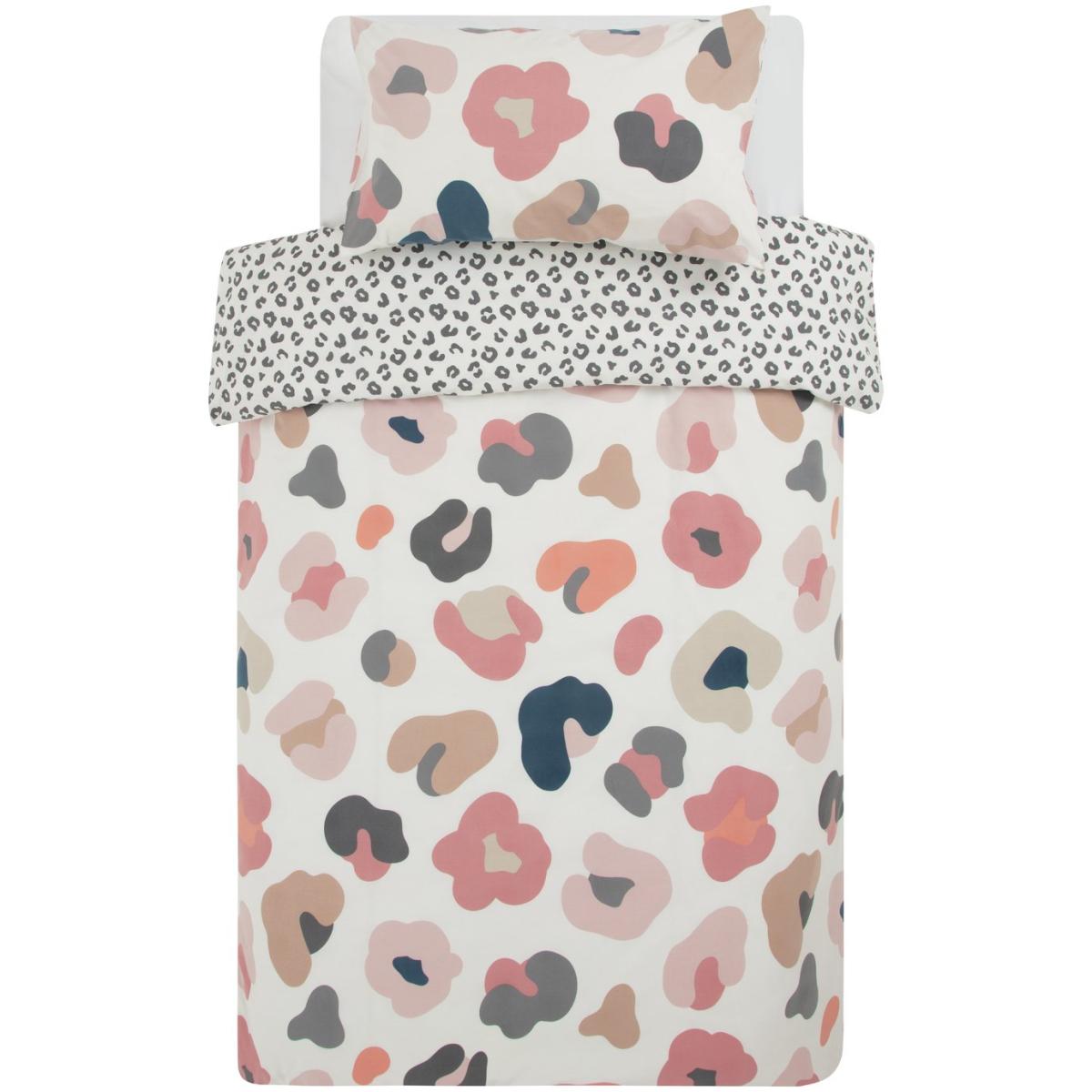 There's no camouflaging this flamboyant animal print single bedding set. An abstract take on a classic design it adds real wow to the bedroom. In the tones of pinks and greys and with a monotone reverse, you can ring the changes in an instant. Go on, go wild and make someone happy with this fabulous duvet set. This item carries the STANDARD 100 by OEKO-TEX logo, which means you can be certain that every component has been tested for harmful substances and is therefore harmless to human health. Set comprises of 1 duvet cover and 1 pillowcase. White and pink colourful paws print pattern. Finish: woven. Size L200 x W135cm. Pillow case length 75cm, Width 50cm. Standard pillowcase (s). Reversible pillowcase (s). Buttons for fastening. Machine washable at 40 C. Suitable for tumble drying. 52% polyester, 48% cotton. 144 thread count.
