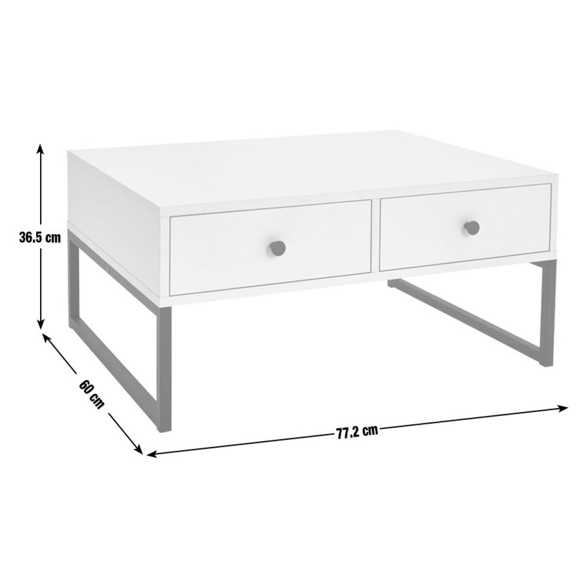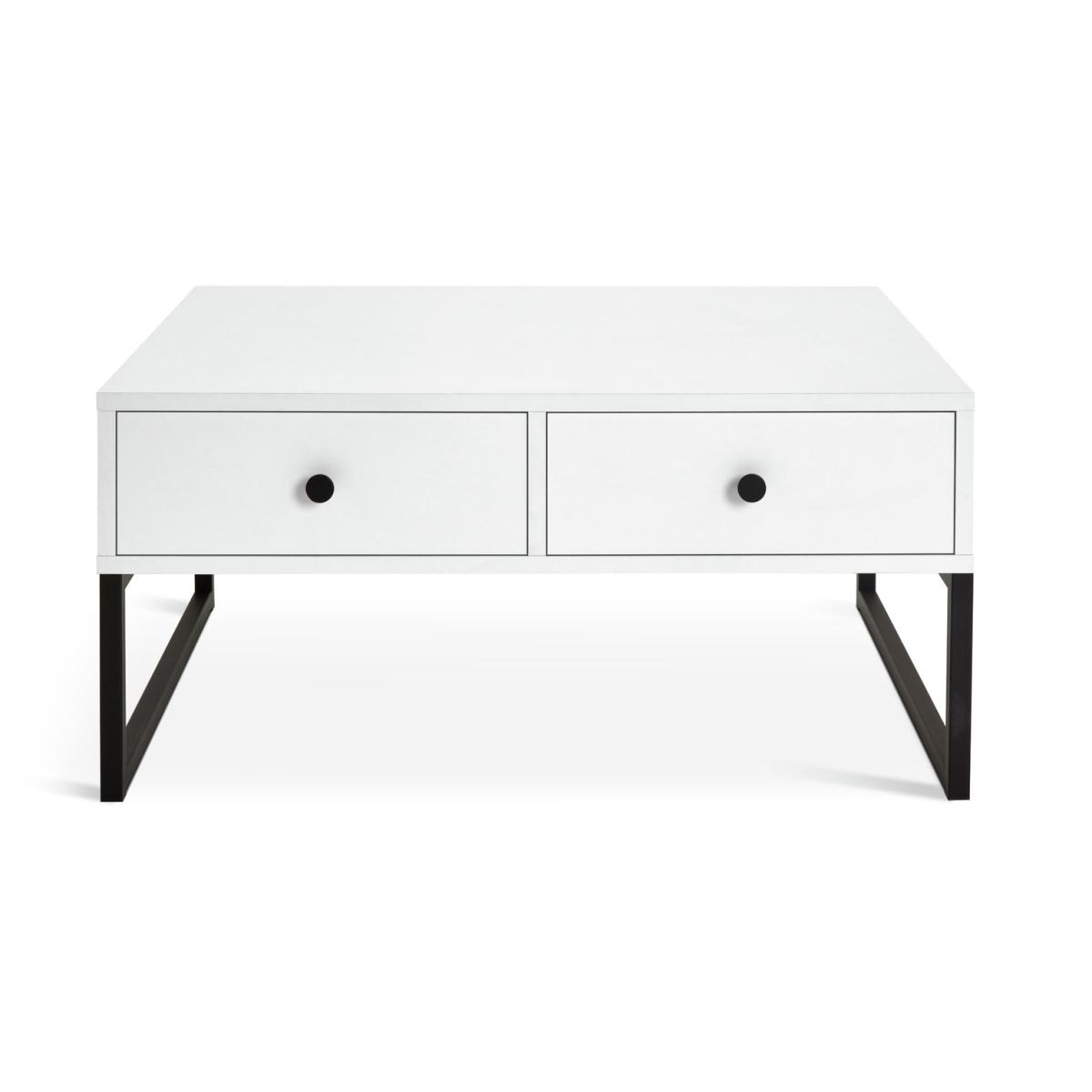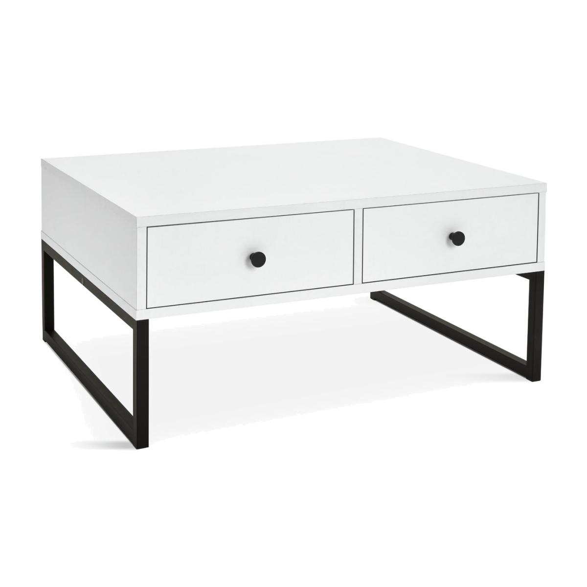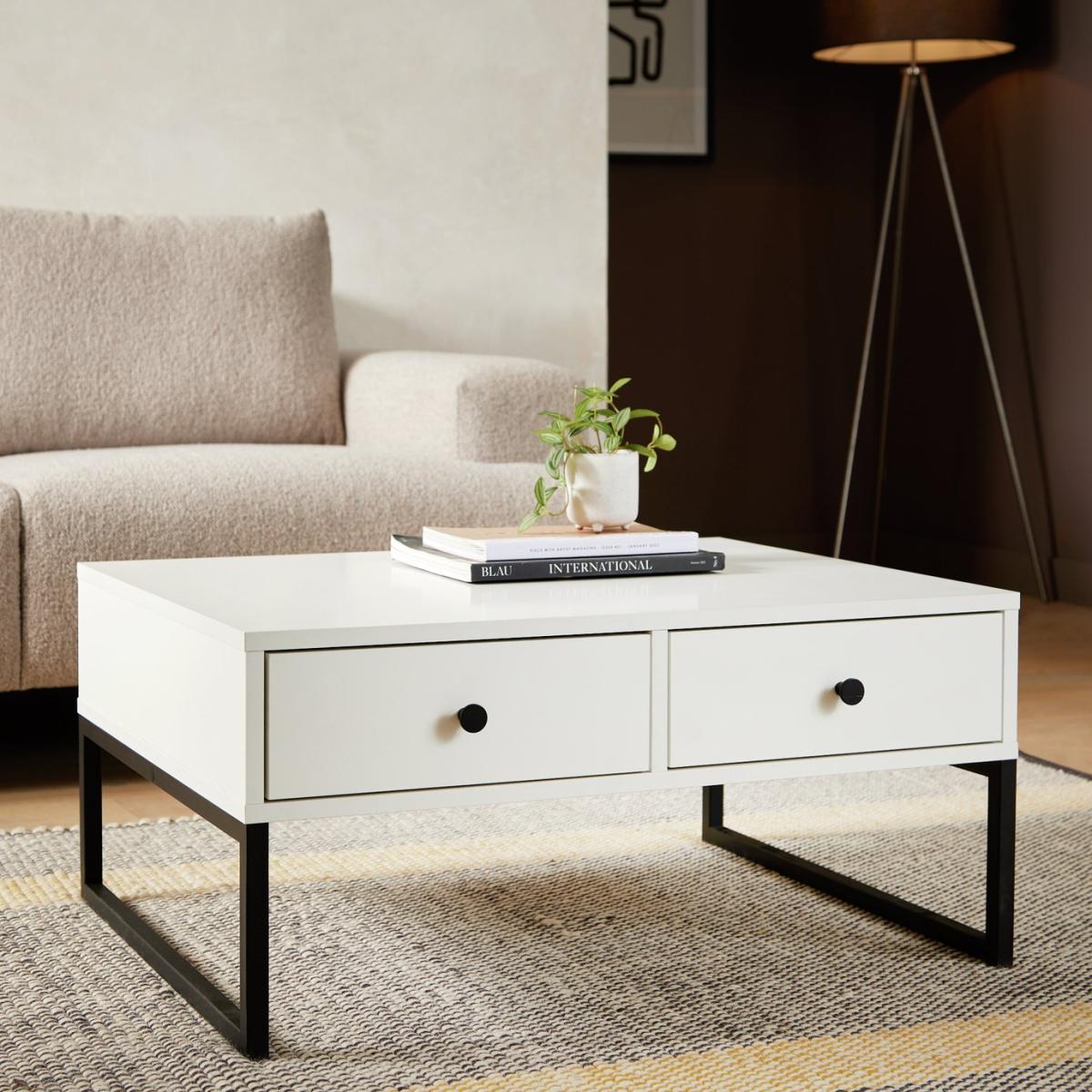 In magnificent monochrome this 2-drawer coffee table has a clean, contemporary vibe. The white against the black metal blends industrial with show home. Making the most of its footprint, the handy storage space is ideal for stashing away the little things that clutter a lounge. It's fashionable furniture that's easy to live with. Part of the Anouk collection. Size H 36.5, W 77.2, D 60cm. Made from particleboard and steel. 2 drawers with metal runners. Weight 20.5kg. Self-assembly - 1 person recommended. Maximum load weight 15kg. Package Dimensions: Package 1 dimensions: H9.3, W88.5, D63.2cm. Package 1 weight: 21.5kg. General information: Manufacturer's 2 year guarantee. FSC certified meaning the materials used for this product are responsibly sourced.