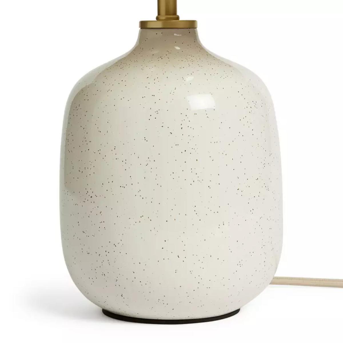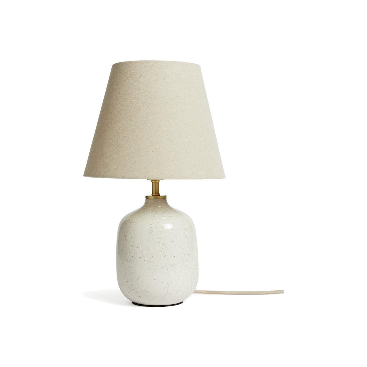 Turn on that classic charm. Shine with our delicately speckled table lamp. Crafted from white glaze ceramic, the curvy base is smoothly sophisticated. While the brass rim and stem bring a traditional feel to the table. And to top it off, a tapered, cream linen shade filters light beautifully for a cosy glow. Neutral and nostalgic. Splendid.