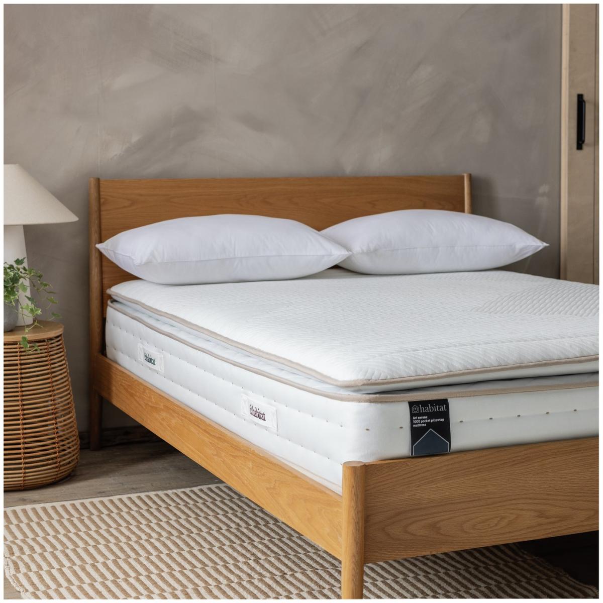 Naturally, deeply relaxing. Certified 100% British wool is the hero filling inside our Habitat exclusive quilted pillow top Ari mattress. Foam free, hypoallergenic and breathable. With an extra top layer of comfort, plus 1000 individually responsive pocket springs to mellow any movement. Just what you need for a good night's sleep. Easy to care for. No need to turn this mattress. A simple, regular rotation keeps it in tip top shape. At Argos Home we want you to get the best night's sleep possible, so we offer a 100 night comfort promise on our mattresses. Try your new mattress for up to 100 nights and if you aren't sleeping soundly, we'll offer you an exchange for one that suits you better. Part of the Ari collection. Medium firm feel. Pocket sprung with pillowtop layer mattress with 1000 springs. Knit cover with quilted finish. No roll together. Anti allergy. Mattress size W120, L190, D26.5cm. No-turn mattress. Rotate mattress regularly. Made in the UK.