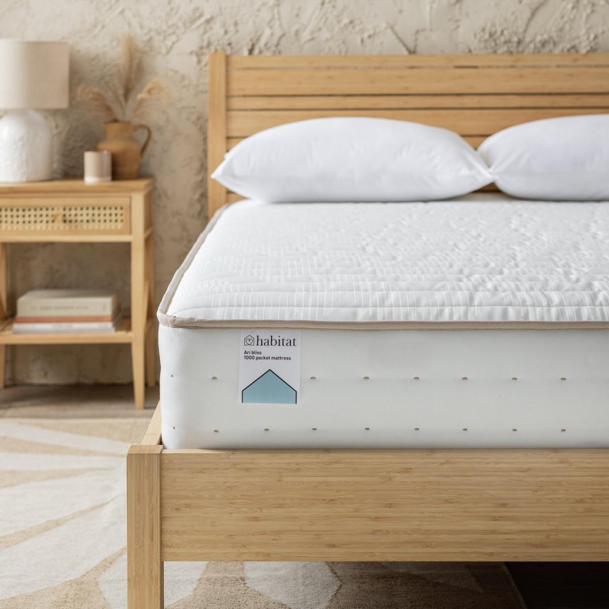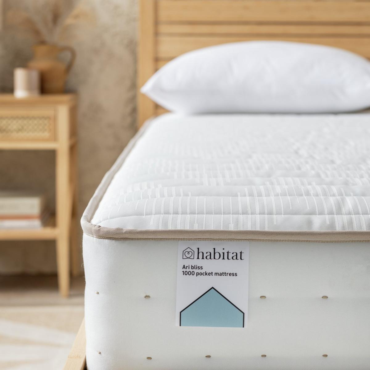 Sleep naturally. Our ultra-comfortable Ari mattress is filled with organic cotton, plus bamboo, Tencel, flax and hypoallergenic, breathable cushioning layers. The fabric also has an anti-allergy treatment. Foam free and quilted, the 1000 individually responsive pocket springs mellow any movement. No wonder this mattress is called Bliss. Easy to care for. No need to turn this mattress. A simple, regular rotation keeps it in tip top shape. At Argos Home we want you to get the best night's sleep possible, so we offer a 100 night comfort promise on our mattresses. Try your new mattress for up to 100 nights and if you aren't sleeping soundly, we'll offer you an exchange for one that suits you better. Part of the Ari collection. Medium feel. Pocket sprung mattress with 1000 springs. Damask cover with quilted finish. No roll together. Anti allergy. Mattress size W135, L190, D24.5cm. No-turn mattress. Rotate mattress regularly. Made in the UK.