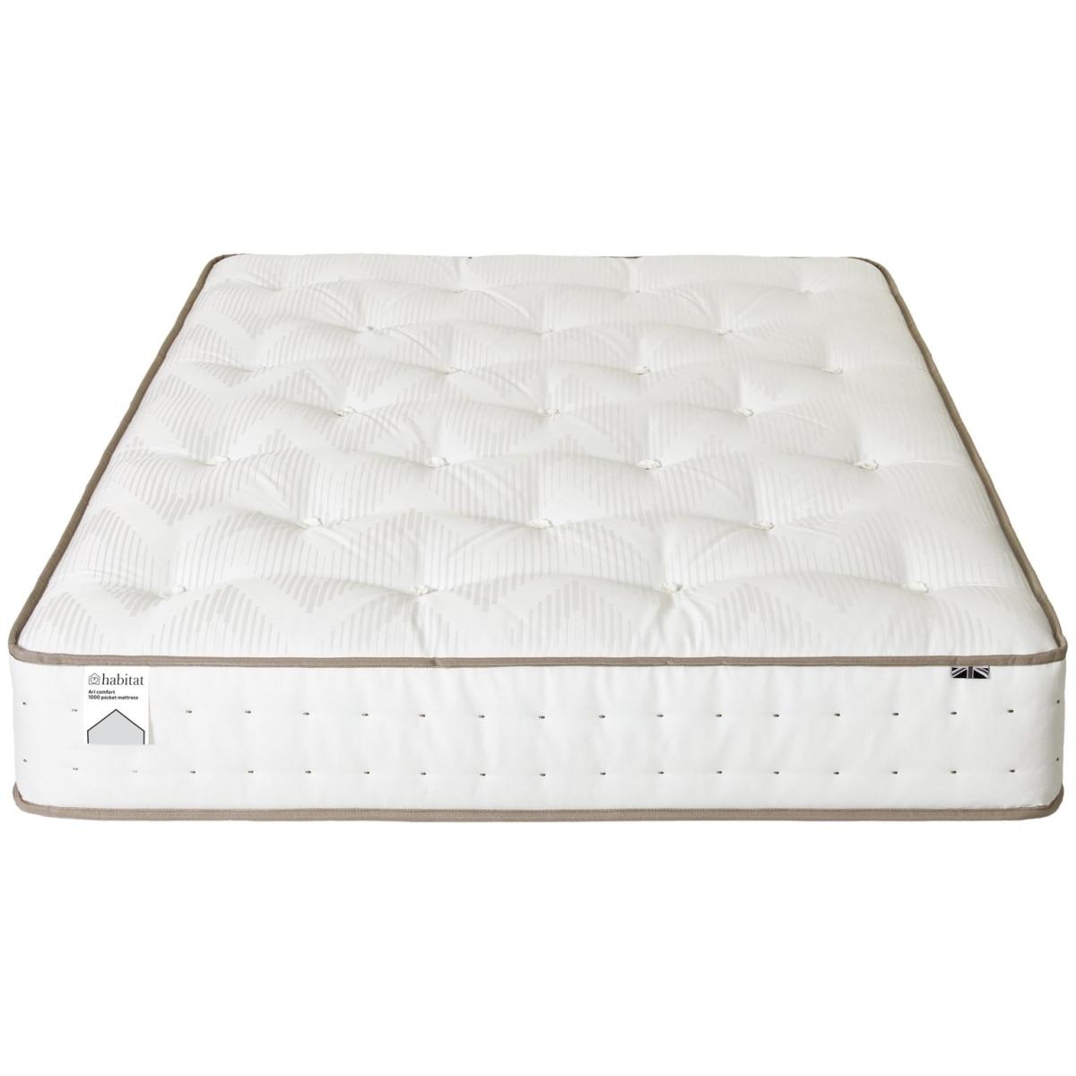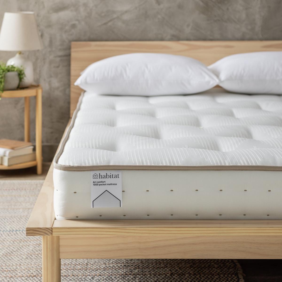 Naturally relaxing. Certified 100% British wool is the deep hero filling inside our Habitat exclusive Ari mattress. Hypoallergenic and breathable. Foam free and quilted. With a knitted cover and tufted finish, and 1000 individually responsive pocket springs that mellow any movement. No wonder this mattress is called Comfort. Easy to care for. No need to turn this mattress. A simple, regular rotation keeps it in tip top shape. At Argos Home we want you to get the best night's sleep possible, so we offer a 100 night comfort promise on our mattresses. Try your new mattress for up to 100 nights and if you aren't sleeping soundly, we'll offer you an exchange for one that suits you better. Part of the Ari collection. Medium feel. Pocket sprung mattress with 1000 springs. Damask cover with tufted finish. No roll together. Anti allergy. Mattress size W135, L190, D23.5cm. No-turn mattress. Rotate mattress regularly. Made in the UK.