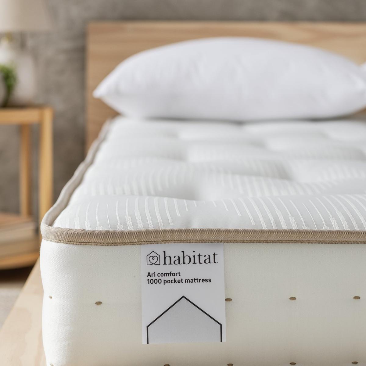Naturally relaxing. Certified 100% British wool is the deep hero filling inside our Habitat exclusive Ari mattress. Hypoallergenic and breathable. Foam free and quilted. With a knitted cover and tufted finish, and 1000 individually responsive pocket springs that mellow any movement. No wonder this mattress is called Comfort. Easy to care for. No need to turn this mattress. A simple, regular rotation keeps it in tip top shape. At Argos Home we want you to get the best night's sleep possible, so we offer a 100 night comfort promise on our mattresses. Try your new mattress for up to 100 nights and if you aren't sleeping soundly, we'll offer you an exchange for one that suits you better. Part of the Ari collection. Medium feel. Pocket sprung mattress with 1000 springs. Damask cover with tufted finish. No roll together. Anti allergy. Mattress size W150, L200, D23.5cm. No-turn mattress. Rotate mattress regularly. Made in the UK.